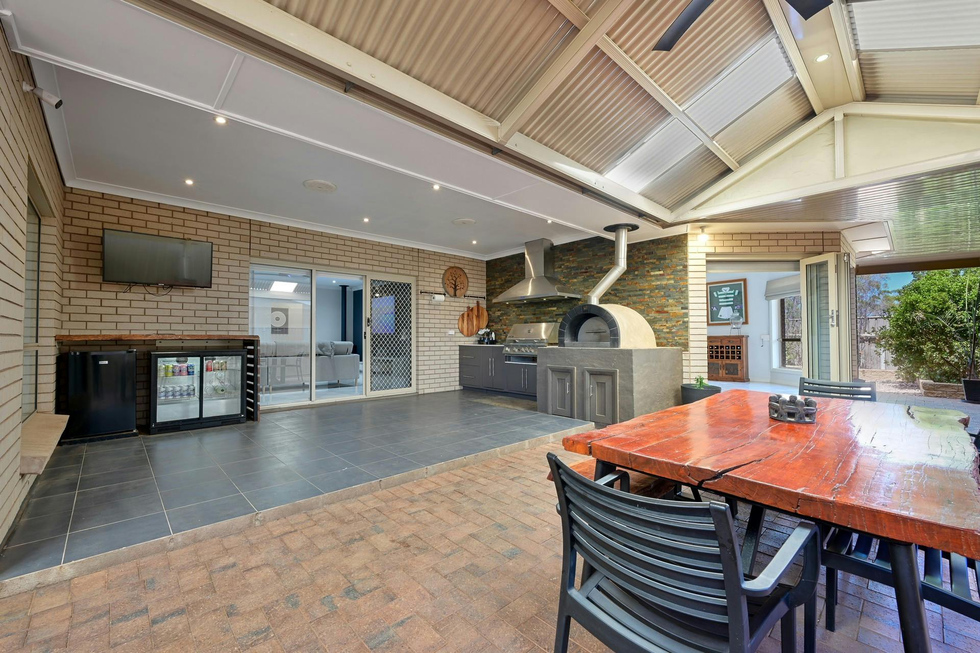 Stunning paved alfresco entertaining featuring a wood-fired pizza oven, built-in mains gas BBQ and kitchenette