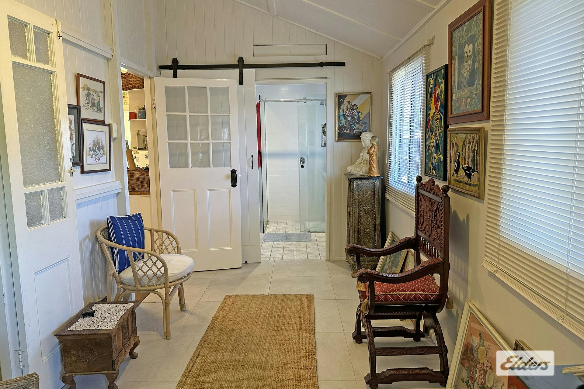 A stylish family bathroom leading out to 2 sleep-out/sunrooms.