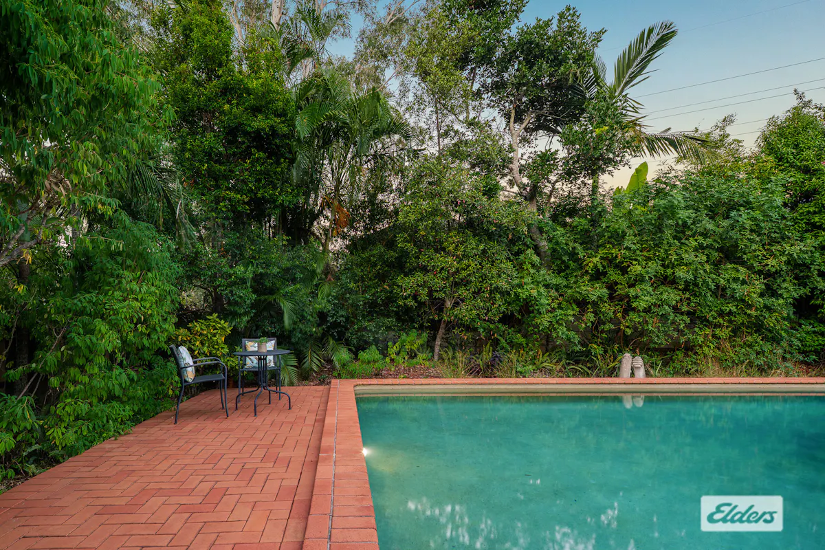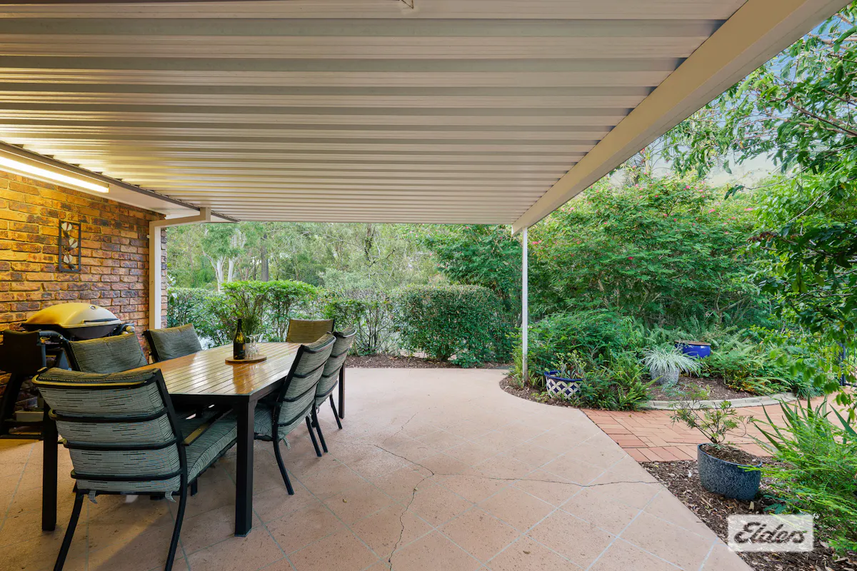 A covered entertaining terrace overlooks lush greenery, an inground saltwater swimming pool and flat grassed spaces perfect for kicking a ball and running amuck!