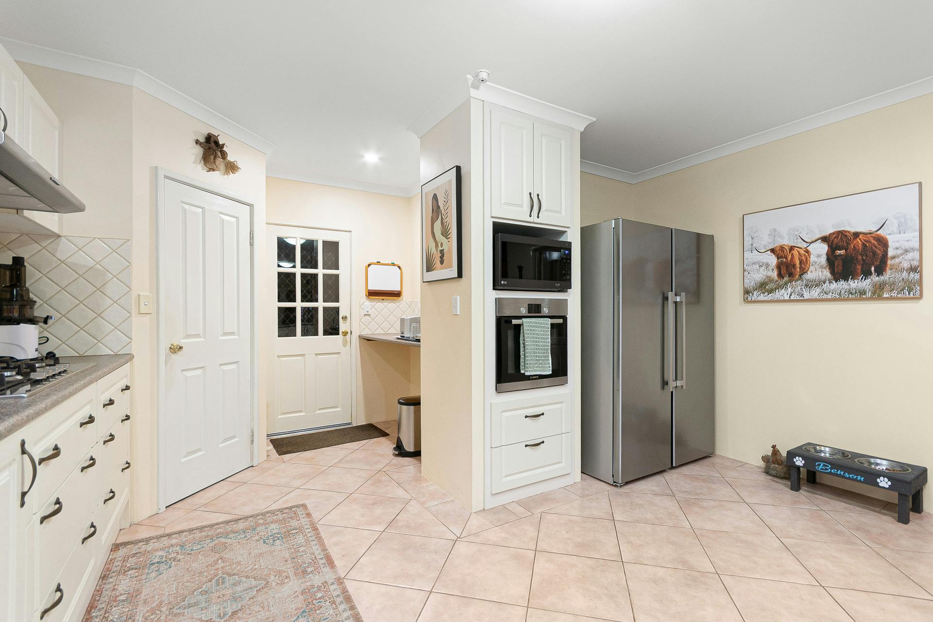 - Spacious kitchen, with a wraparound bench top for breakfast bar dining, an in-built stainless-steel wall oven, gas cooktop and rangehood, with extensive cabinetry and storage and designated recesses for the fridge, microwave and dishwasher