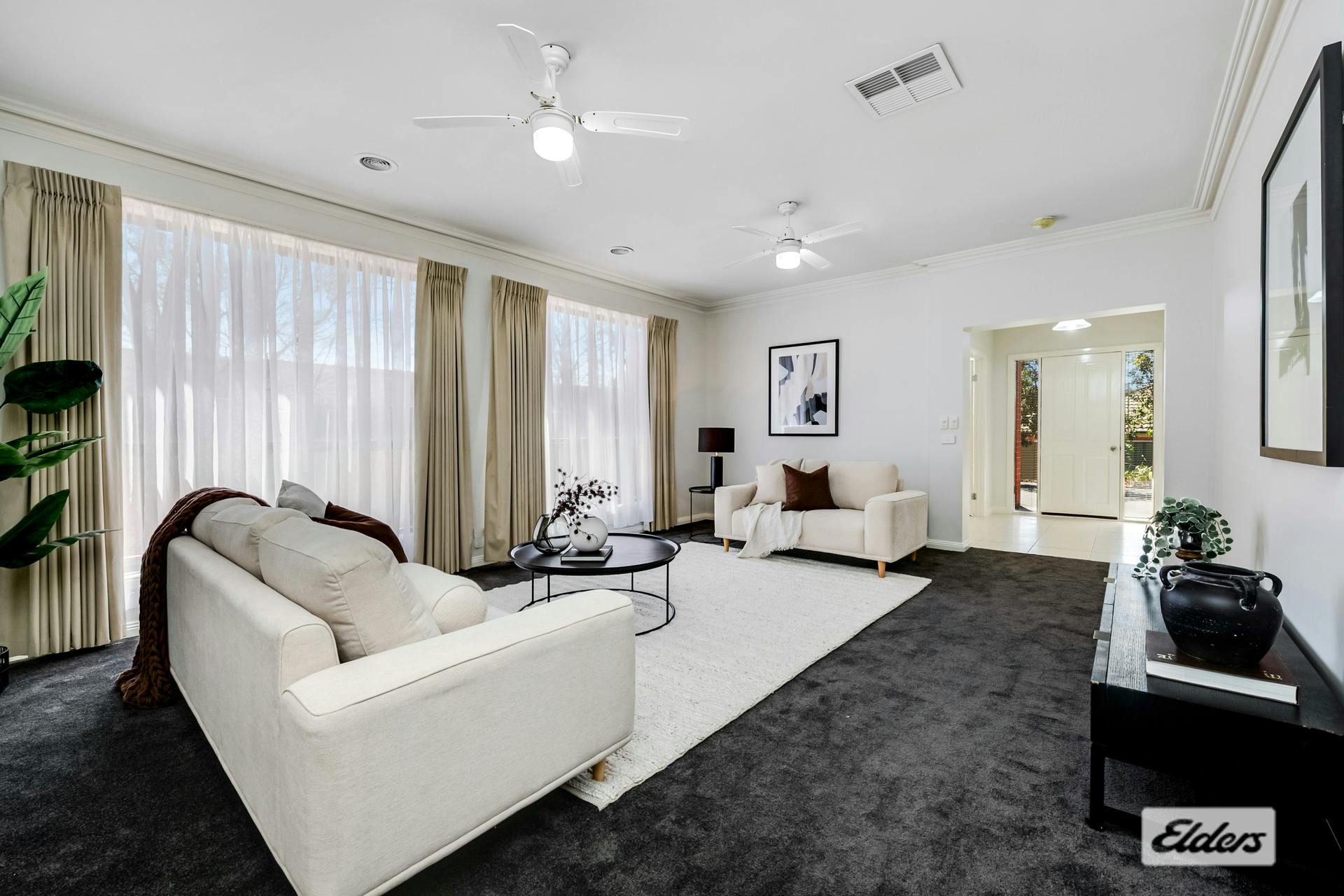 A portico opens into a formal tiled entry, setting the tone for the home's fresh presentation. Direct internal access from the garage into the study enhances everyday convenience. Beyond the beautifully styled interiors, buyers will appreciate the new carpets and the repaint, ensuring the home feels modern, clean and move‑in ready.