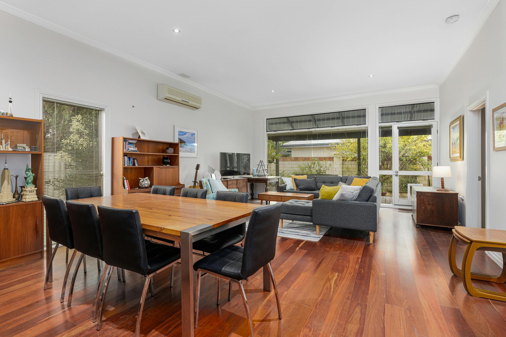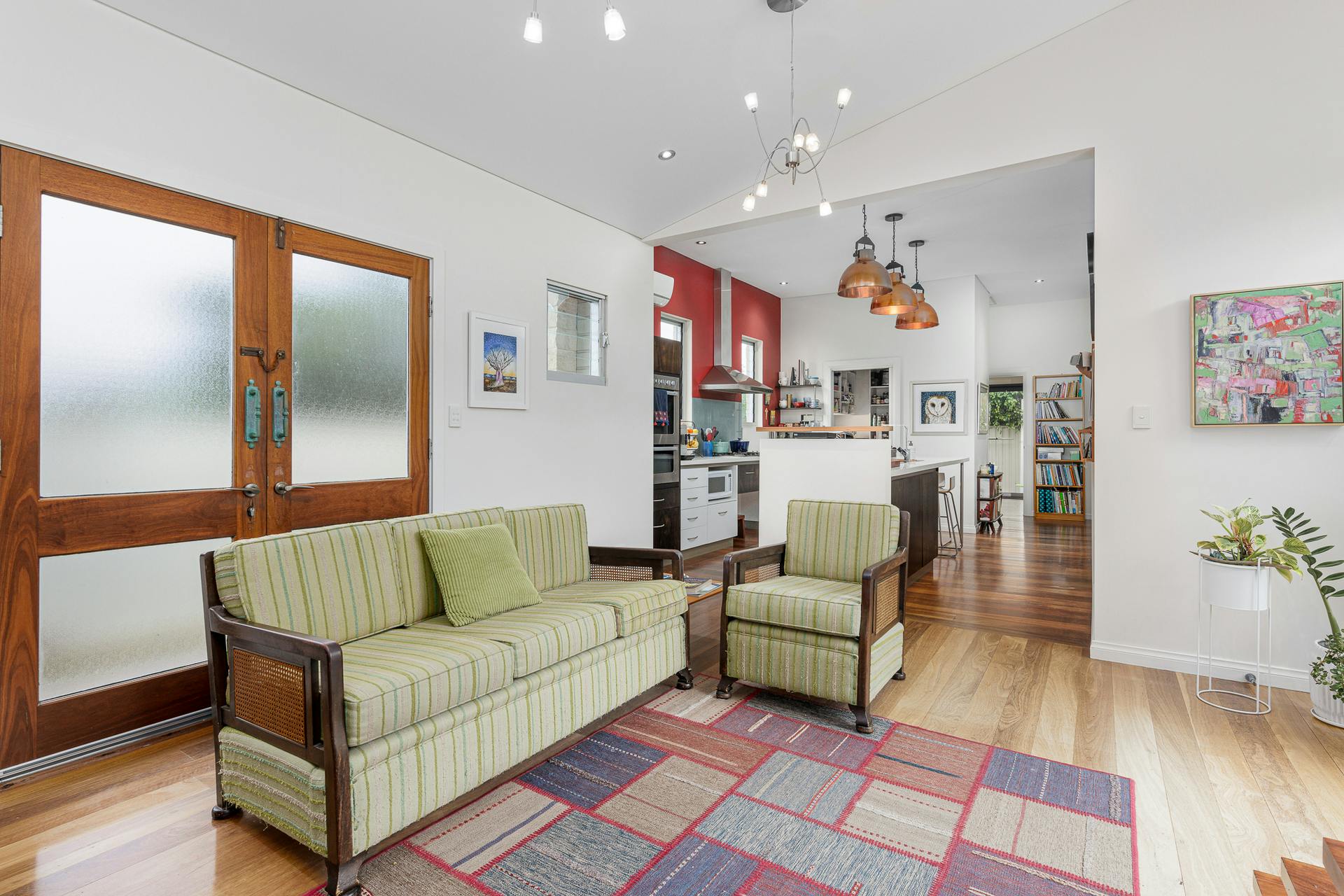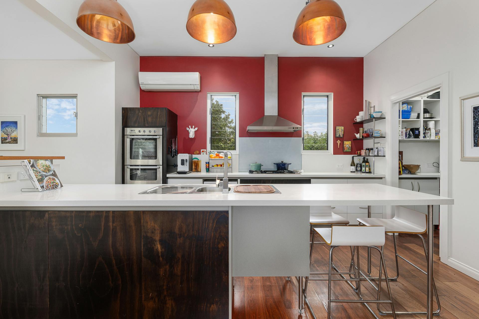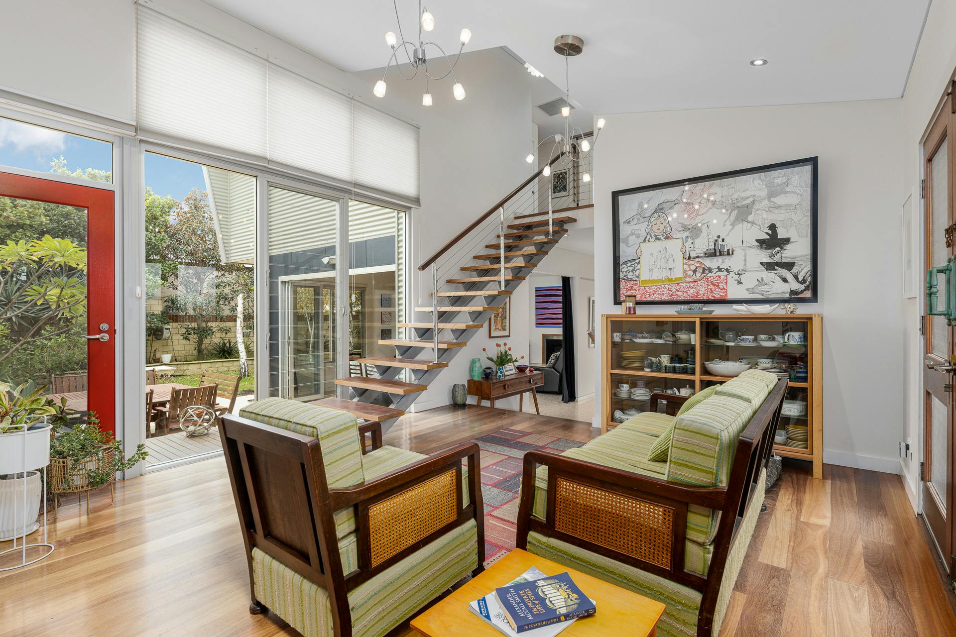 Beyond the bold red front door, the home unfolds with warmth, light, and an effortless sense of space. Jarrah and blackbutt flooring, polished aggregate and quality fixtures and fittings combine to create a refined yet welcoming atmosphere. Stylish, custom-made windows and doors allow remarkable solar access – flooding the interiors with natural light, enhancing timber accents, sleek lines and masterful design elements.