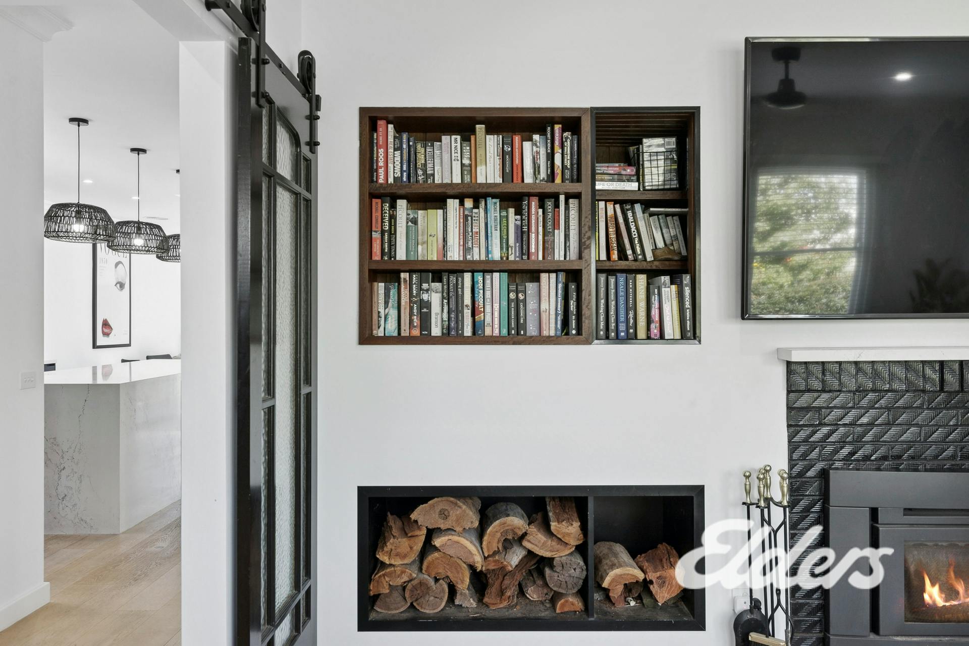 Multiple living zones provide flexibility, including a spacious lounge with a built-in log fireplace and a large home office.
