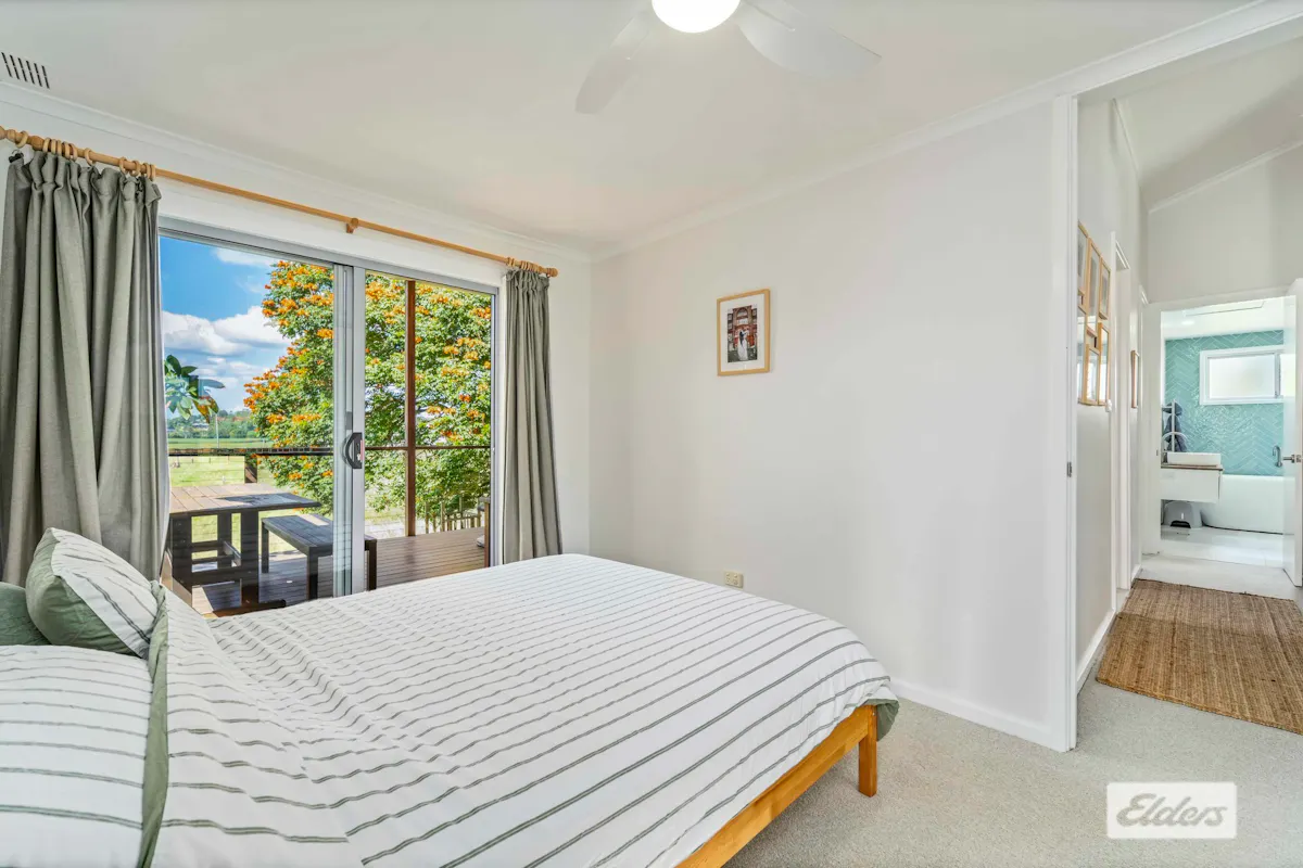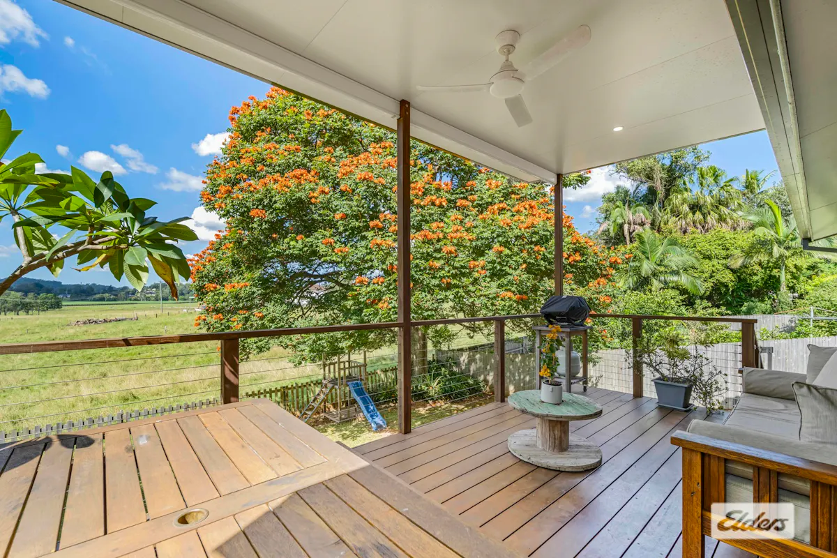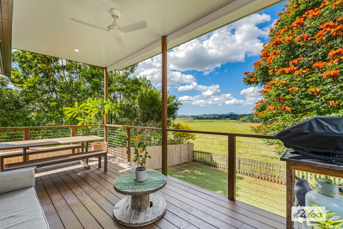 Three beautifully renovated, spacious bedrooms with rural views. Built-in robes and deck access off the master. A modern bathroom, tastefully finished with herringbone tiled feature-wall. A generously sized modern kitchen with American white oak timber bench tops, ample cabinetry and equipped with European appliances - SMEG oven and ceramic cooktop and Bosch extractor fan and dishwasher. The dining room catches cool breezes flowing through the home. The spacious, bright lounge room opens onto the covered porch and large outdoor patio area, surrounded by tropical gardens and lawns with fully fenced front and back yards.