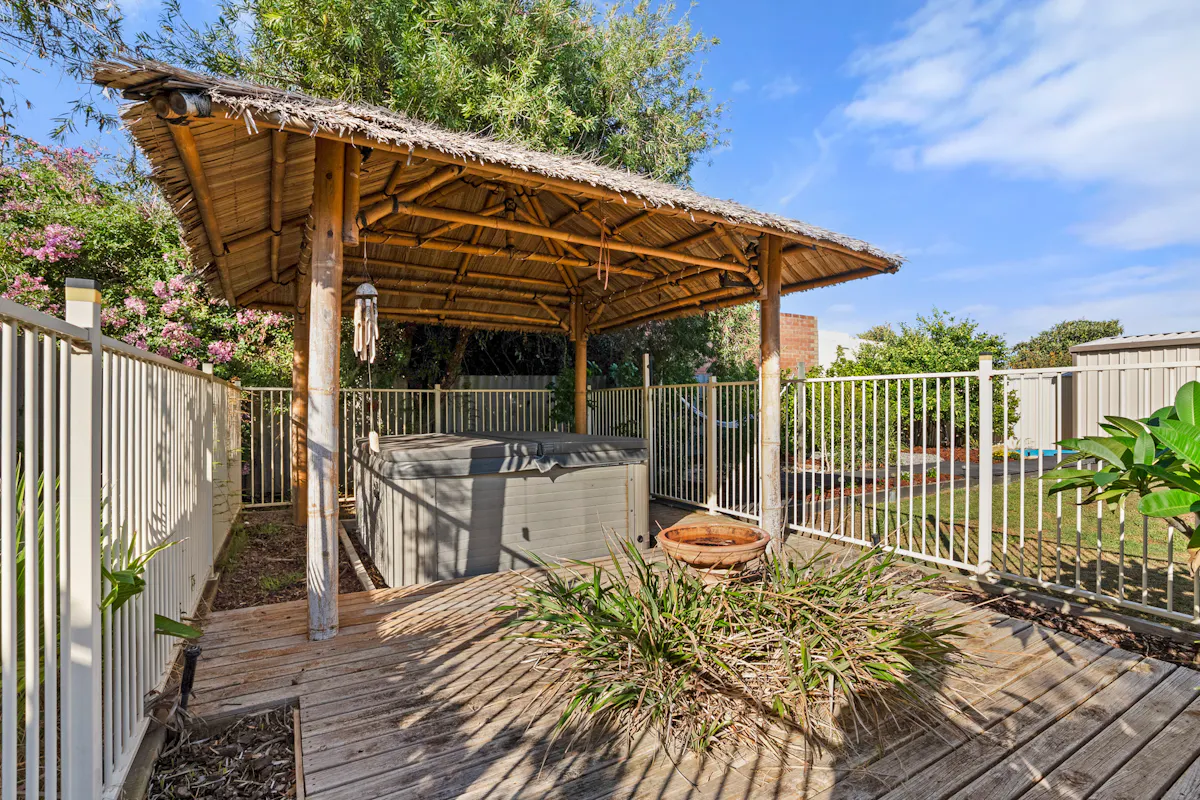 The bedrooms are all placed together for a peaceful setting, with carpet under foot and built-in robes to all, while the master benefits from a reverse cycle air conditioning unit for year round well-being. And the central bathroom has also been renovated, including a large shower with glass screening, a vanity, and storage throughout. Moving to the exterior, you have a lengthy, flat roof patio to the rear of the residence, with paved flooring and plenty of space to gather friends, while your lawned backyard has been carefully landscaped to include a raised and decked platform with garden beds incorporated. A spa bath sits to the side and fully fenced for peace of mind, with a Bali style gazebo and decked surround for a premium space to relax, while your powered workshop is substantially sized with a roller door entry for access.