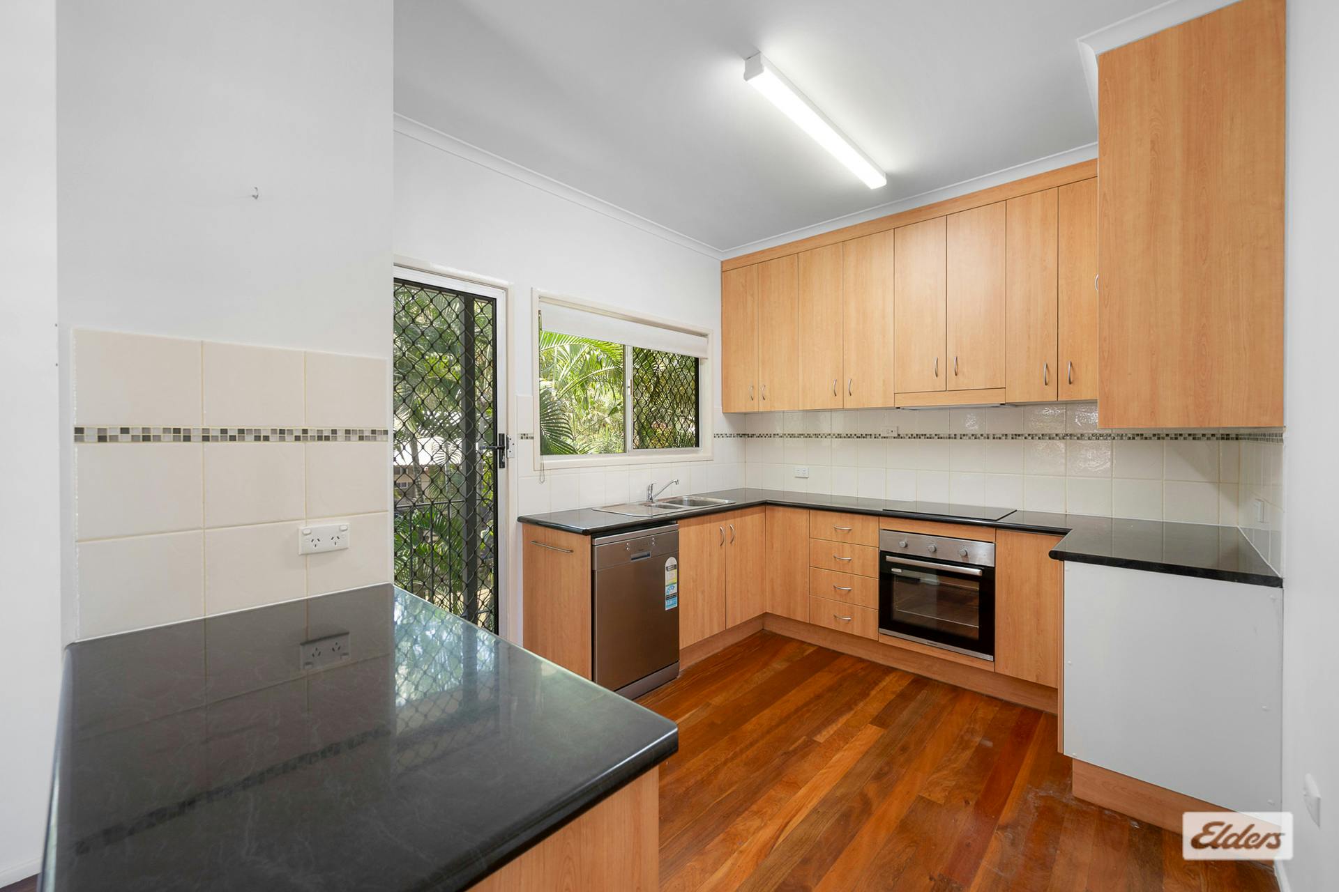 *Kitchen with generous bench space and storage electric stovetop, oven and dishwasher.