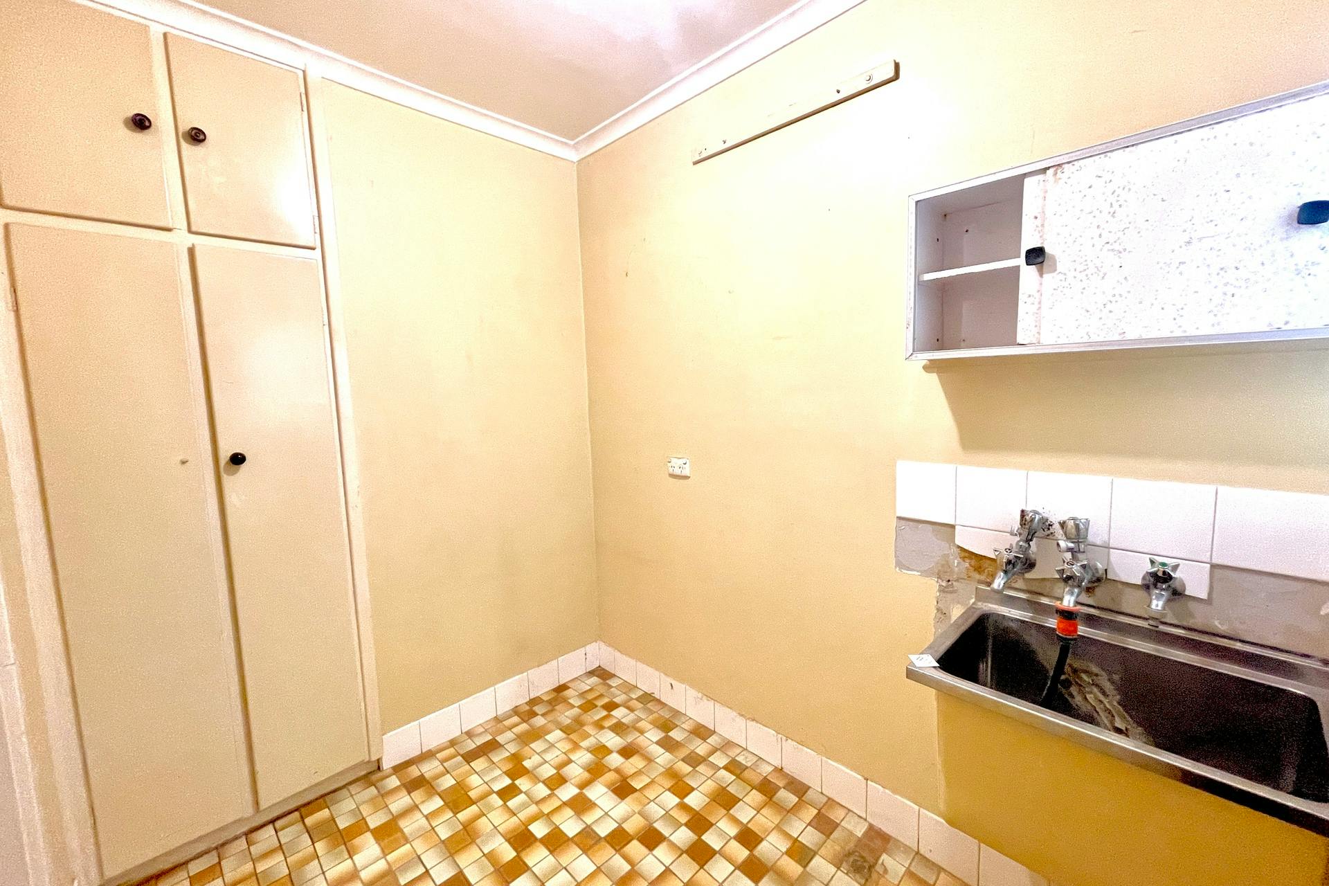 The tiled laundry is practical and well-equipped with a stainless-steel wash trough, overhead wall cabinet, built-in cleaning cupboards, and direct external access to the rear yard.
