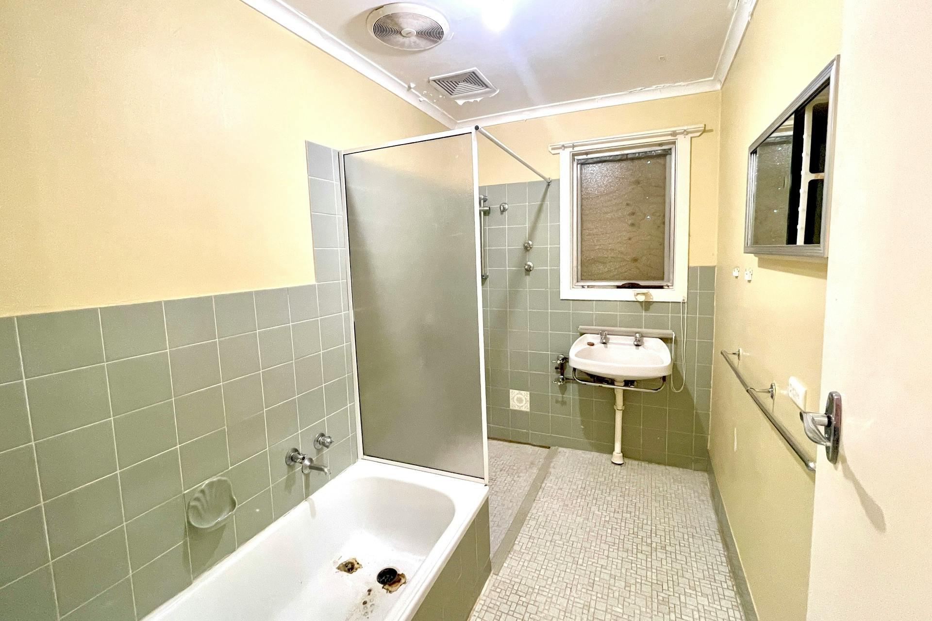 The tiled bathroom includes a shower alcove with glass screen and rail for a shower curtain, hand basin, built-in mirrored cabinet, and exhaust fan. The bath will require repair or replacement, offering another opportunity to update the space to your taste. The toilet is conveniently located separately.