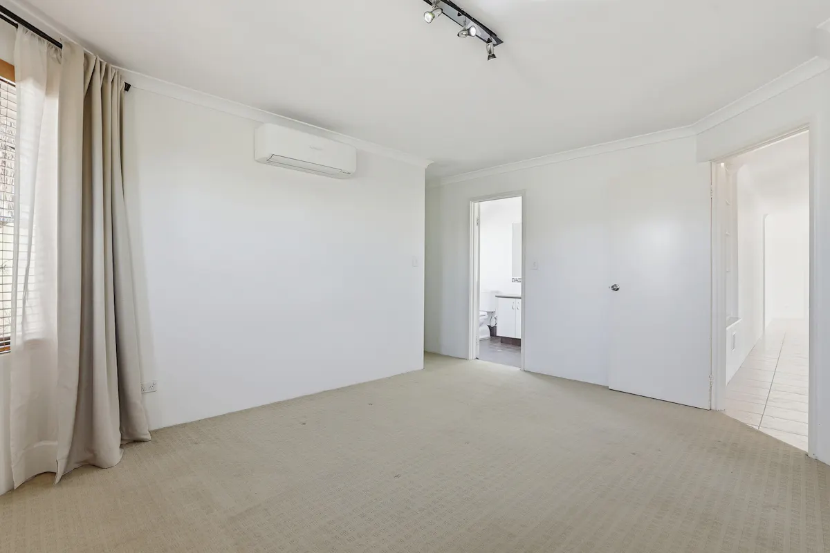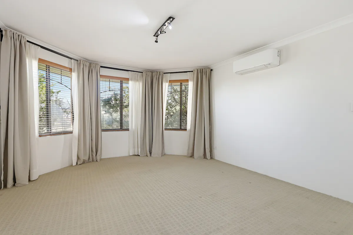 - Spacious master suite to the front of the home, with soft carpet underfoot and a beautiful bay window overlooking the gardens, plus an effective reverse cycle air conditioning unit and large walk-in robe