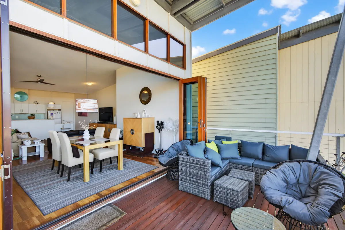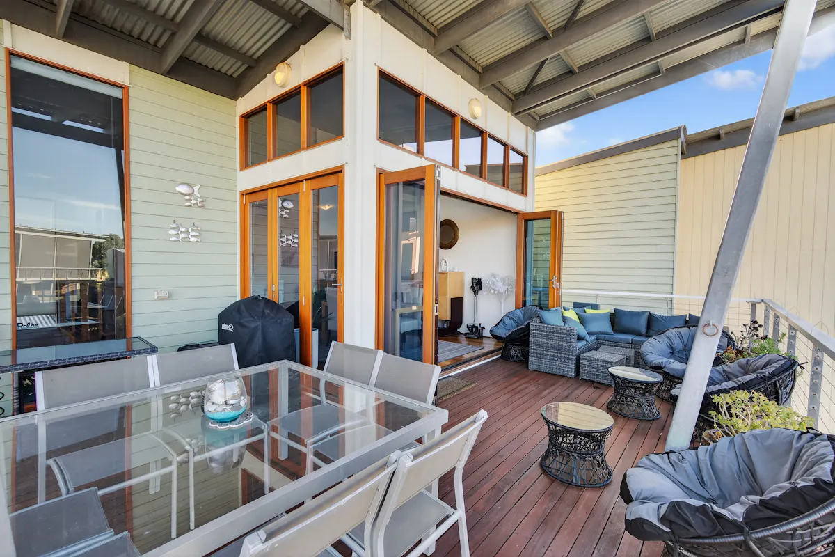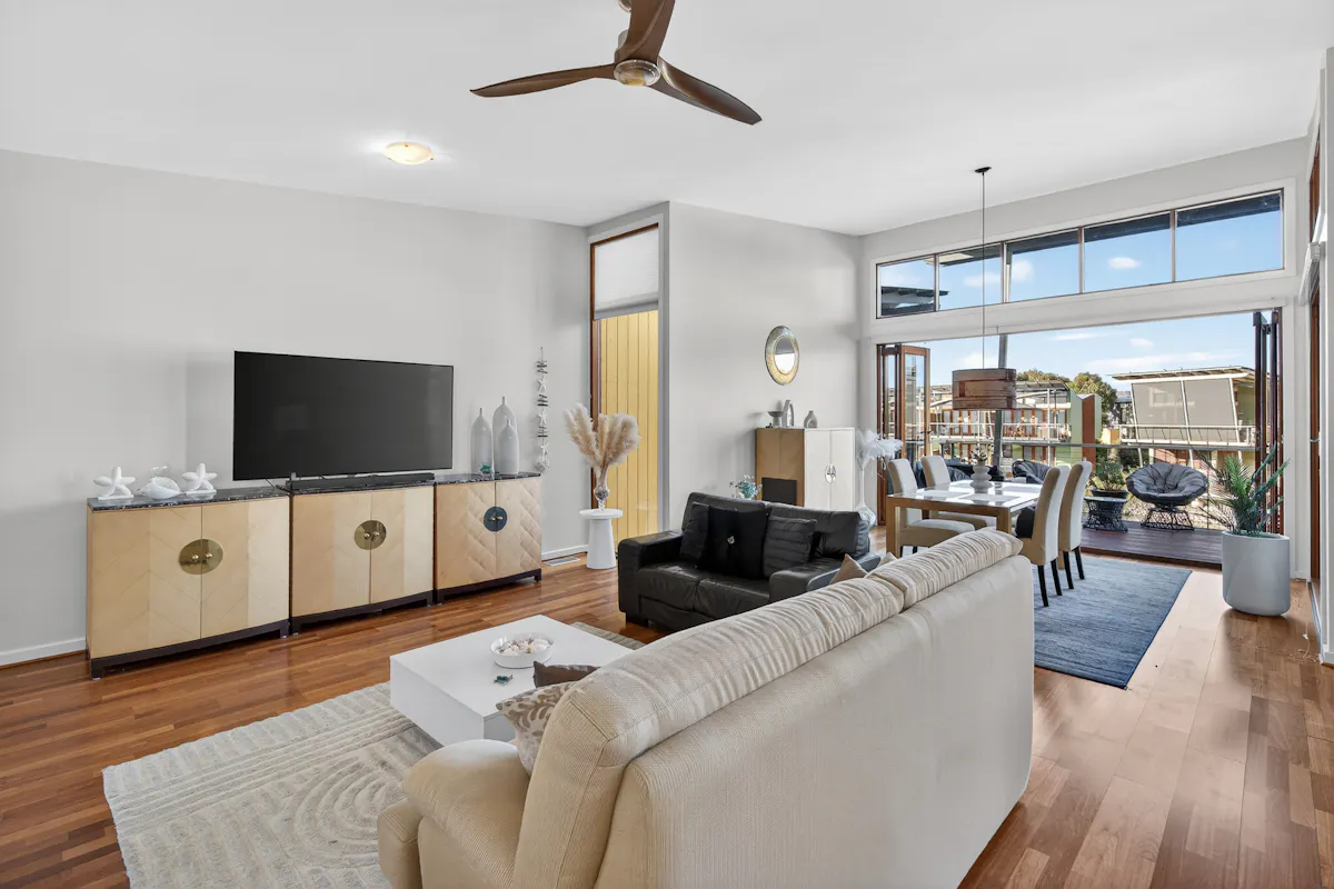 The upper-level living domain is a true centrepiece - elevated, light-filled and seamlessly connected to its surroundings. Striking cedar-framed concertina doors retract completely to reveal an expansive balcony , dissolving the boundary between indoors and out. This architectural feature creates a refined entertaining space, where coastal breezes, water views and natural light become part of everyday living.