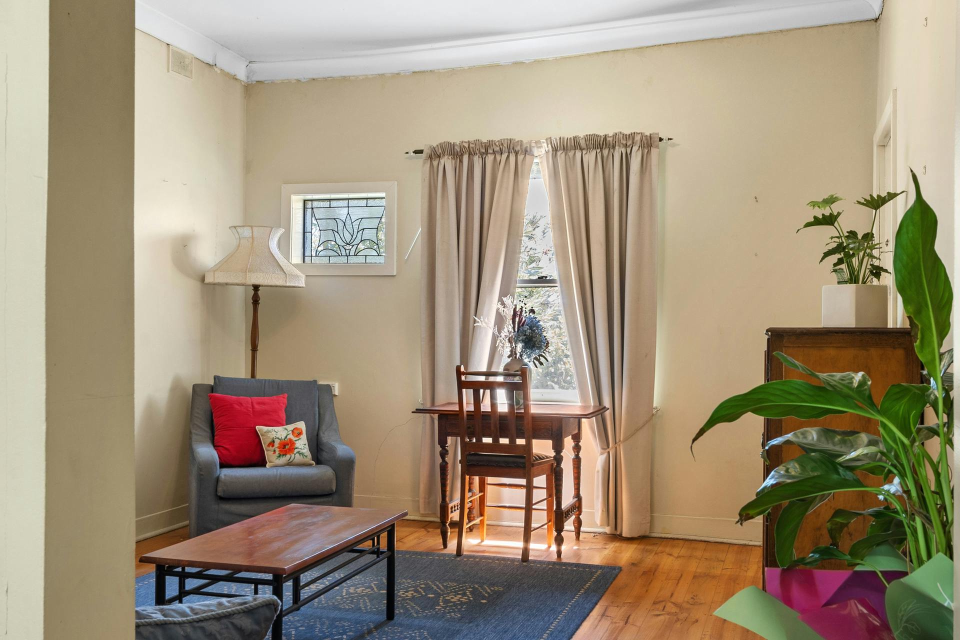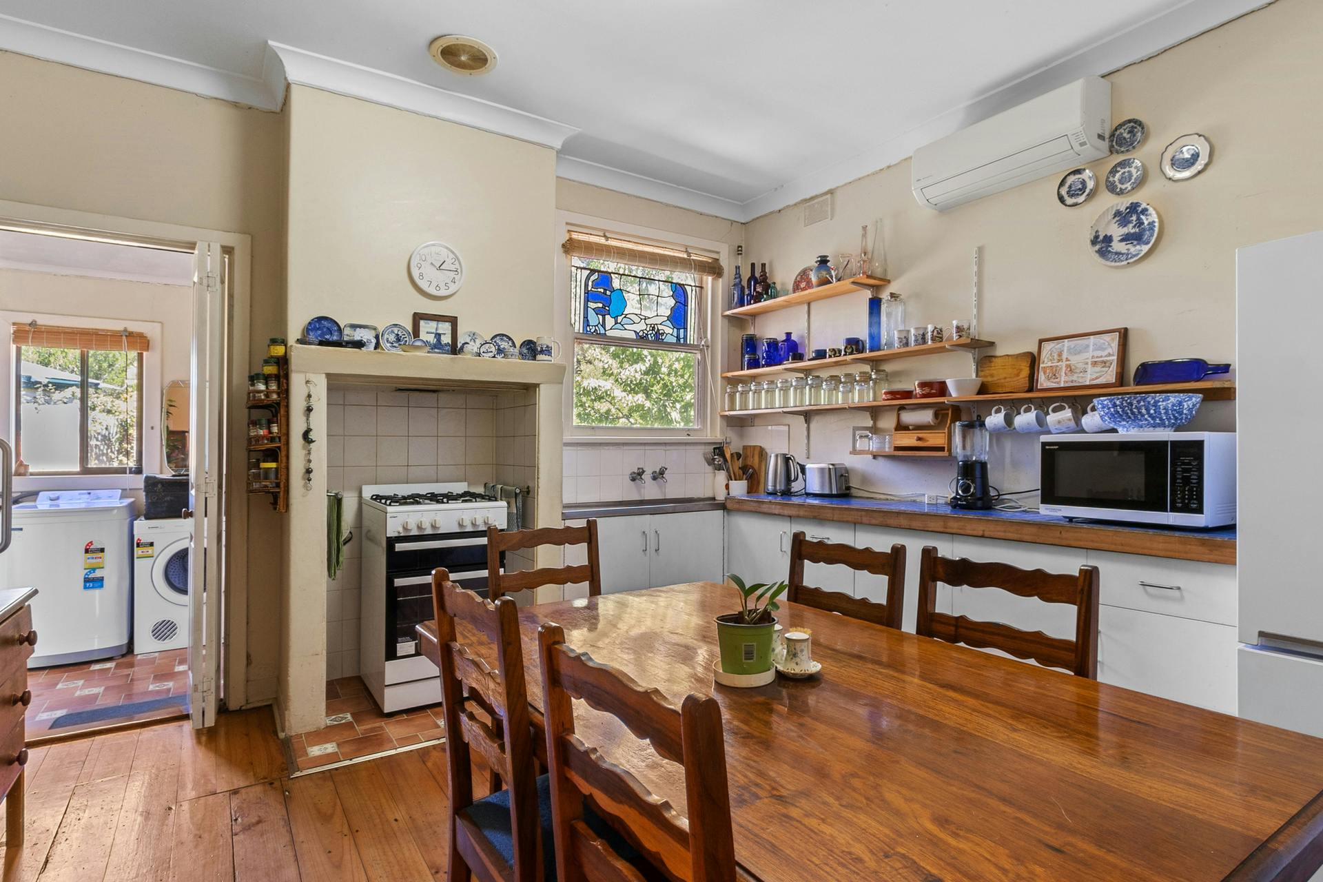 The lounge room is located at the front of the home and features timber floorboards and an open fireplace. The eat-in kitchen includes gas cooktop and oven with mains gas connected, reverse cycle split system, timber flooring and a distinctive blue leadlight window feature.