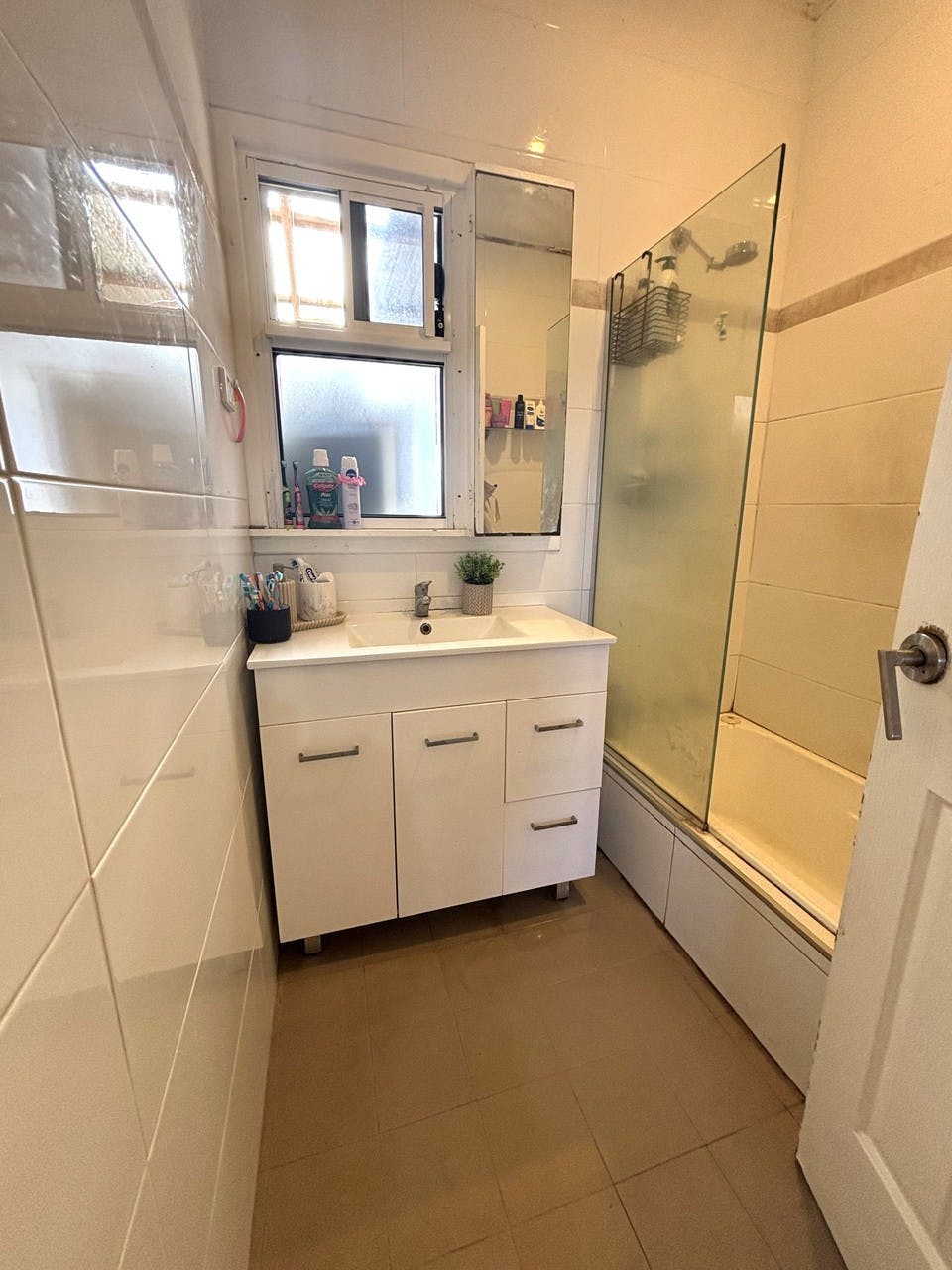 - Bathroom with vanity in good condition and shower over bath