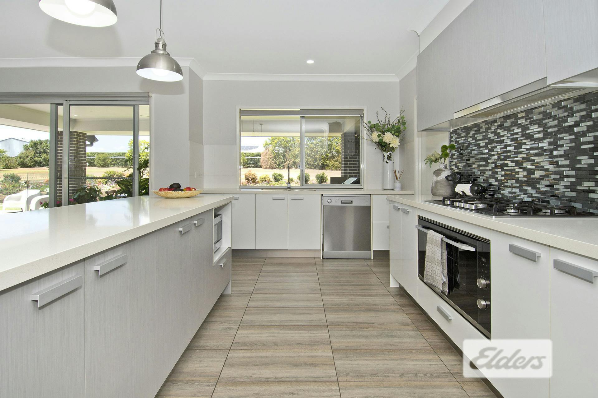 The well-appointed kitchen features a gas cooktop, a large 900mm oven, spacious stone benches, a dishwasher, ample cupboard space, and a large pantry-everything you need for easy family living or entertaining.