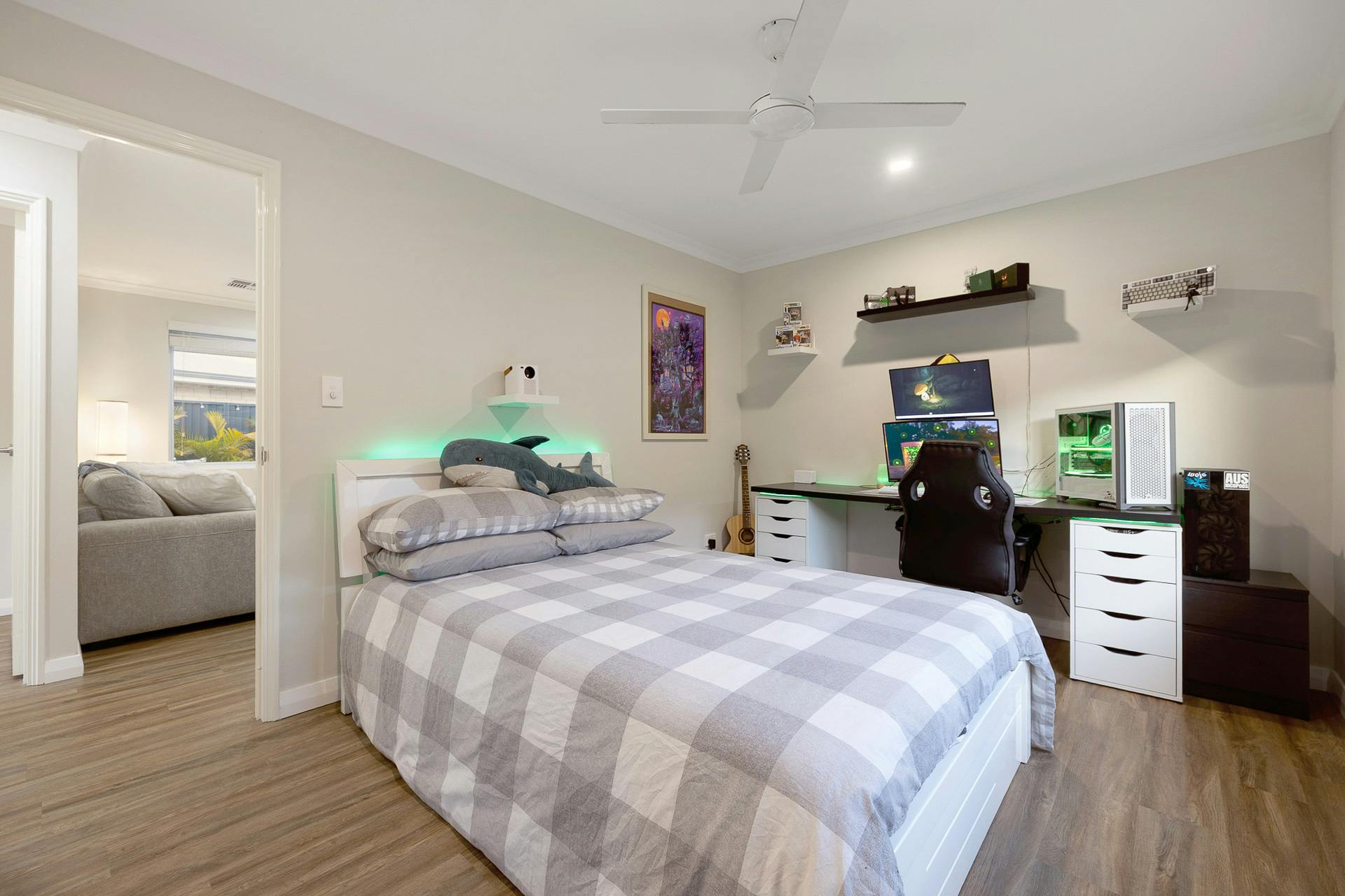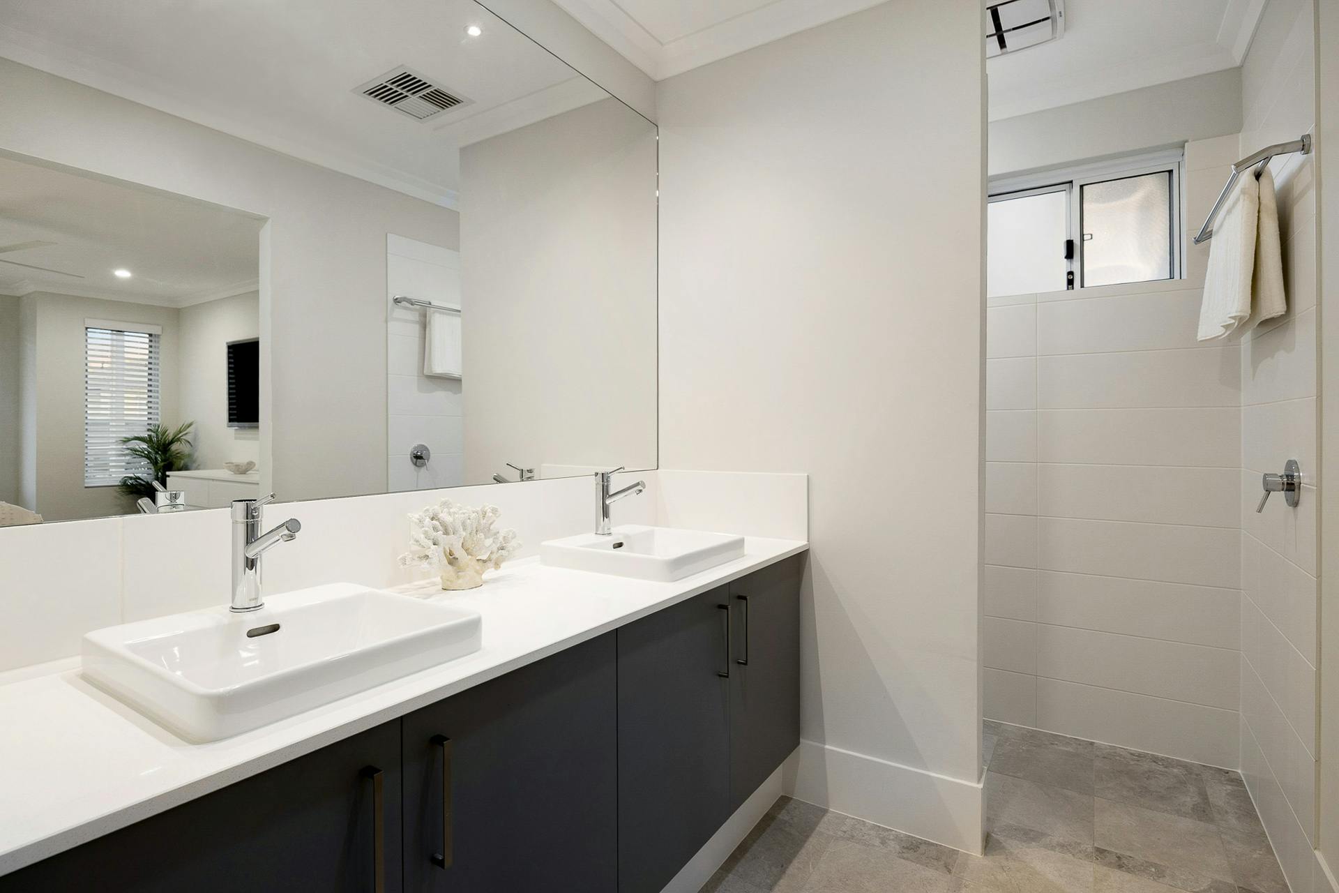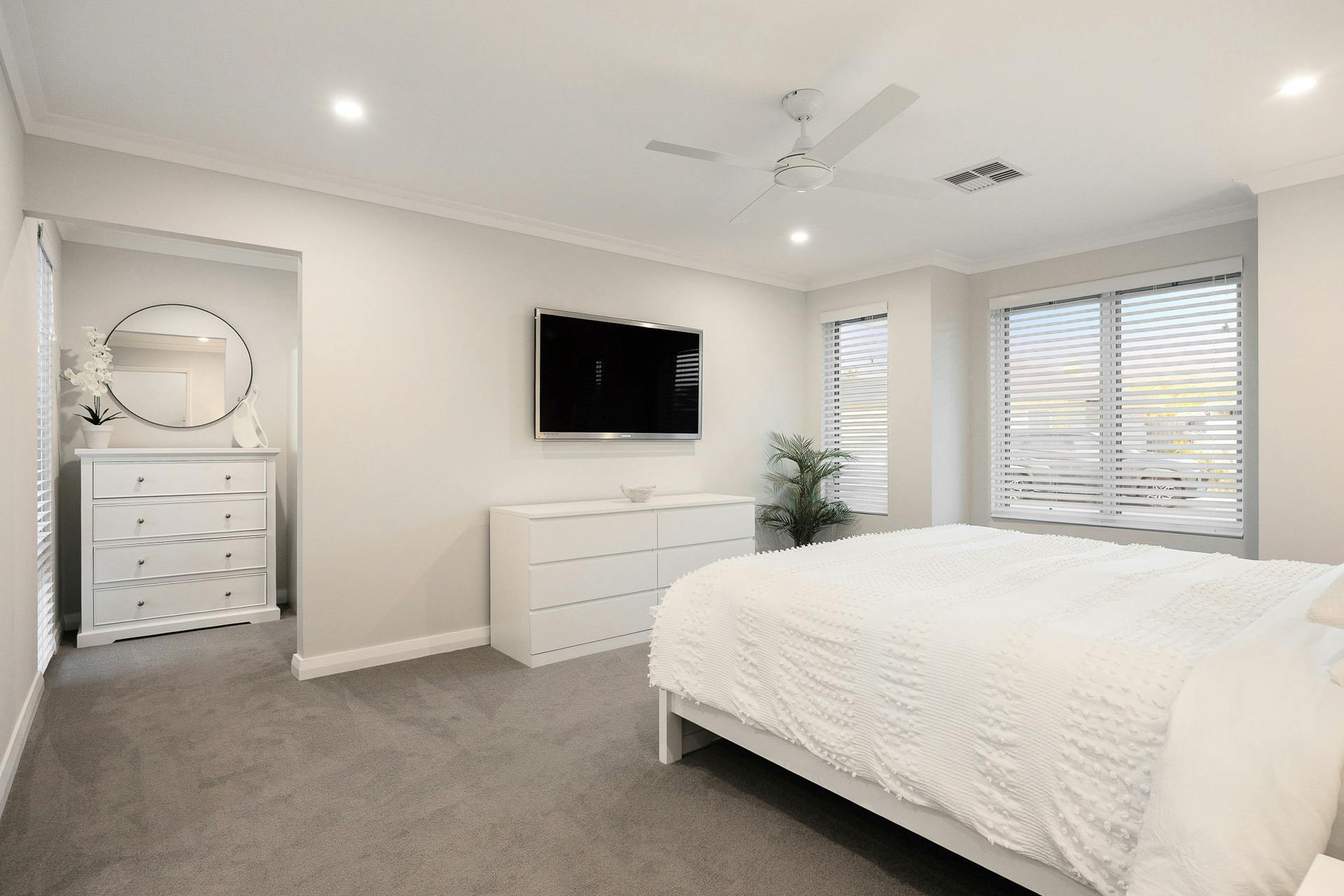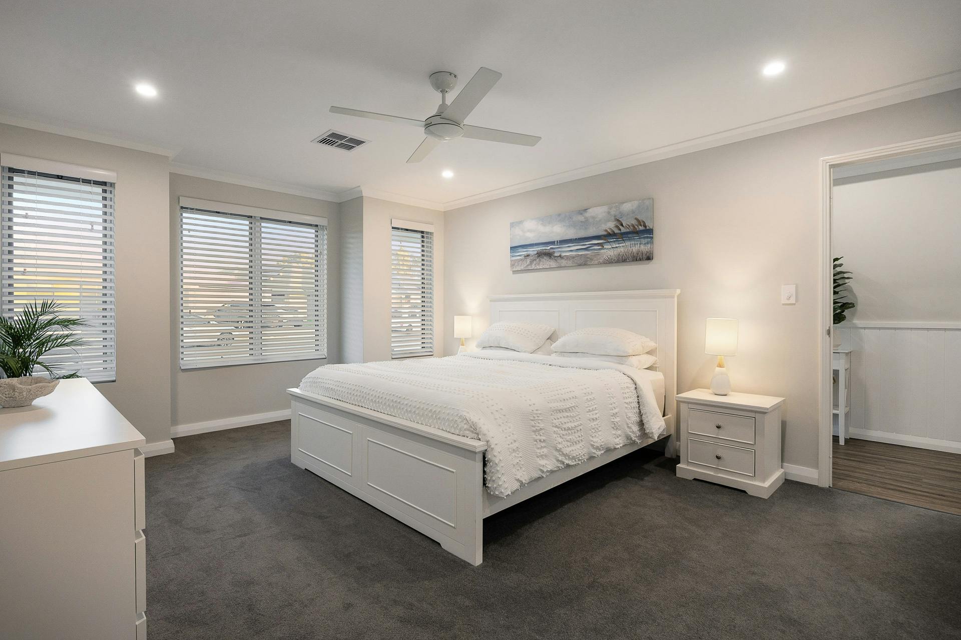 - Generously spaced master suite to the front of the home, with a cooling ceiling fan, large walk-in robe and a luxurious ensuite with a dual vanity, walk-in shower and private WC