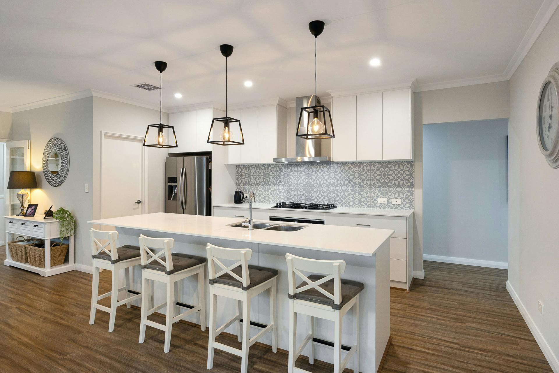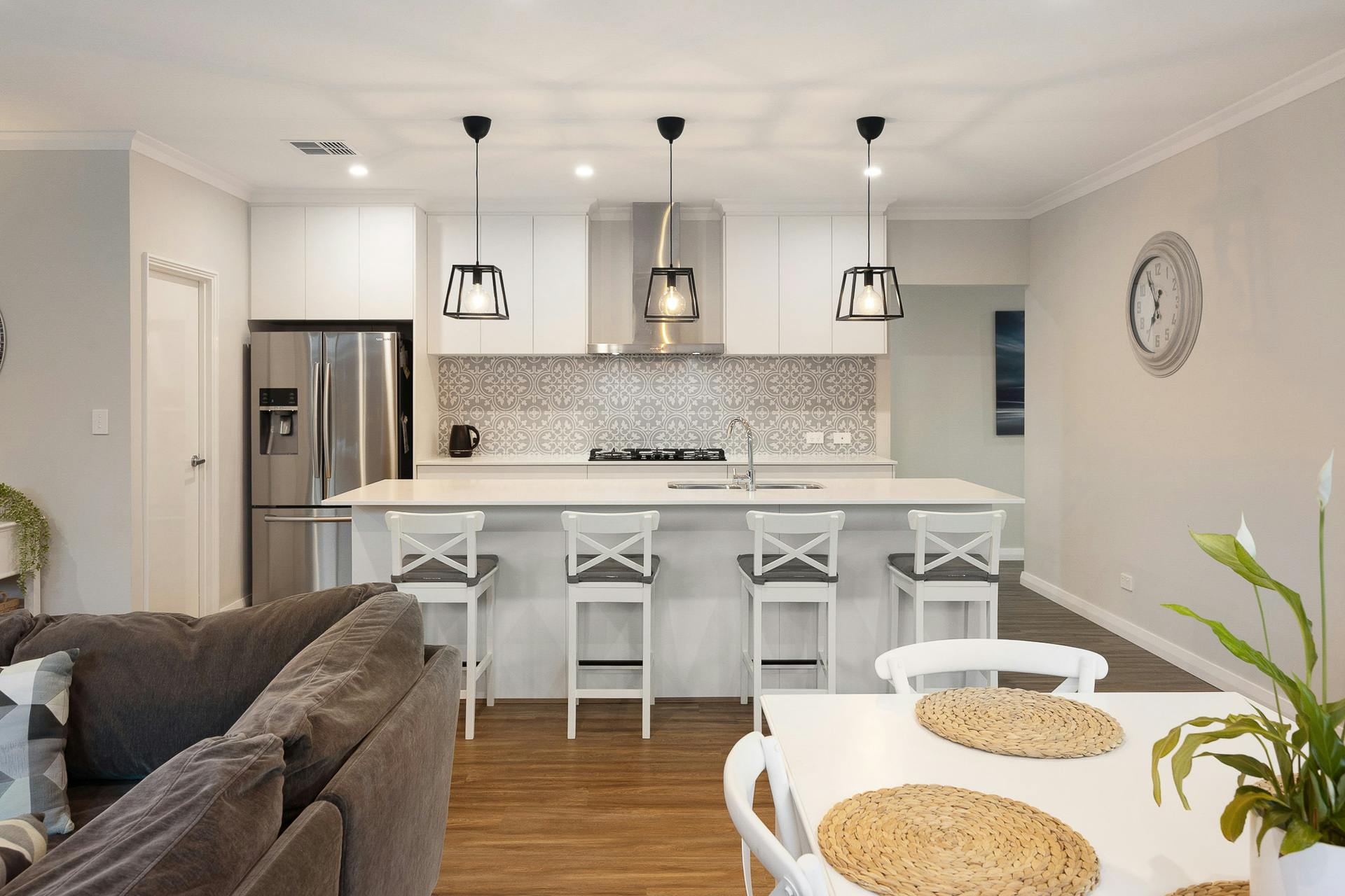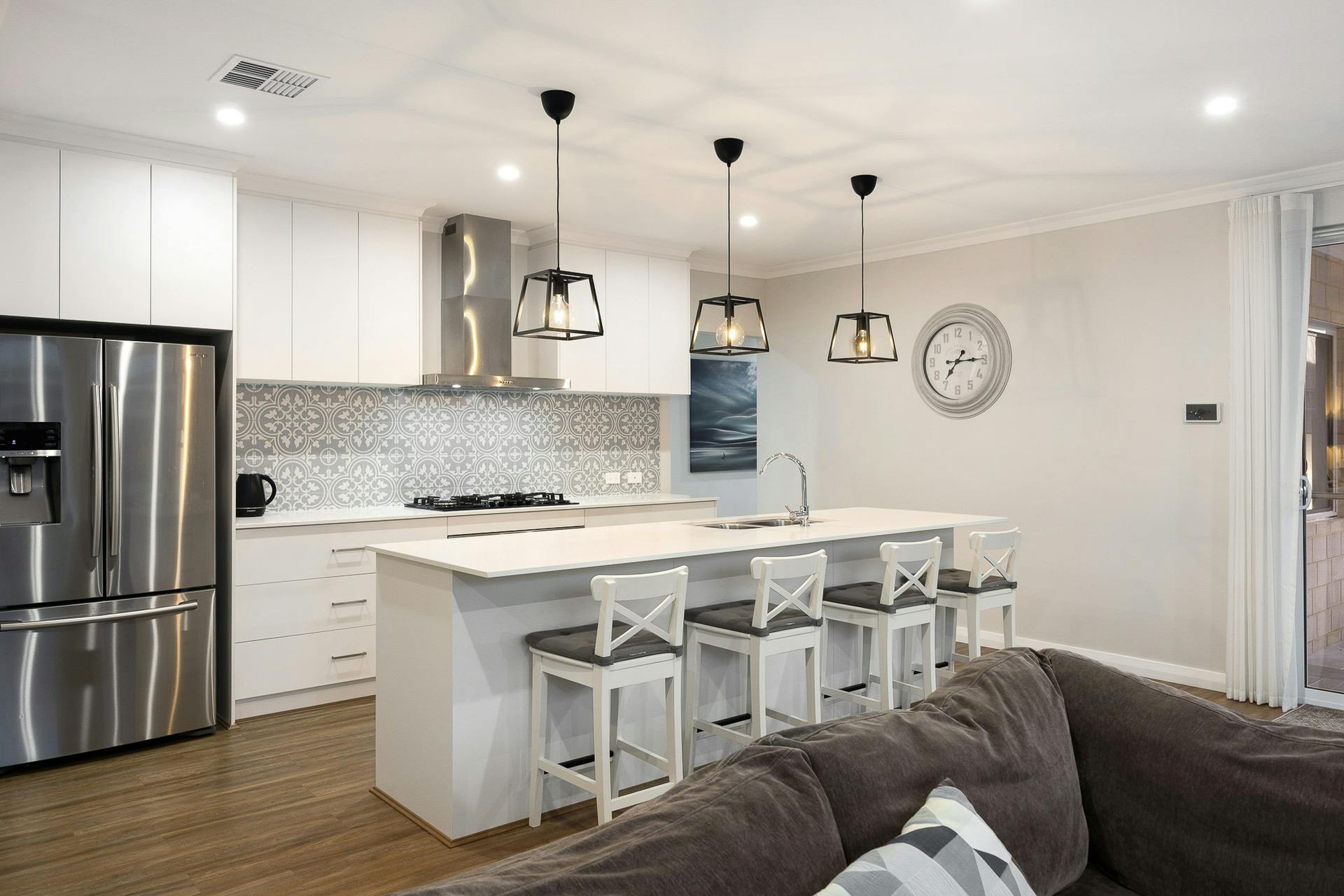 - Centrally placed and contemporary kitchen, with stone benchtops, crisp white cabinetry and in-built 900mm appliances, with a designated recess for the fridge, and a large freestanding island for casual meals or entertaining around