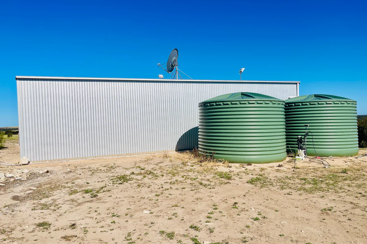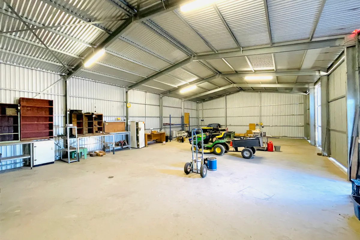 From the rear garden is a 9m x 9m Garage + a 3m side bay equipped with power, fluro lights, concrete floor, shelving and workbenches. Attached in front is a 3 bay 9m x 9m carport with gravel floor and power access. 4 x 5000g, 2 x 2000g, 2 x 1000g tanks supply the property with water. However, mains water is accessible from back corner paddock, if required.