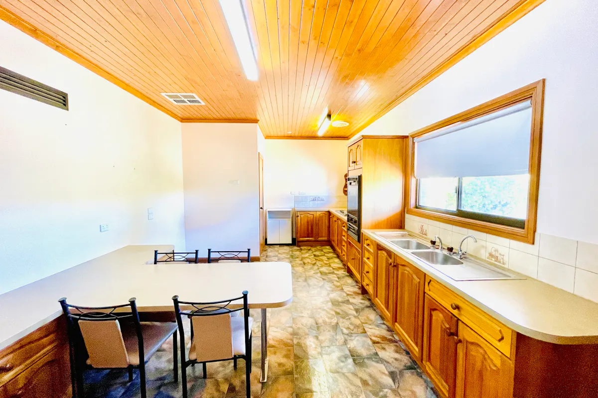 The home is located down a long driveway on a rise towards the rear of the block. Made of weatherboard the home consists of 3 good sized bedrooms all with carpet and ceiling fans. The main has reverse cycle air conditioning, walk-through double-sided robes into an ensuite with glass shower alcove, vanity, wall mirror, toilet, heat lights and exhaust fan. The large open spaced L shaped lounge, dining, family room which also has enough room for an office has a wood combustion heater, bar with a polished wooden bench top, 2 ceiling fans with a stylish wood panel ceiling, also installed in the kitchen.