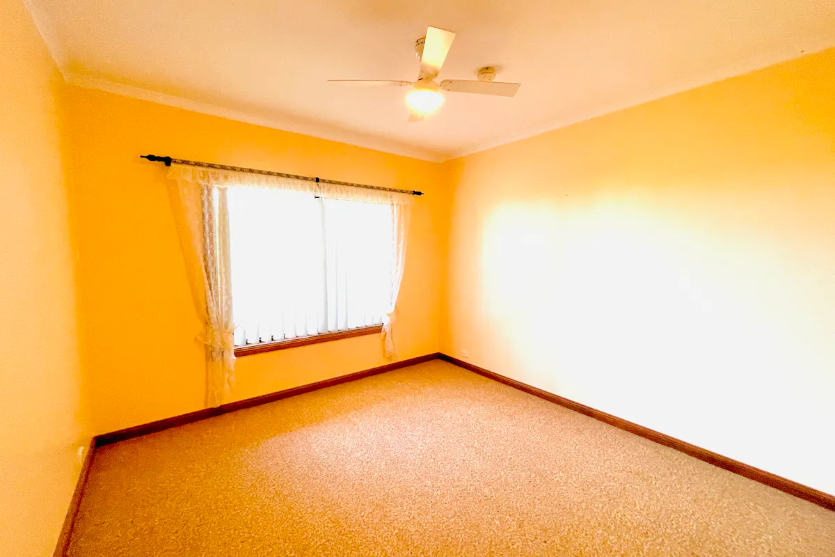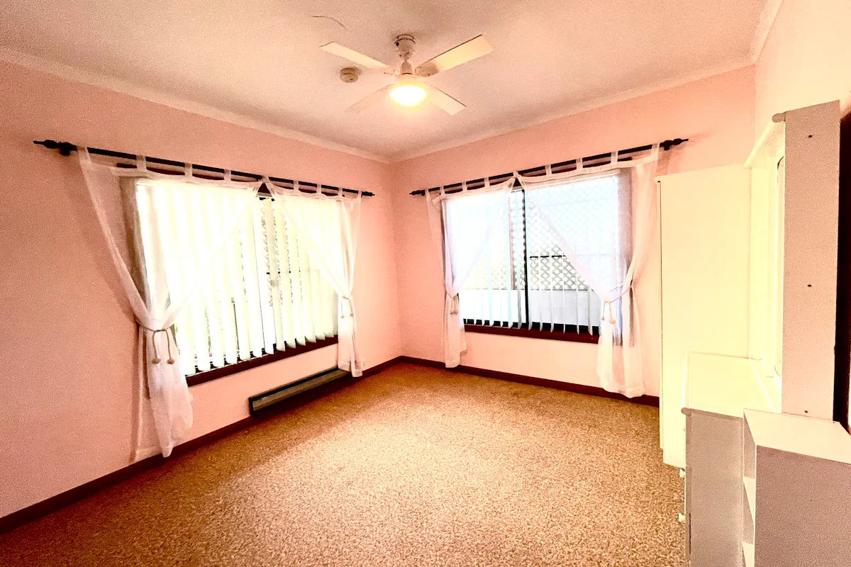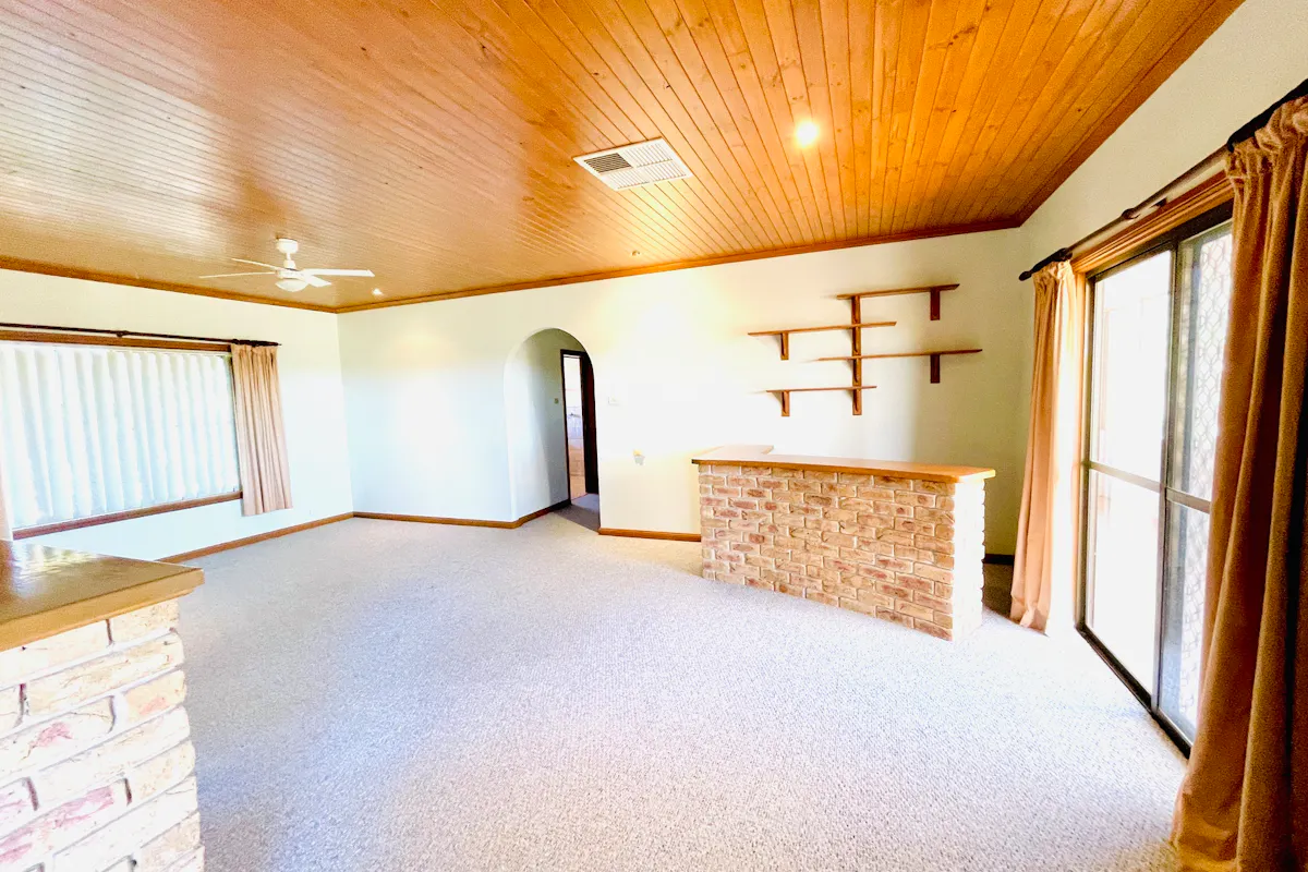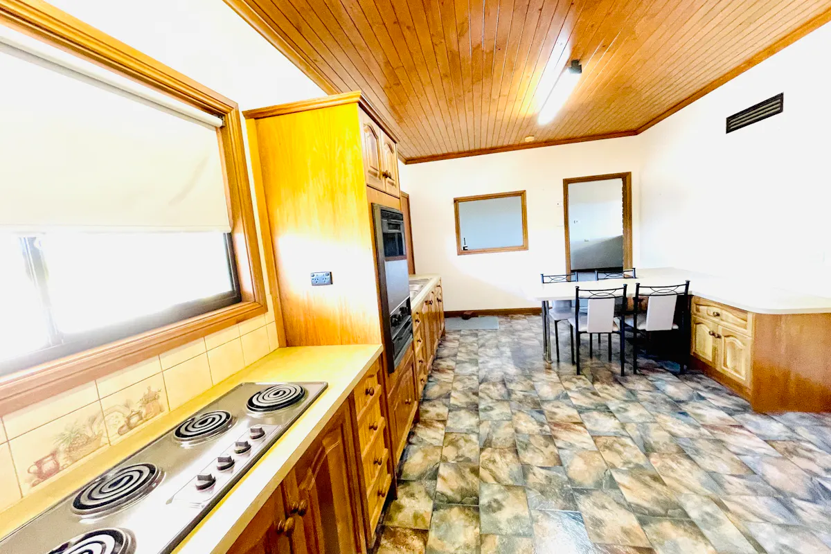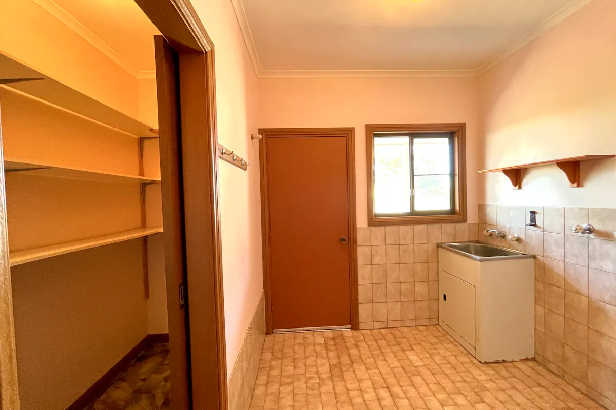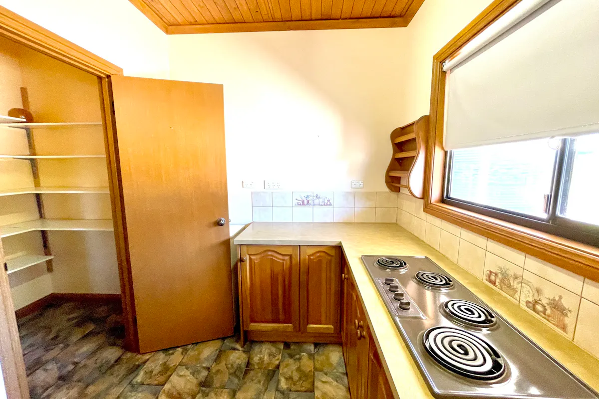 The kitchen has a vinyl floor, double sink, electric wall oven and grill, electric bench top coil elements, ample cupboards and draws, walk-in pantry and a rounded breakfast island. The main bathroom has a corner shower alcove with shower curtain, vanity, built-in bath, wall mirror, 4 heat lights, exhaust fan & light and the toilet is separate. The tiled laundry has washing machine taps, a large walk-in linen/store room with shelving and external access. The short passage houses a fixed bookshelf.