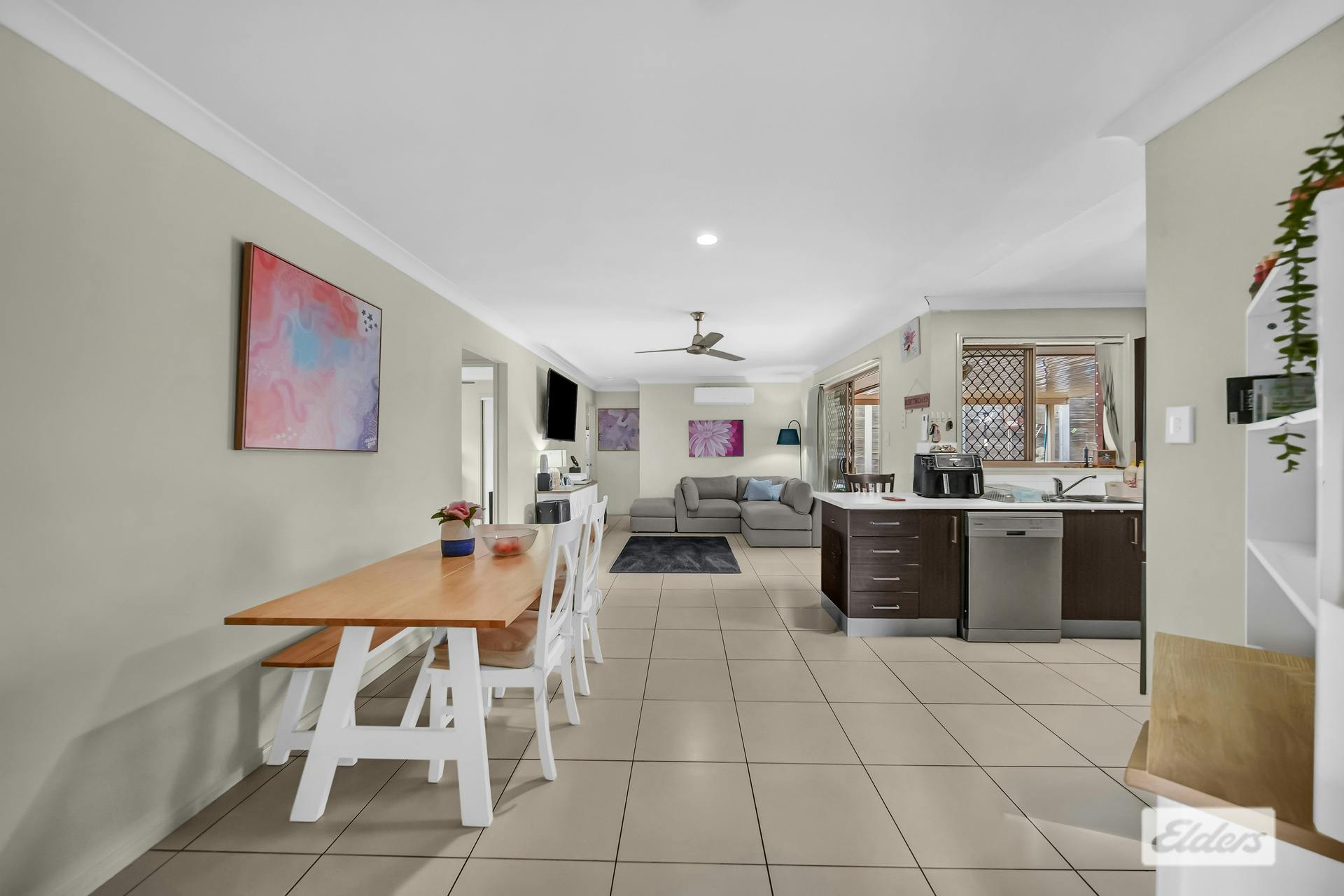 Multiple living areas provide flexibility for modern families, with a formal lounge positioned at the front of the home and a spacious tiled open plan living and dining area forming the heart of the property, complete with air conditioning for year round comfort.