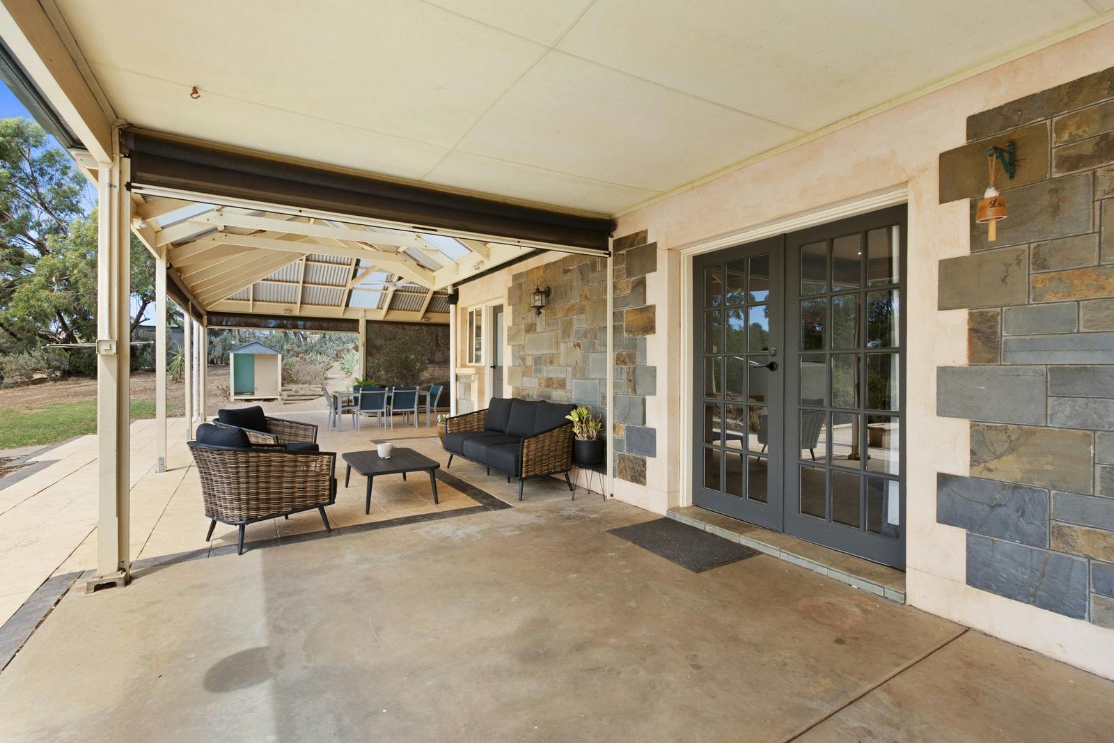 • East-facing undercover outdoor entertaining area with sandstone paving and Ziptrak blinds, capturing sweeping views over Clare and beyond