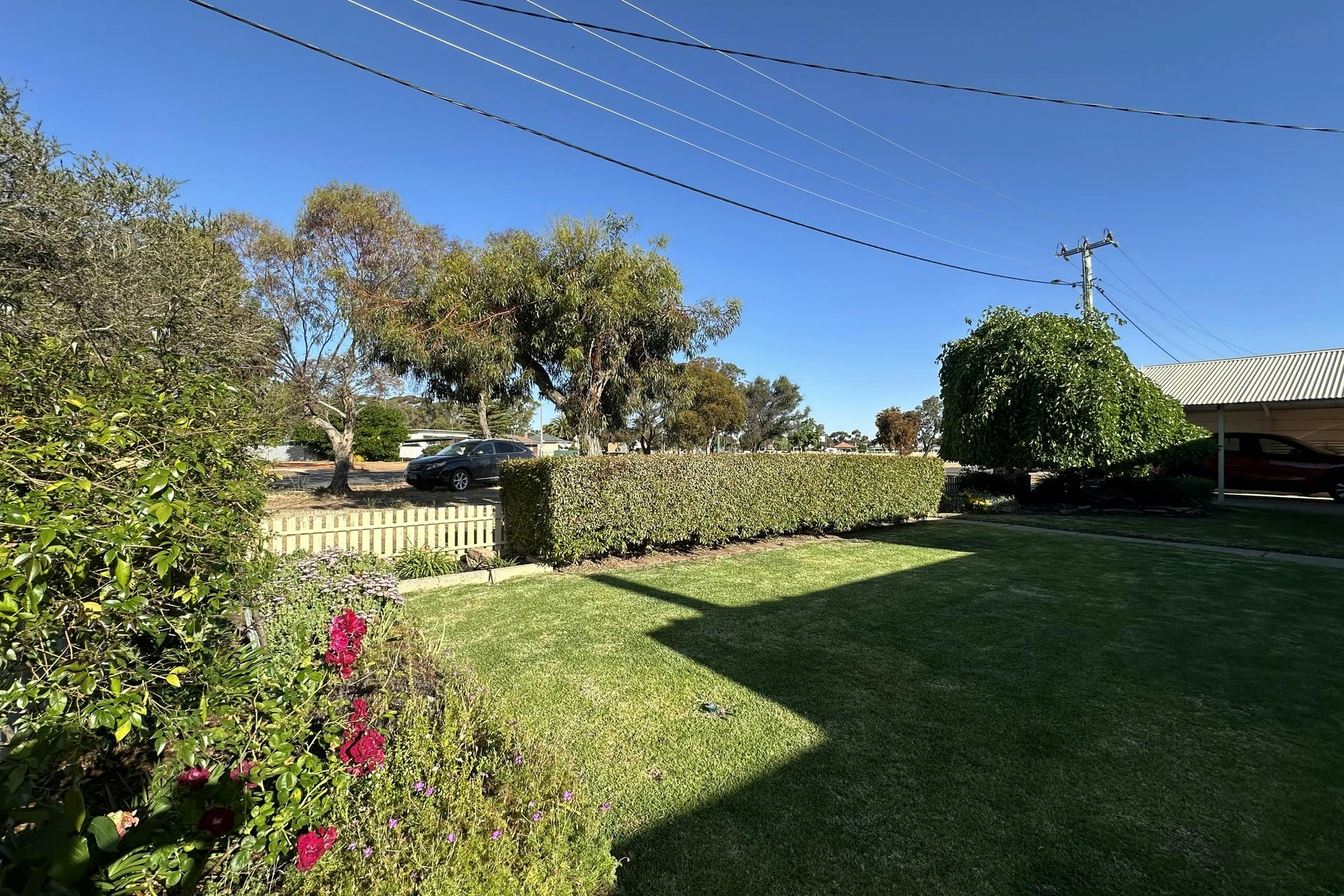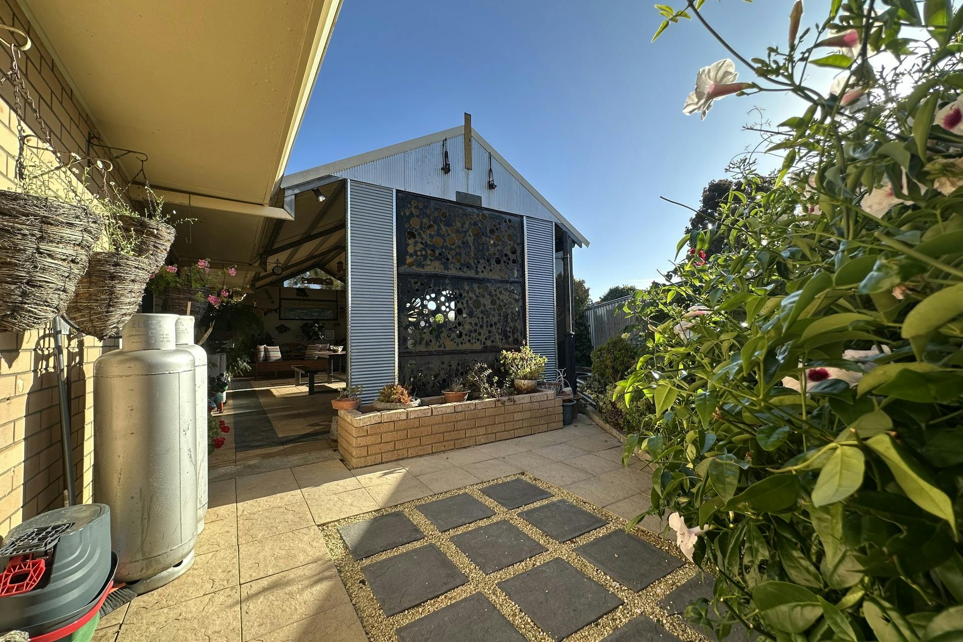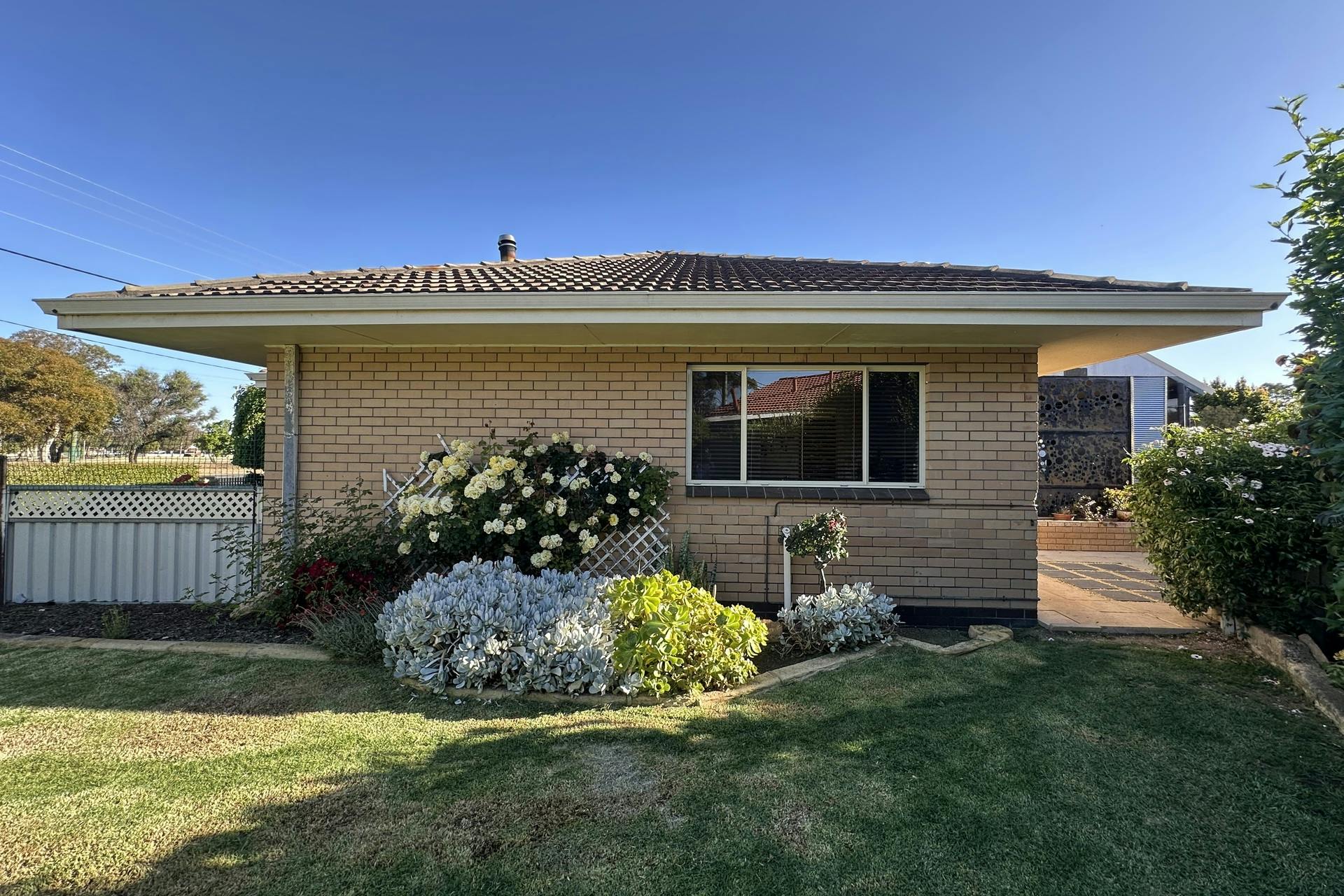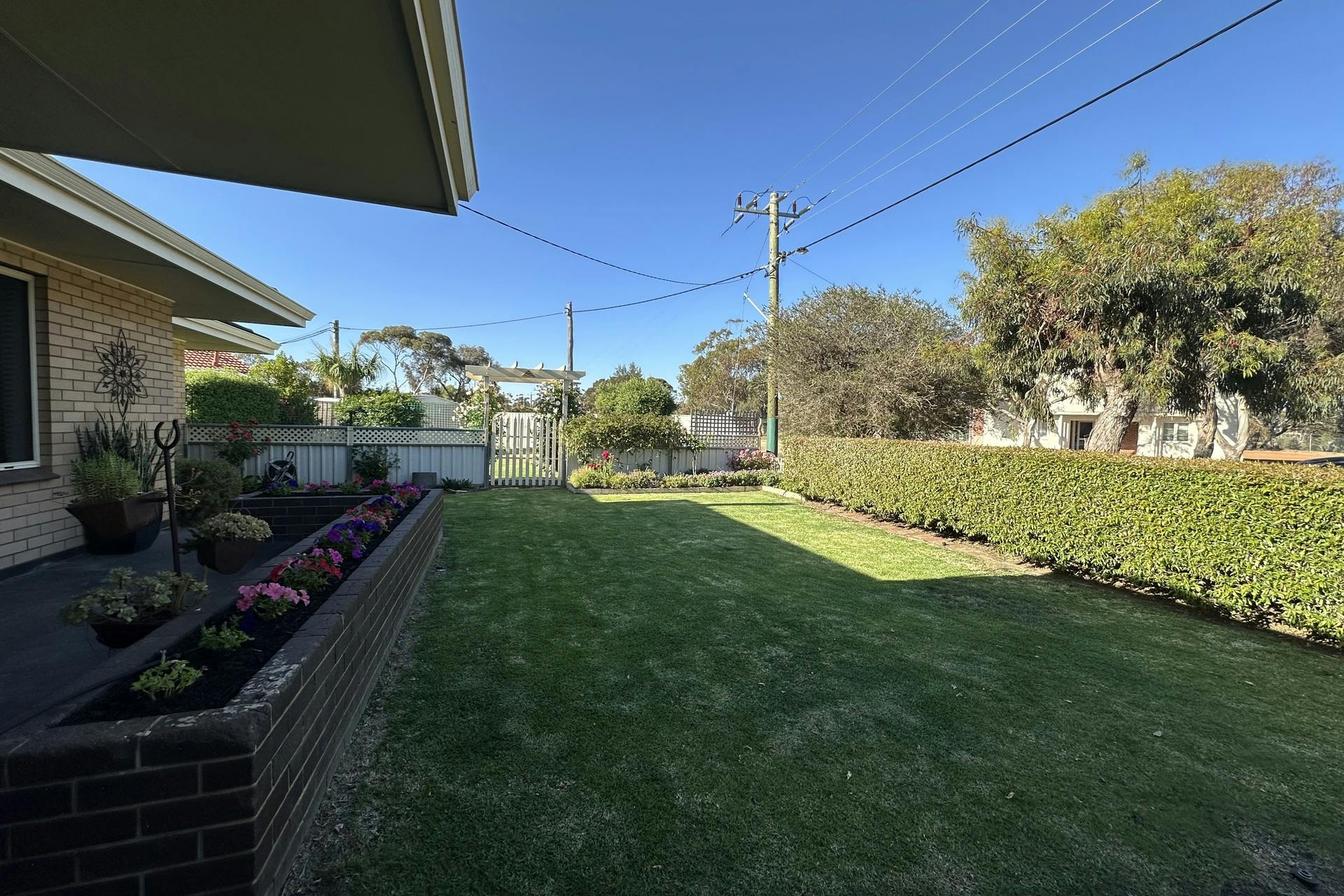 Surrounded by manicured gardens, lush lawns, an ornamental plum, and a graceful mulberry tree, this property offers a serene outdoor setting that's perfect for relaxing or entertaining.