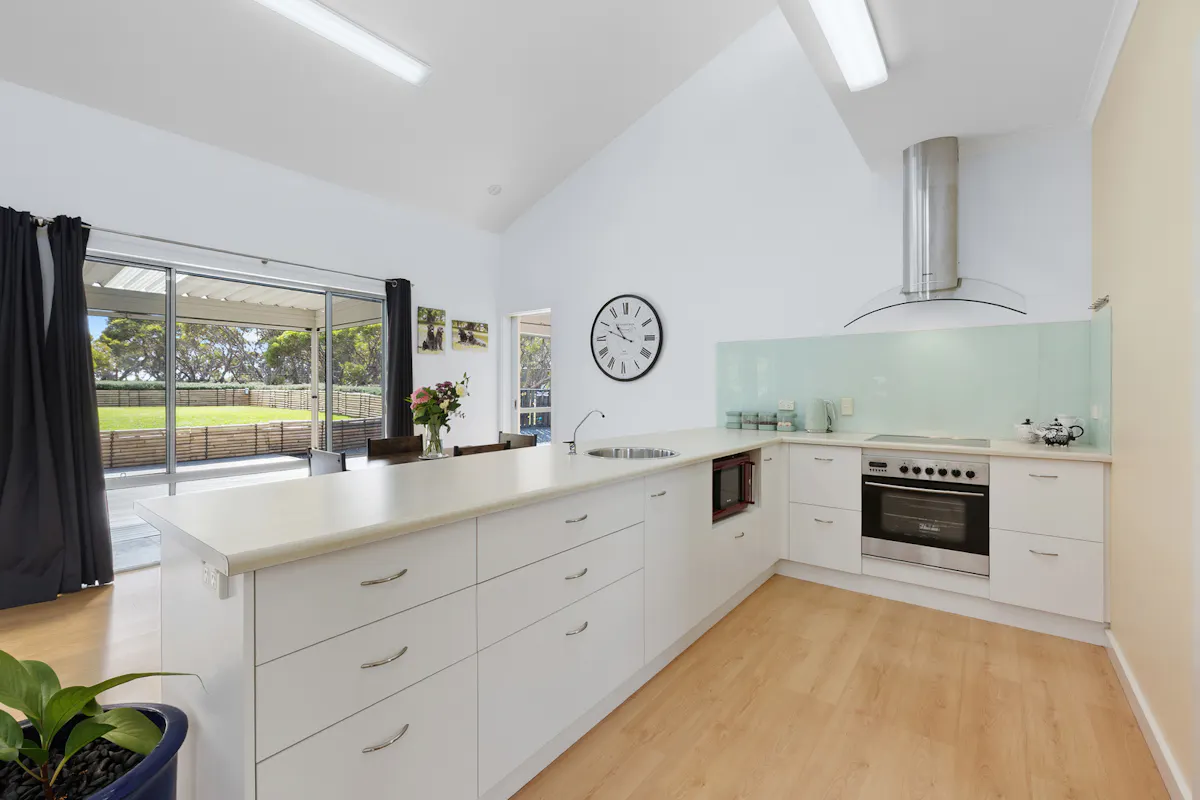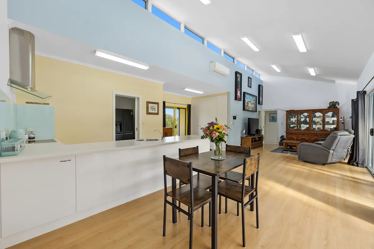 Inside, the light filled open plan kitchen, living and dining area is defined by soaring ceilings and a window lined rear wall that captures natural light and frames the surrounding landscape. A split system air conditioner services the main living area, ensuring year round comfort. This central hub flows seamlessly to the rear deck, creating an inviting space for relaxed living and effortless entertaining.