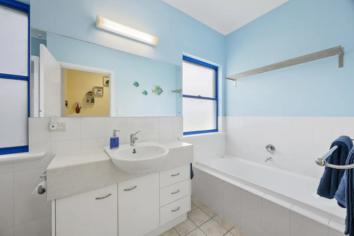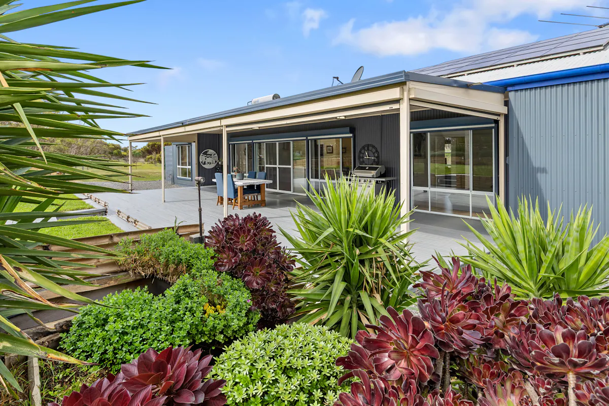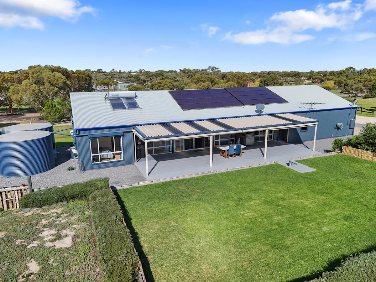 Designed with passive solar principles, the home is positioned to maximise winter warmth and reduce summer heat. Wide eaves, window shutters and remote controlled clerestory windows enhance airflow and ensure year round comfort. A 2.7kW solar system supports energy efficiency, while rainwater is plumbed throughout the home for added sustainability.