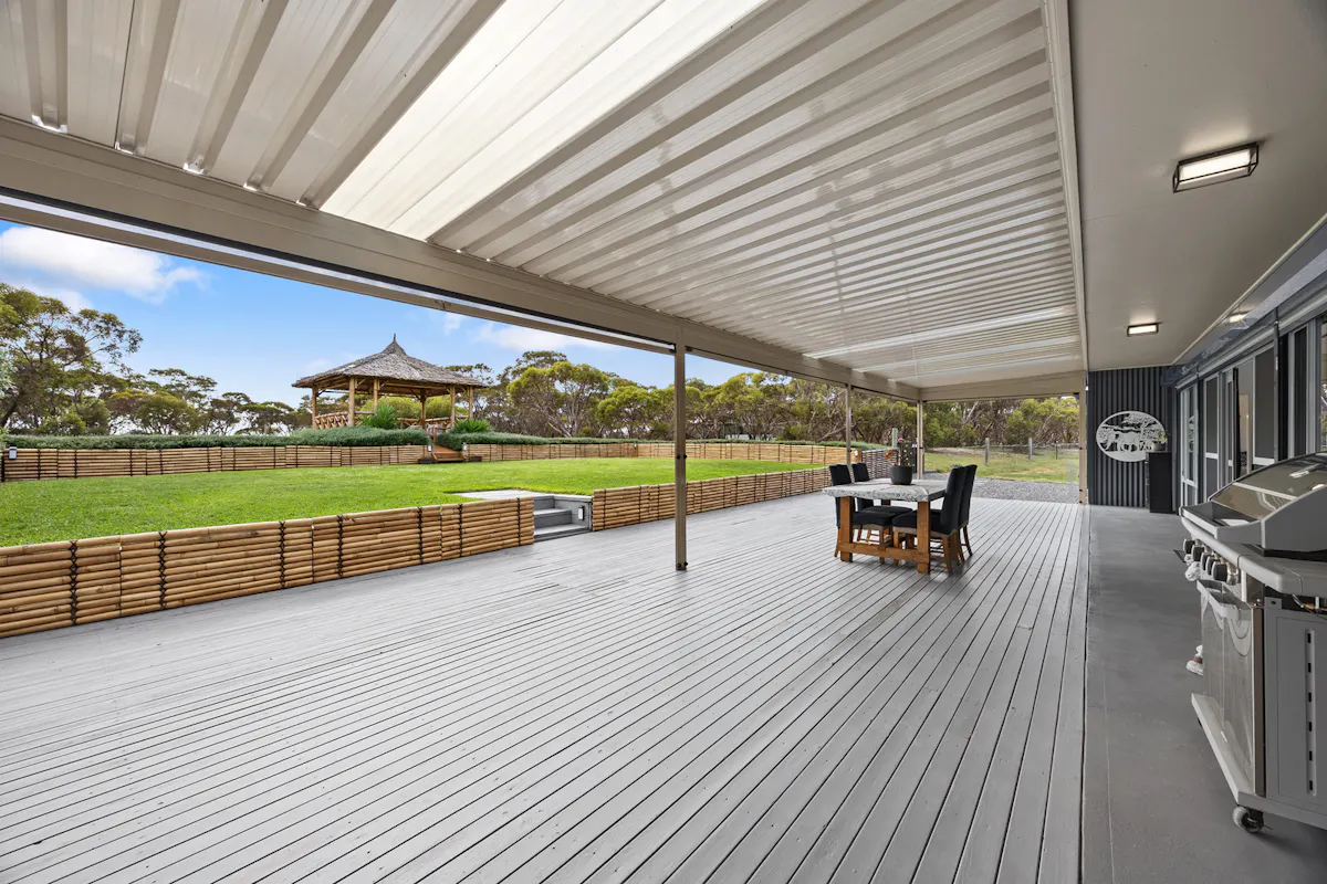 The rear deck, fitted with retractable outdoor blinds, provides a versatile entertaining area overlooking established gardens and the natural landscape, delivering a true lifestyle setting.