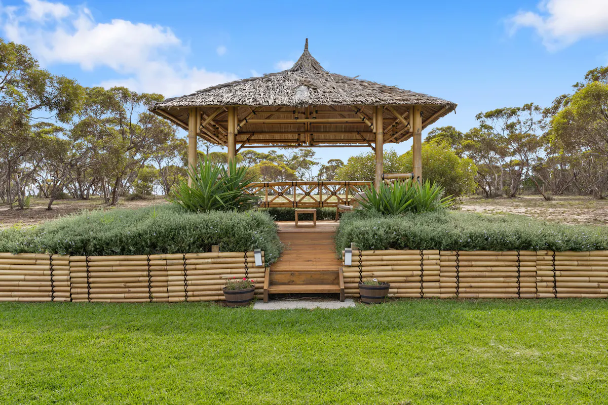 A charming Bali hut sits on the edge of the native scrub, offering a tranquil retreat space perfectly positioned to take in the natural surroundings and abundant birdlife.