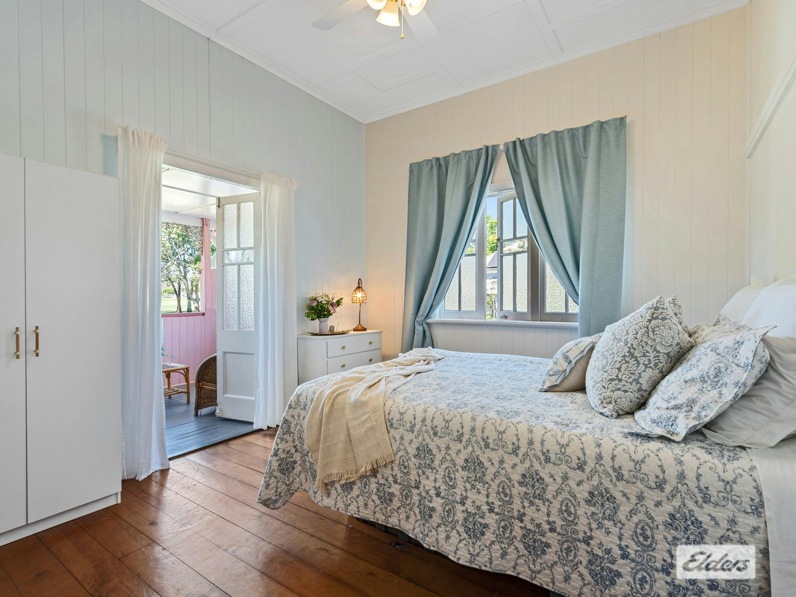 Accommodation includes three generous bedrooms. The master suite enjoys patio access and boasts a delightful bay window with seating, air conditioning, and a spacious private dressing room. The second bedroom features elegant French doors opening onto the front patio. The charming "Peach Room" (third bedroom) offers ample space for all bedroom furnishings and more.