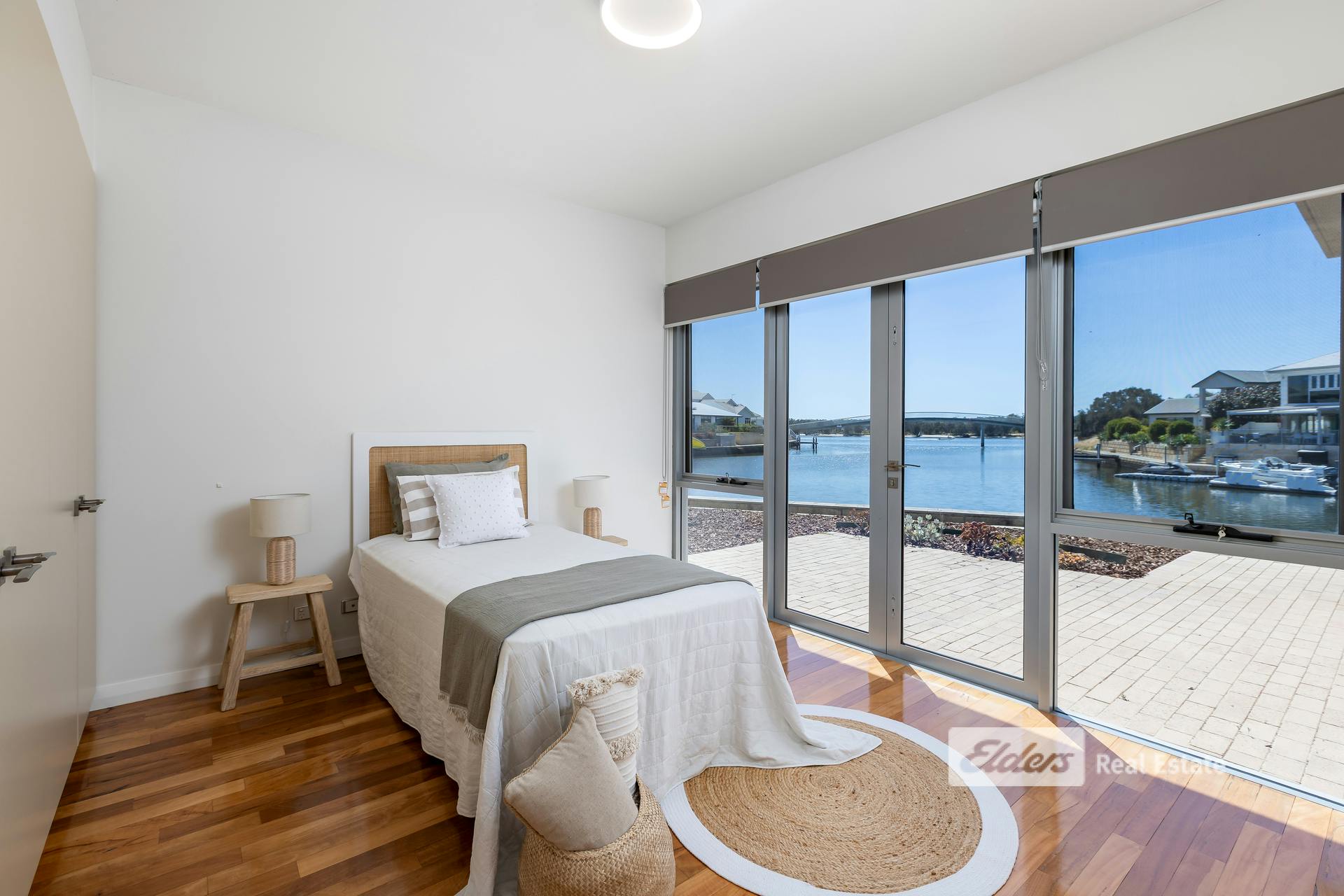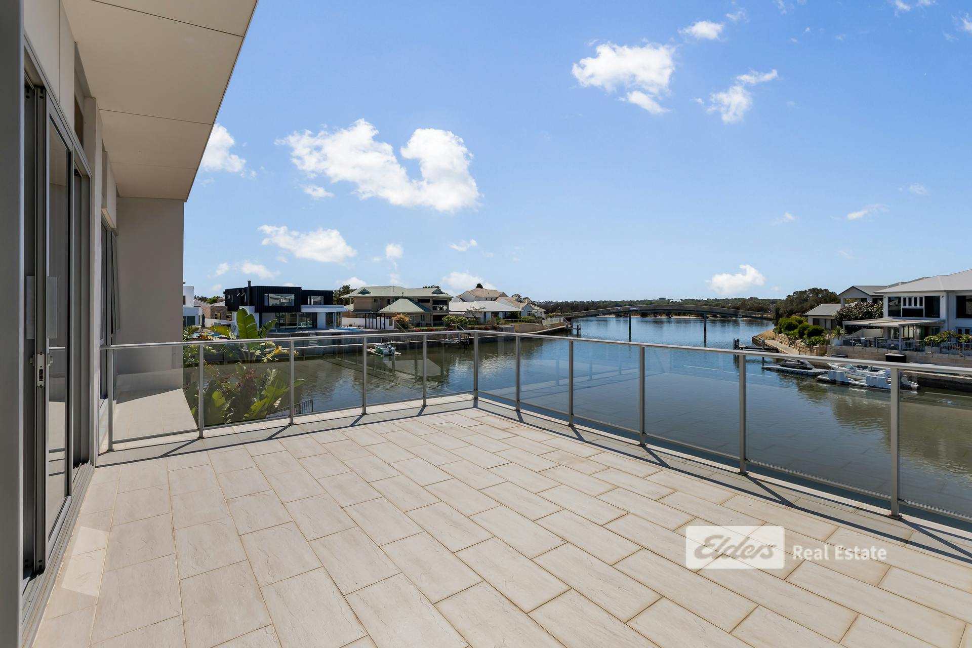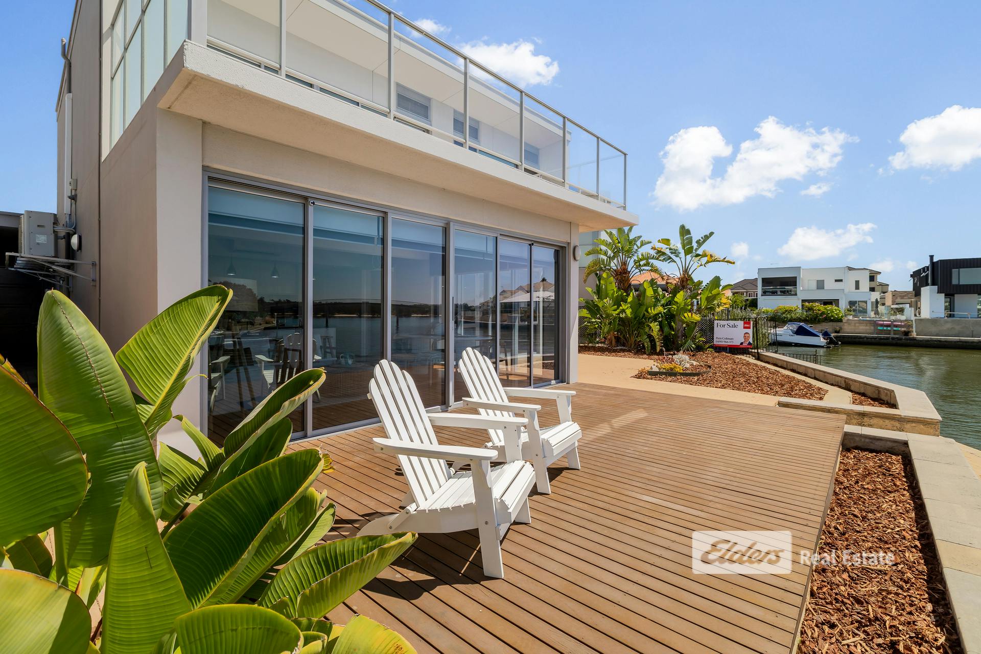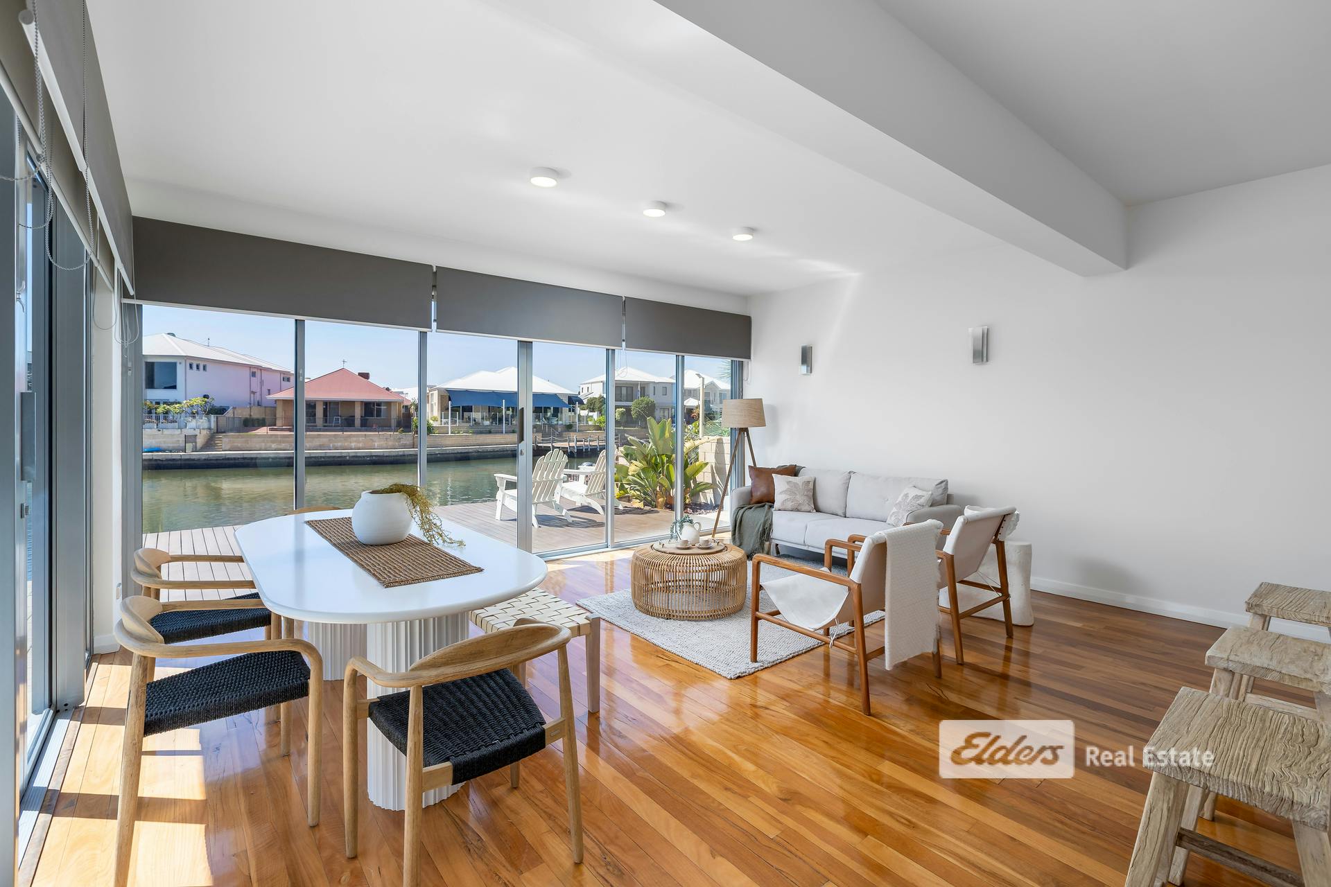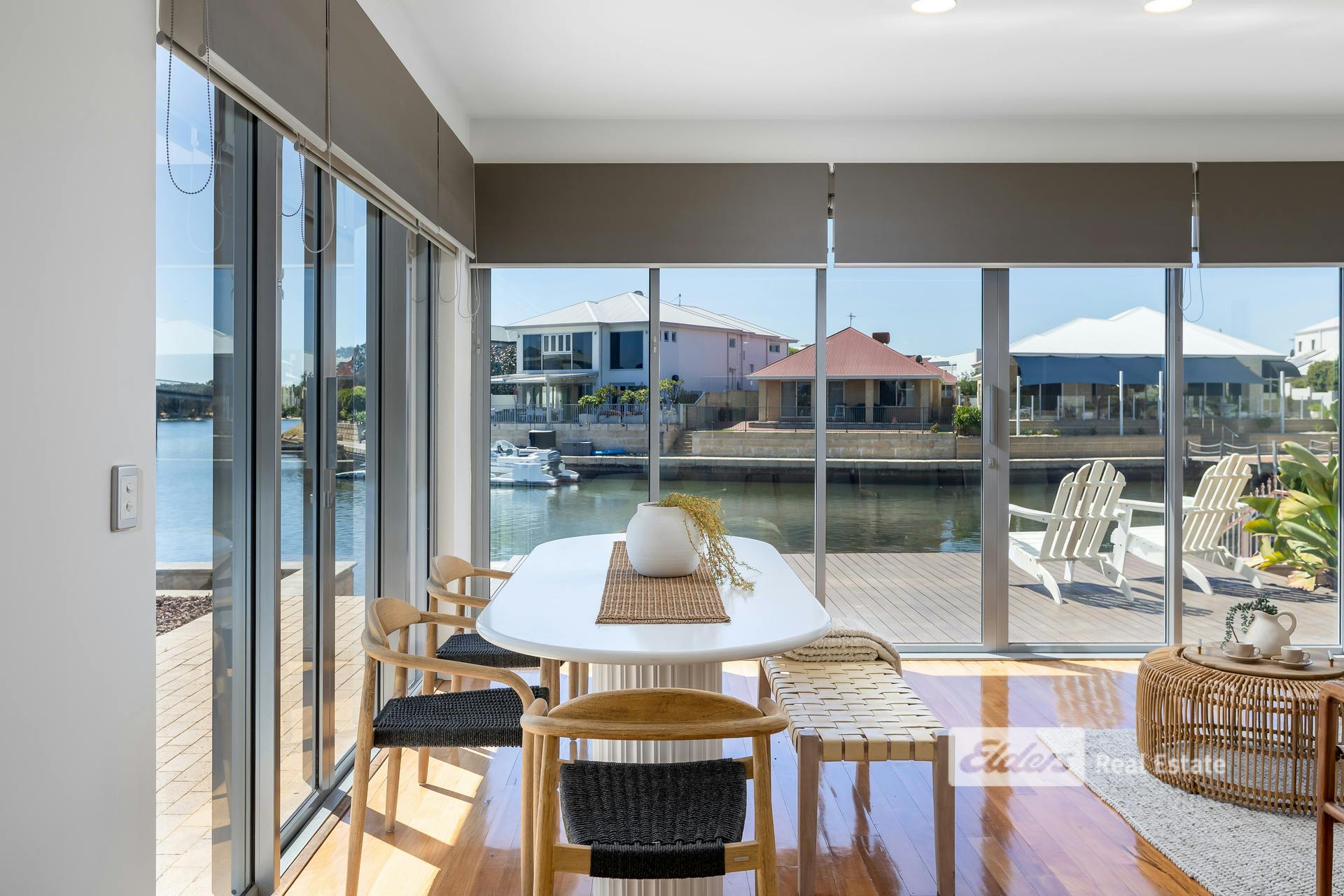 - Expansive glass sliders opening onto a timber deck with canal access