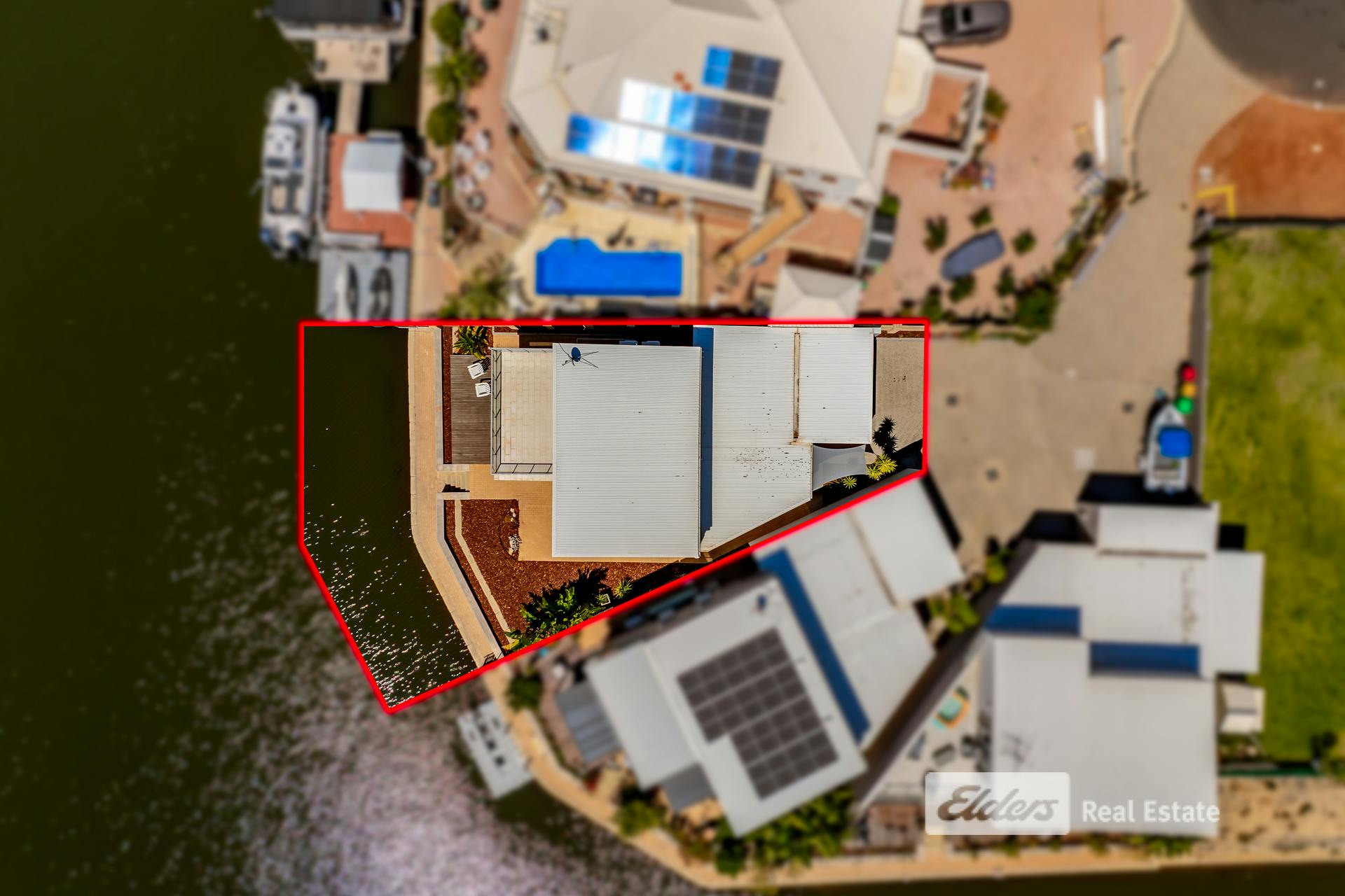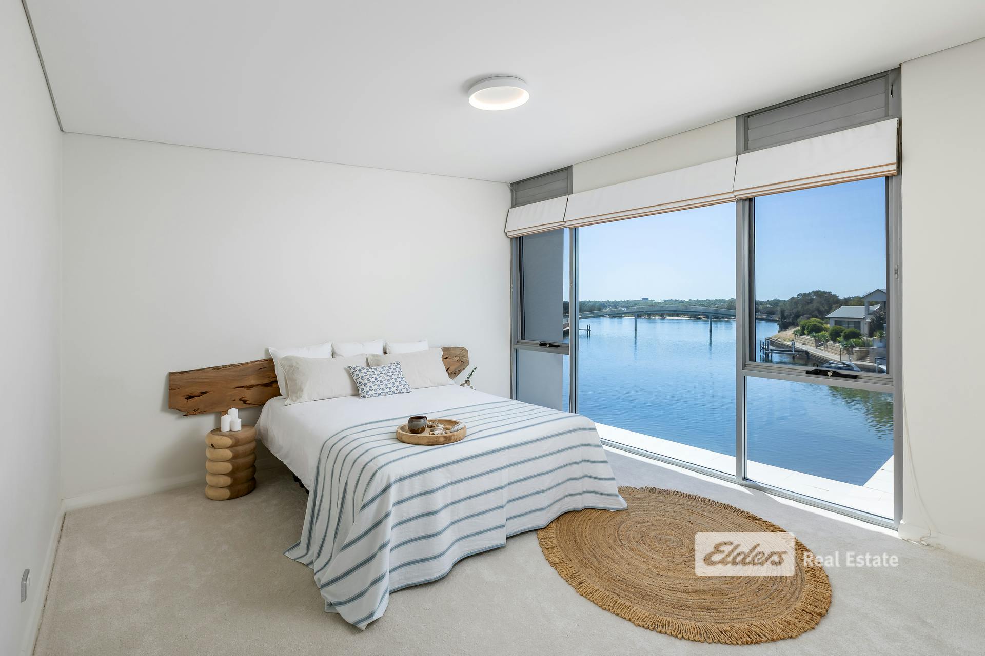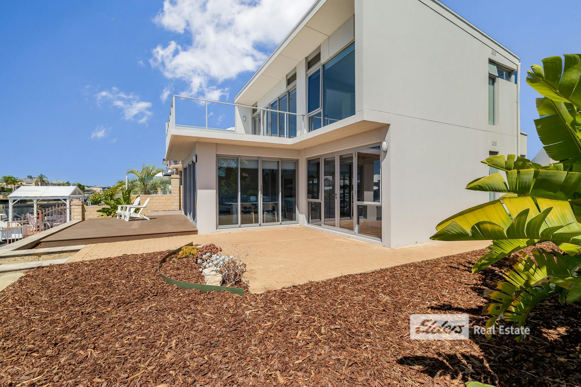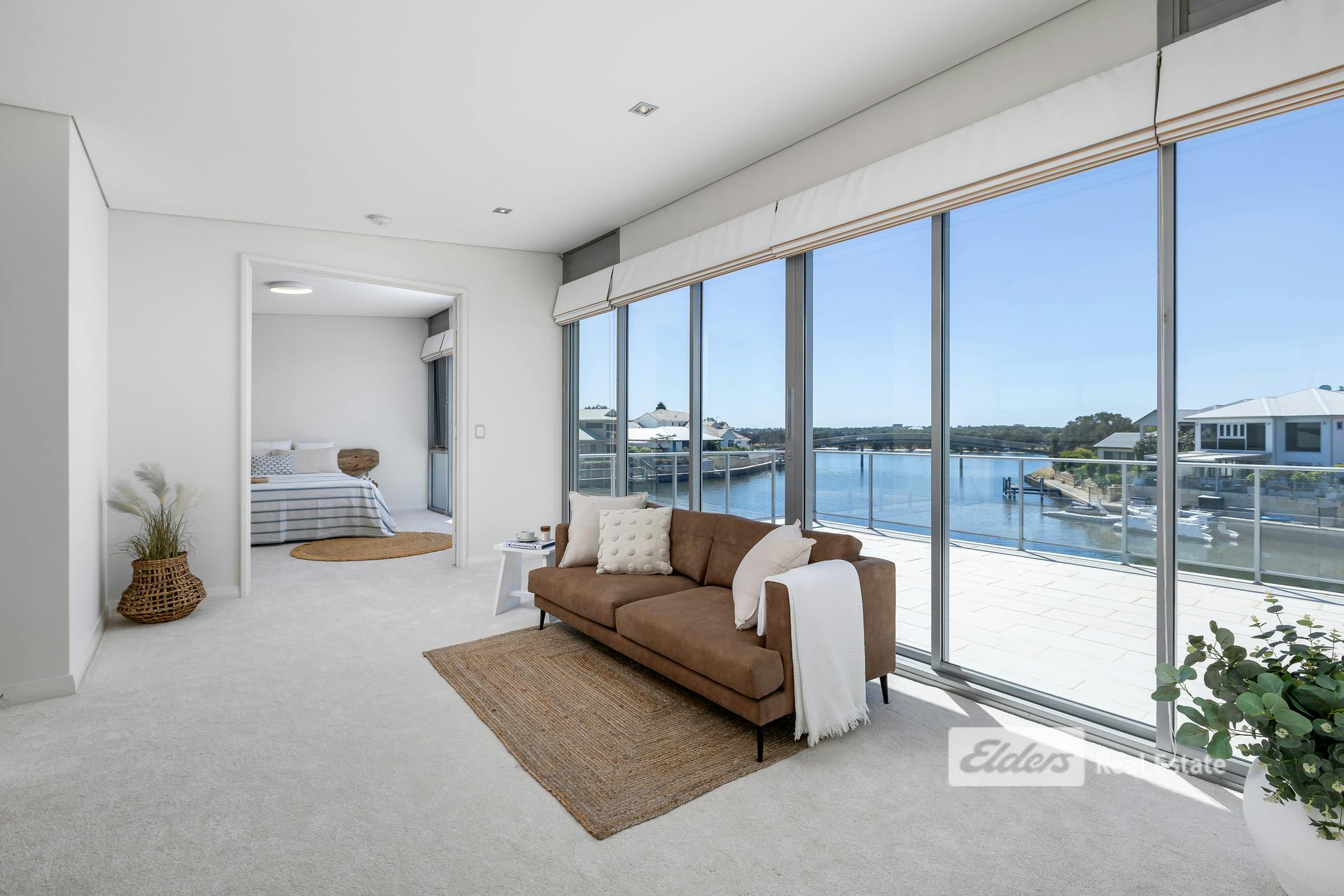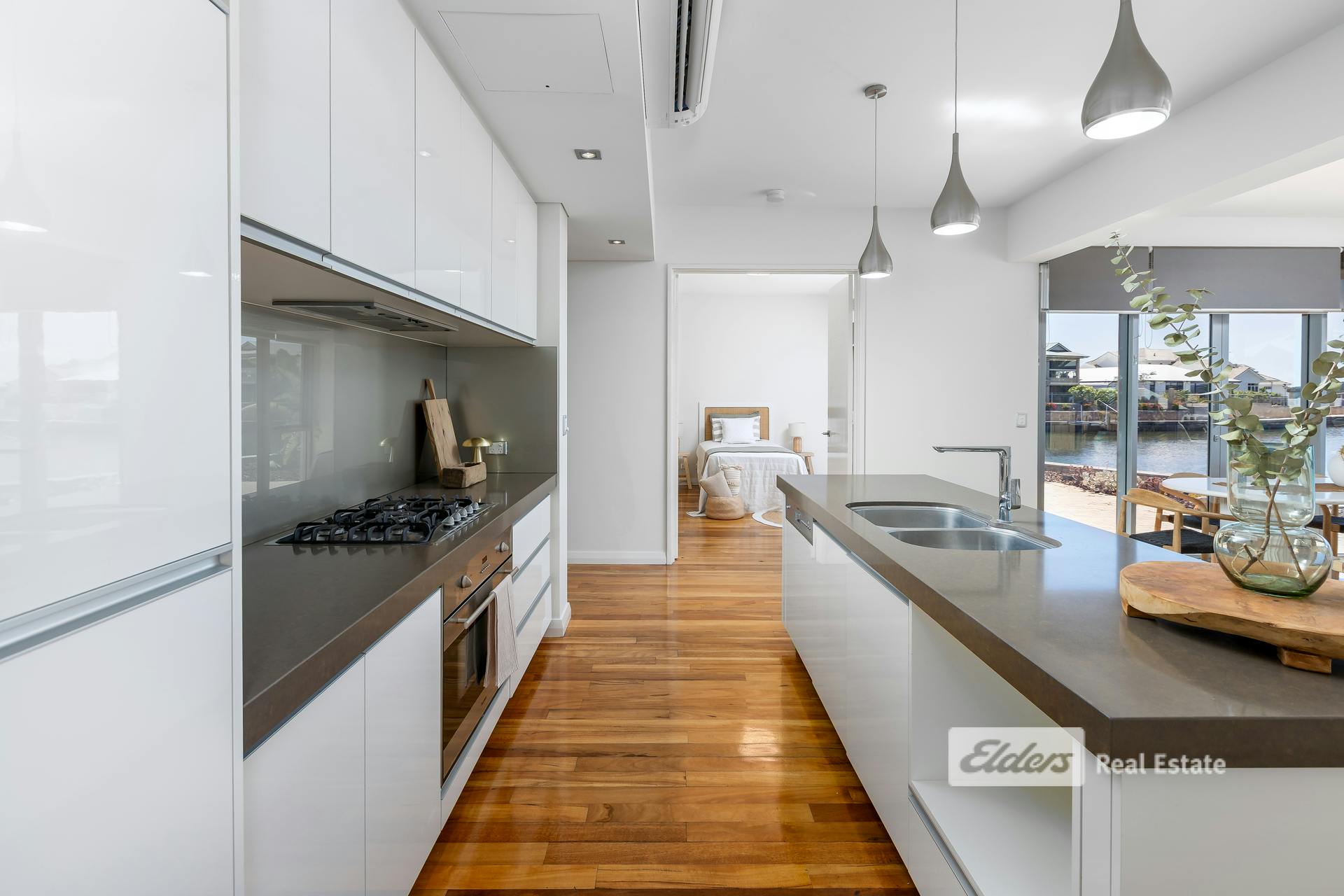 - Expansive glass sliders opening onto a timber deck with canal access