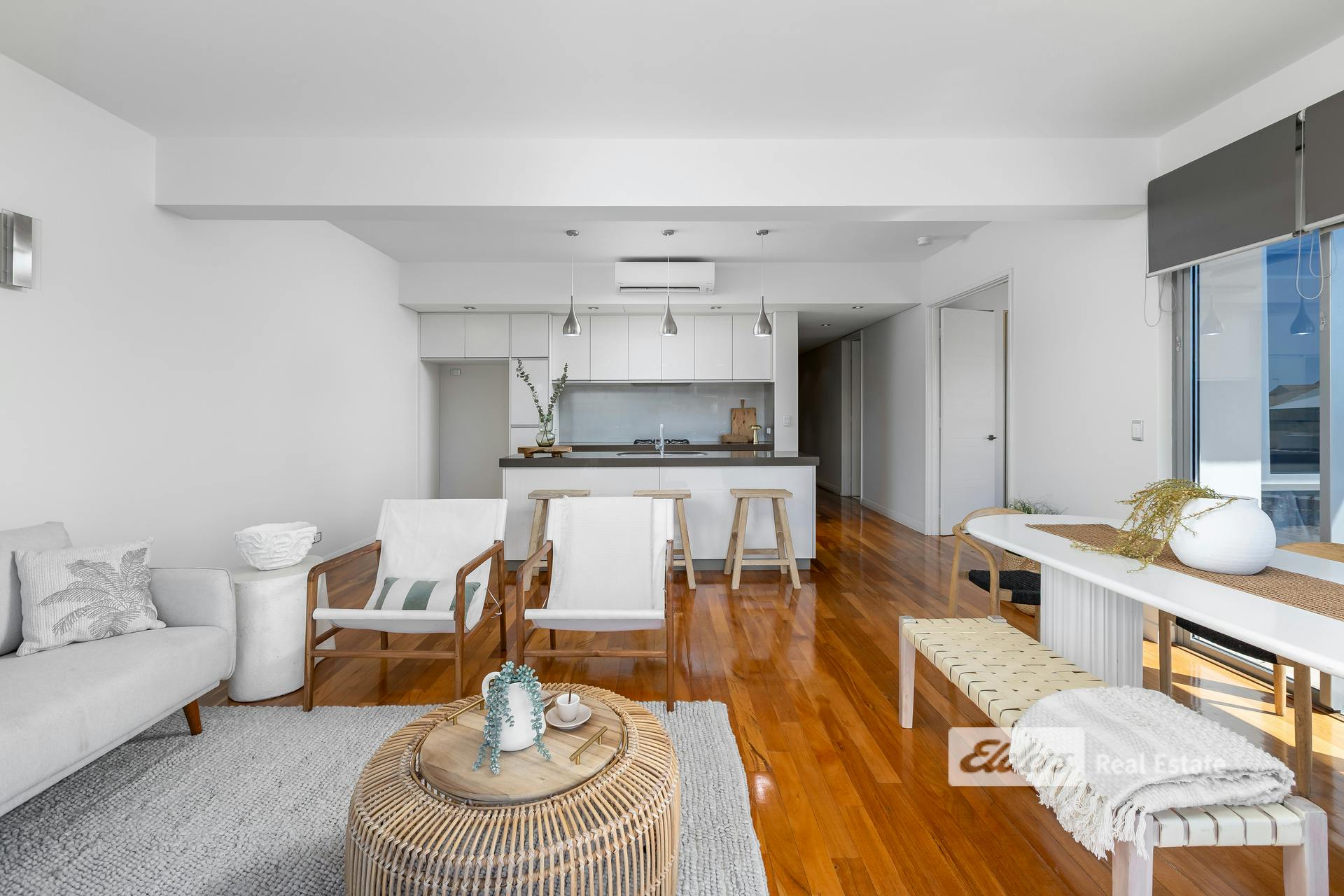 - Large open-plan kitchen, dining, and living area with timber flooring
