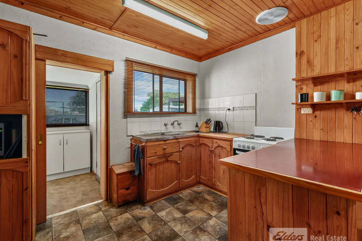 The kitchen is practical and well-equipped with timber cabinetry, an electric oven, walk-in pantry, and direct access to the laundry.