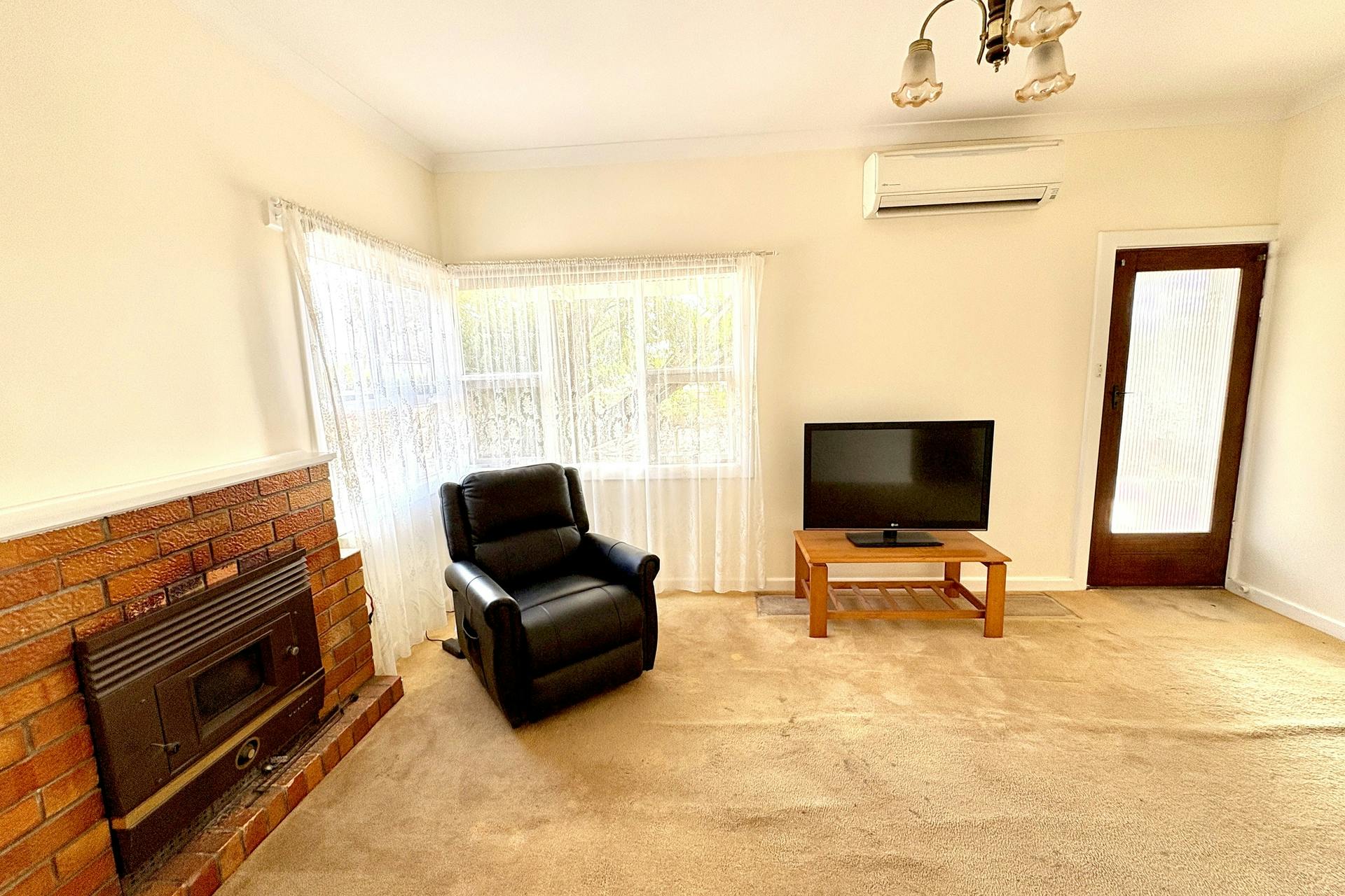 A three-metre-wide front verandah provides a sheltered entry into the cosy lounge, complete with reverse cycle air conditioning, wood combustion heater, and two stylish three-light glass pendant fixtures. Carpeted flooring enhances comfort in the lounge and two front bedrooms.