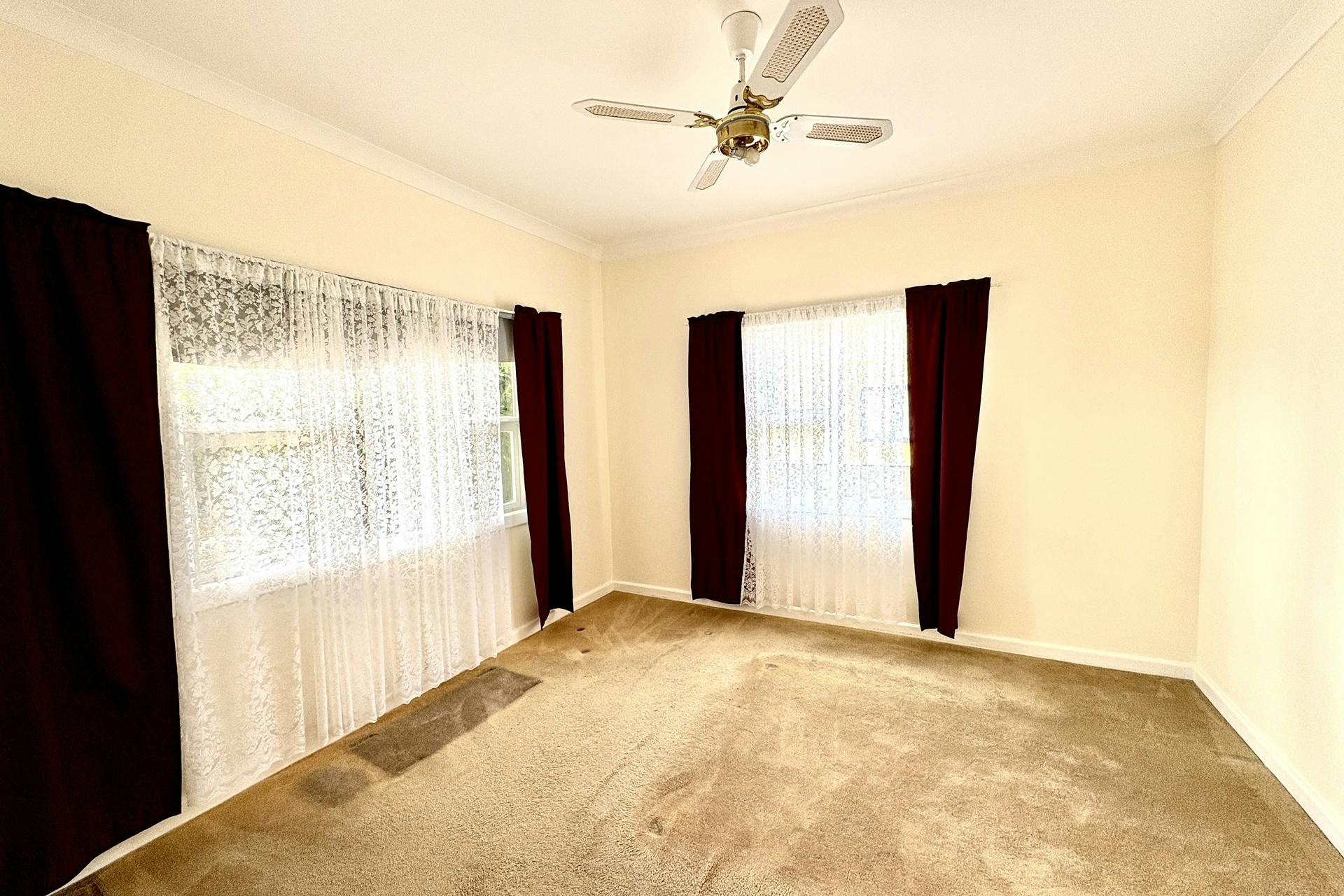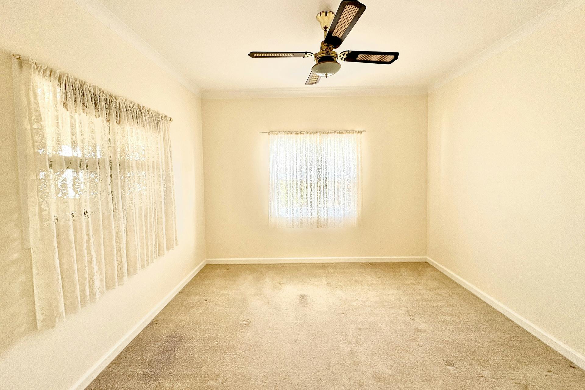 Both bedrooms are light-filled, each featuring ceiling fans and windows on two separate walls to maximise natural light and airflow.