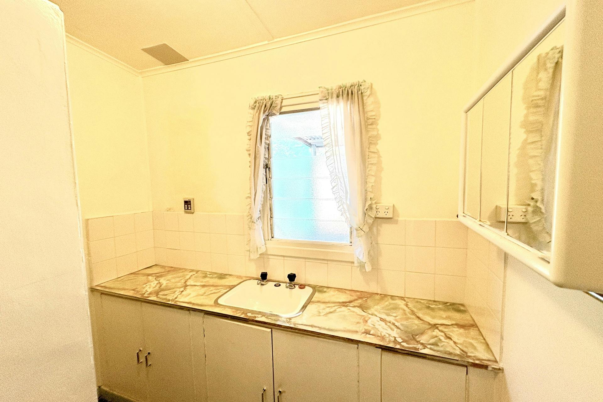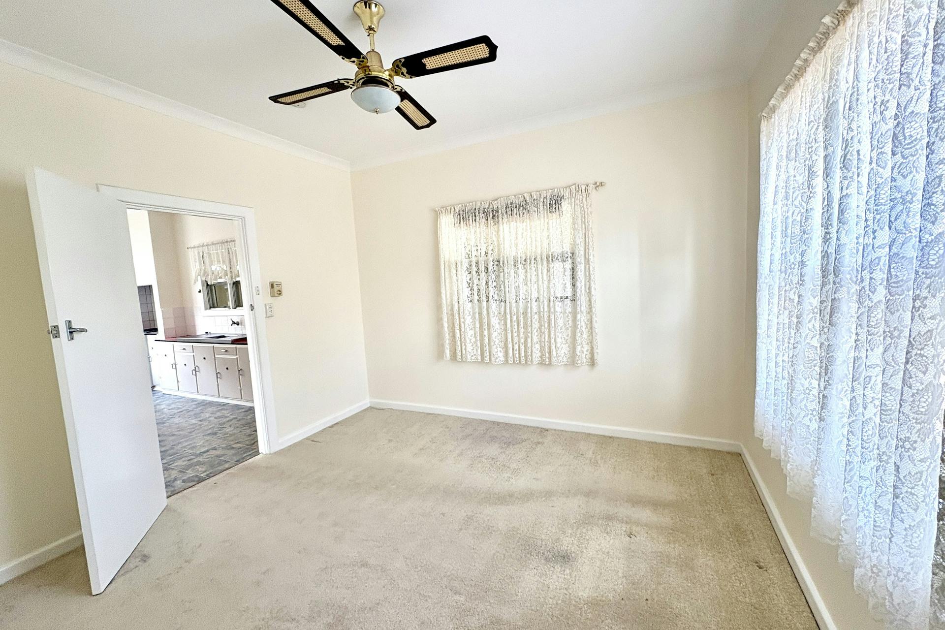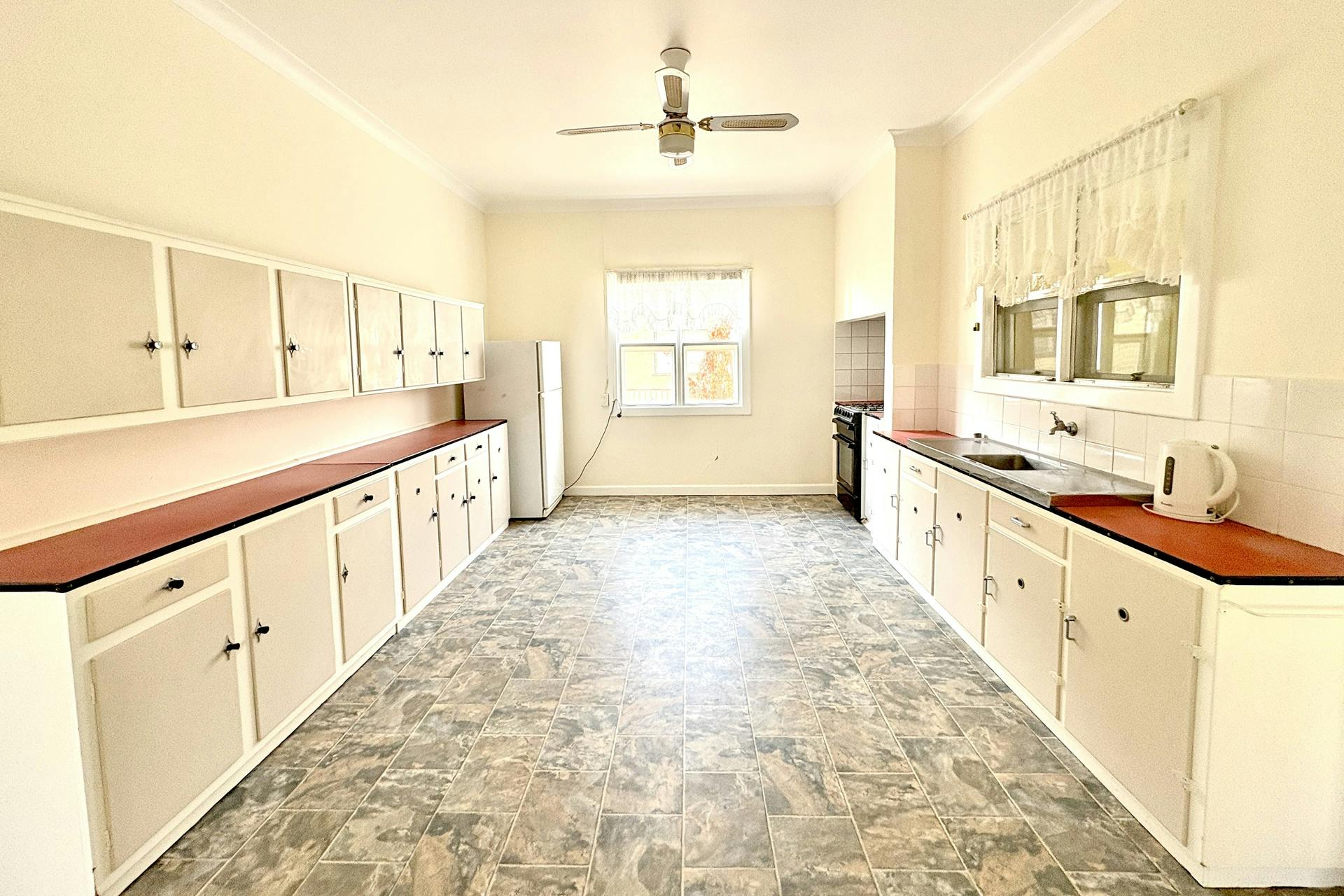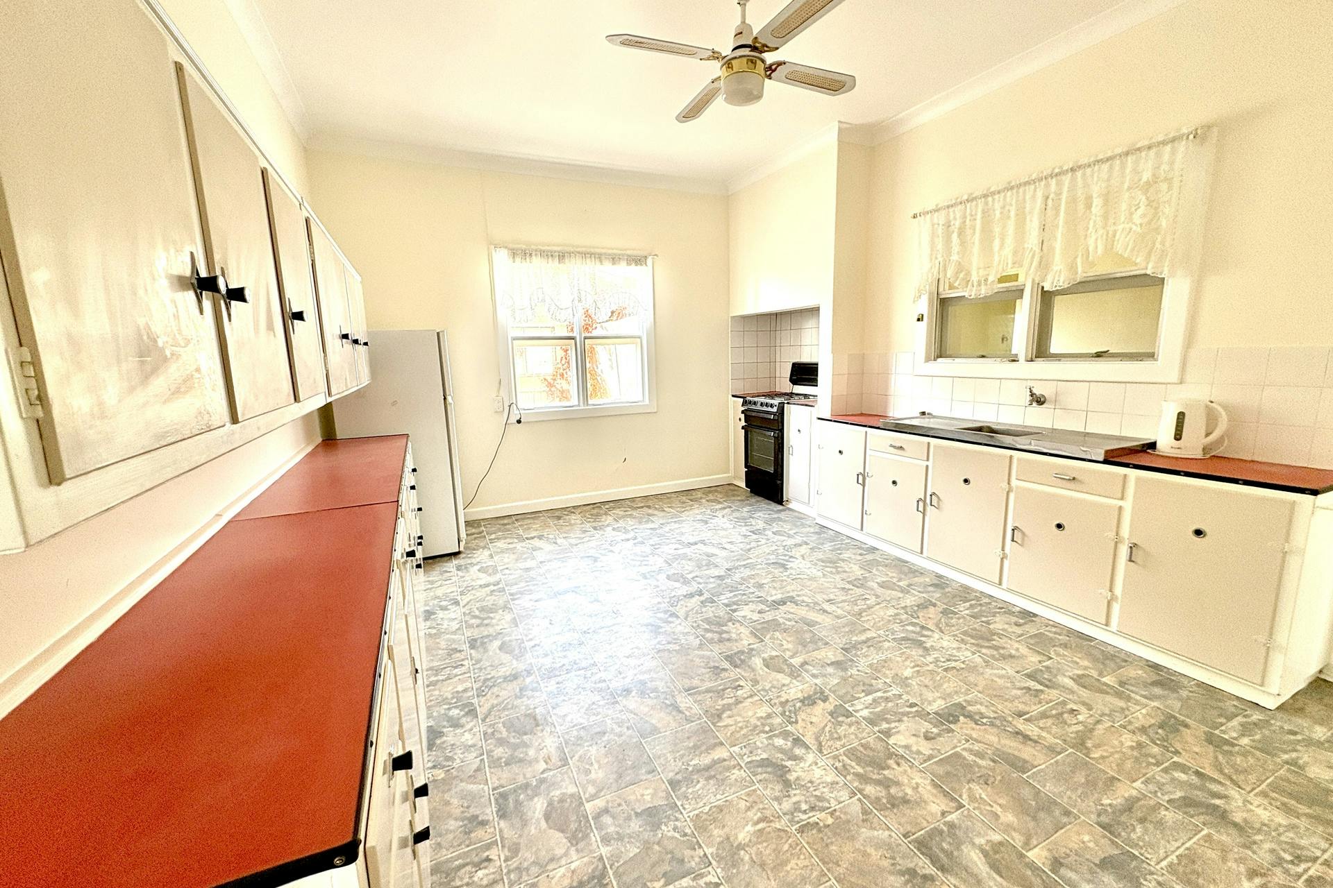 The kitchen offers generous bench and cupboard space along two walls, overhead cabinetry, room for a fridge, single sink, gas oven and cooktop, and vinyl flooring throughout. While perfectly functional, this space presents a fantastic opportunity for a modern upgrade to truly transform the heart of the home.