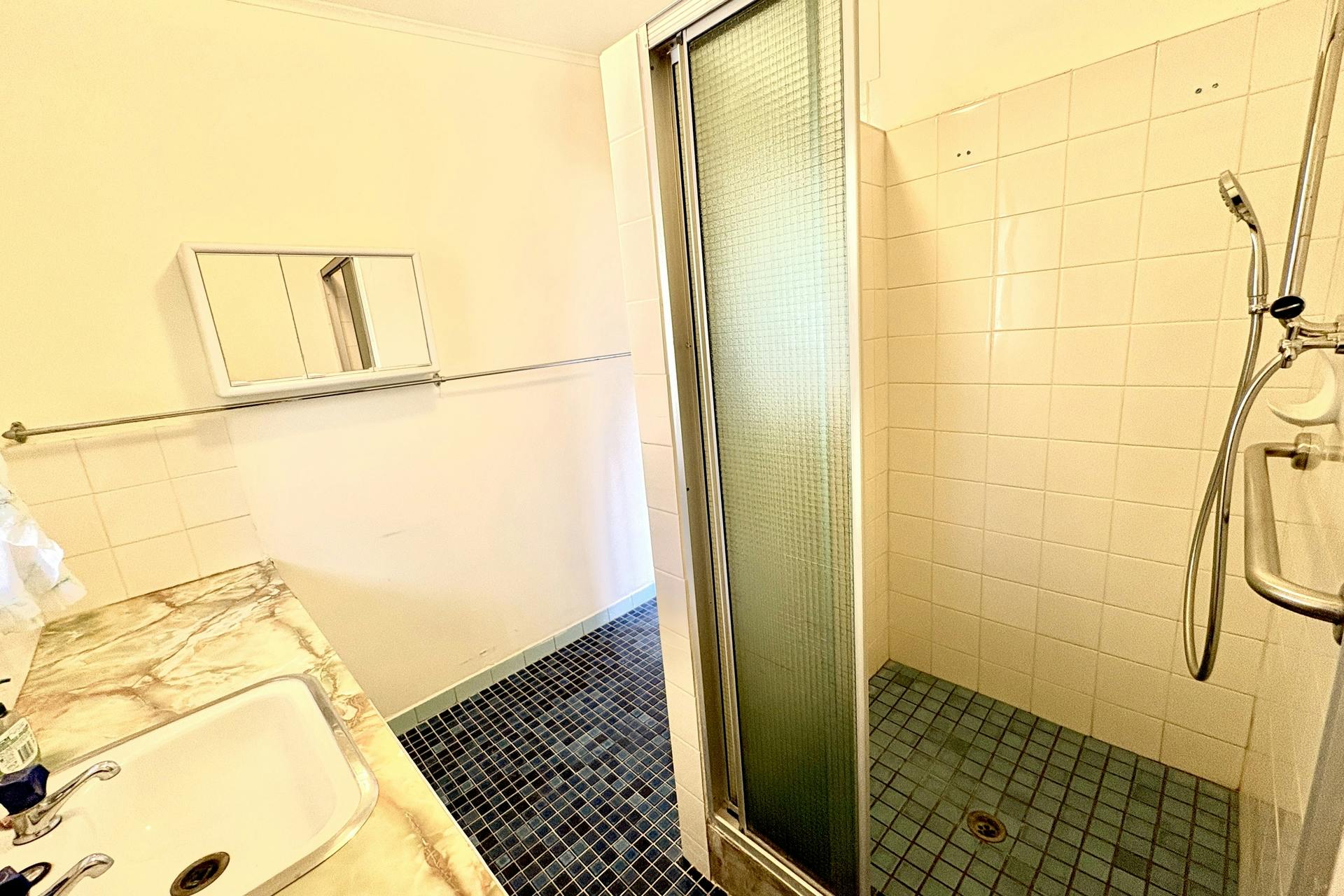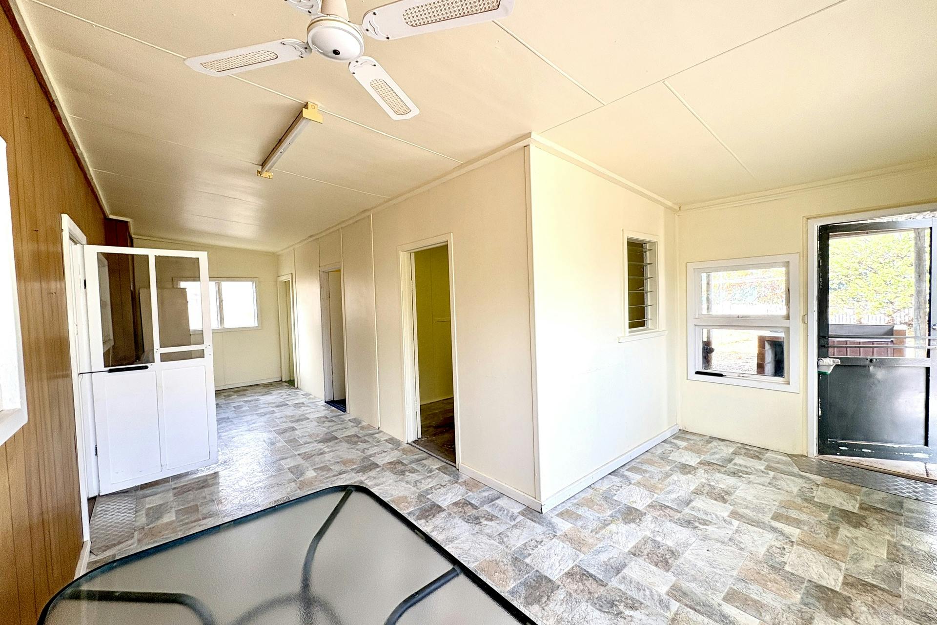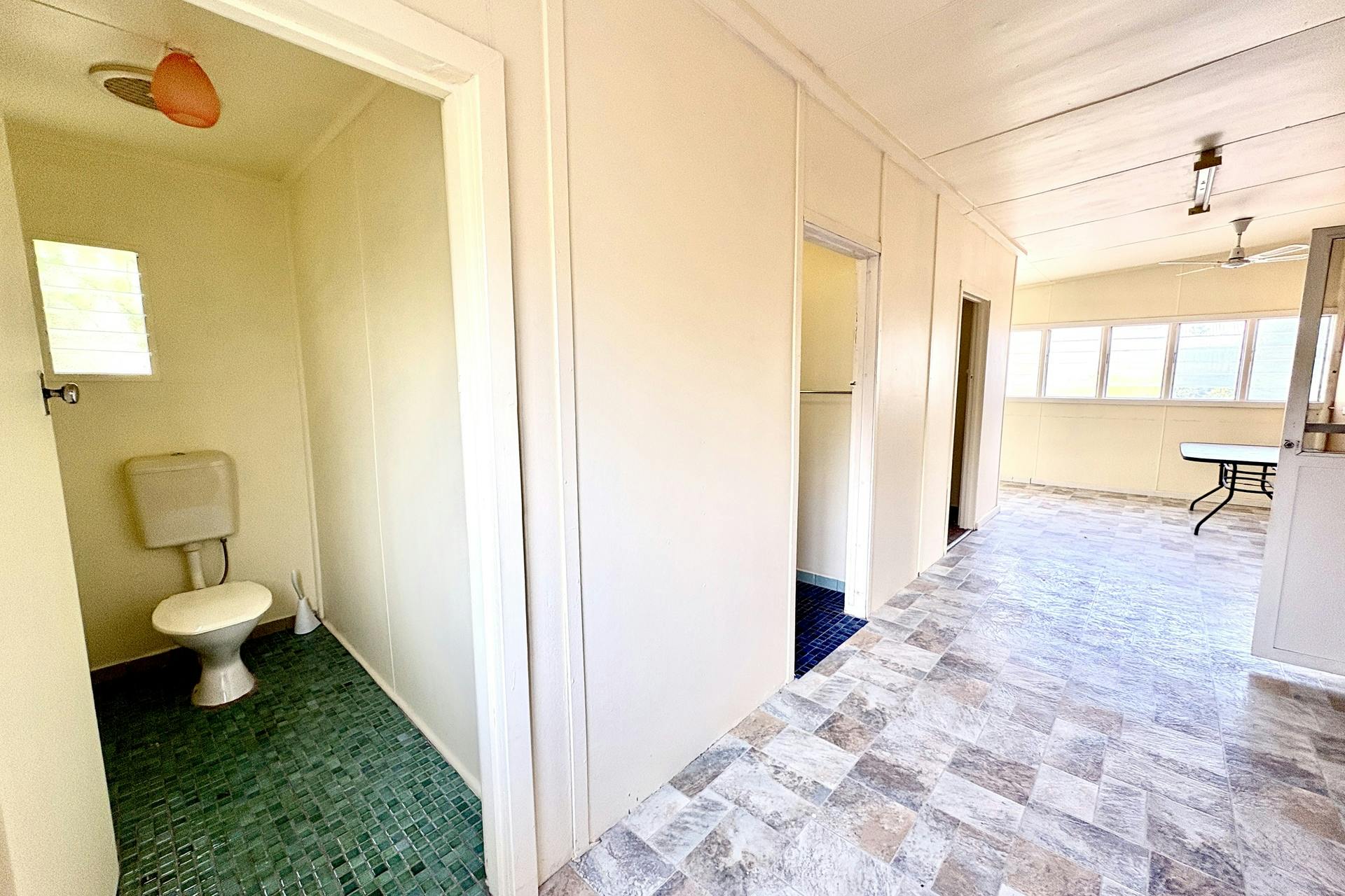 The rear porch (also vinyl floored) leads to a tiled bathroom and separate toilet, along with a small third bedroom with a concrete floor. The bathroom includes built-in cabinetry with laminated benchtop and single basin, a three-door mirrored wall cabinet, and a step-up shower with glass sliding door.