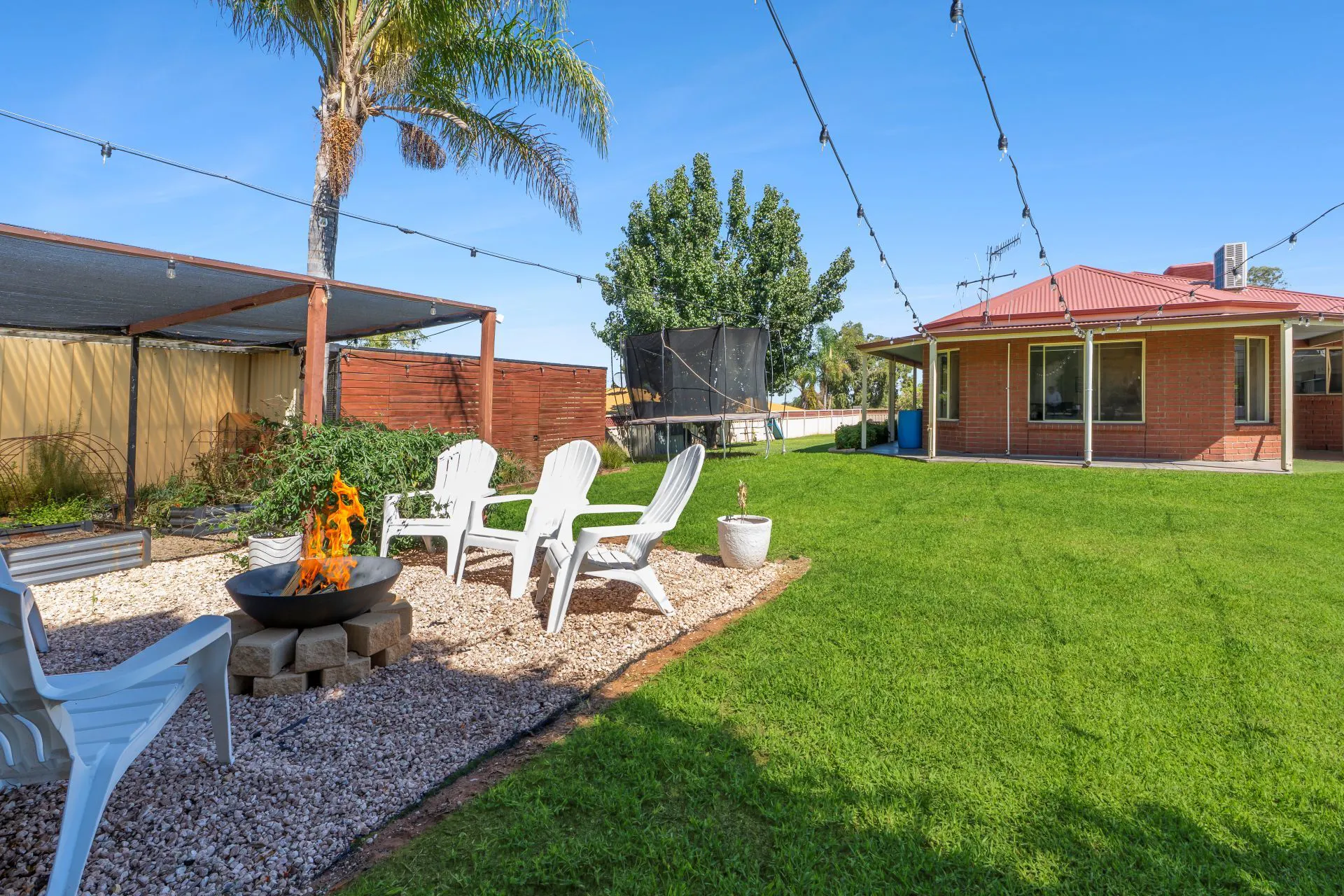 Surrounded by lush lawns, established gardens and a dedicated fire pit area, the outdoor setting offers both privacy and lifestyle appeal.