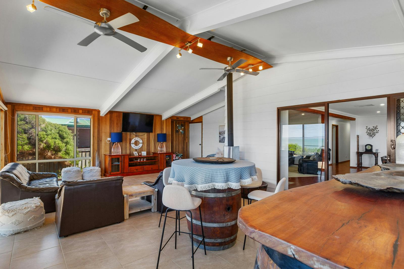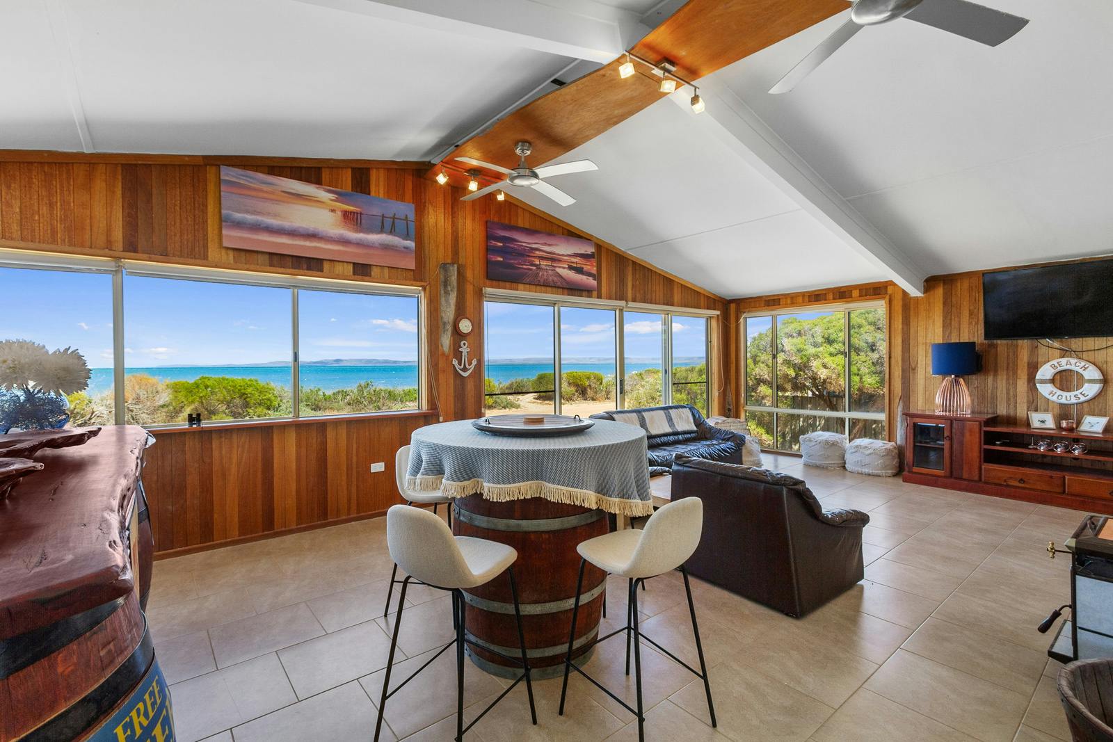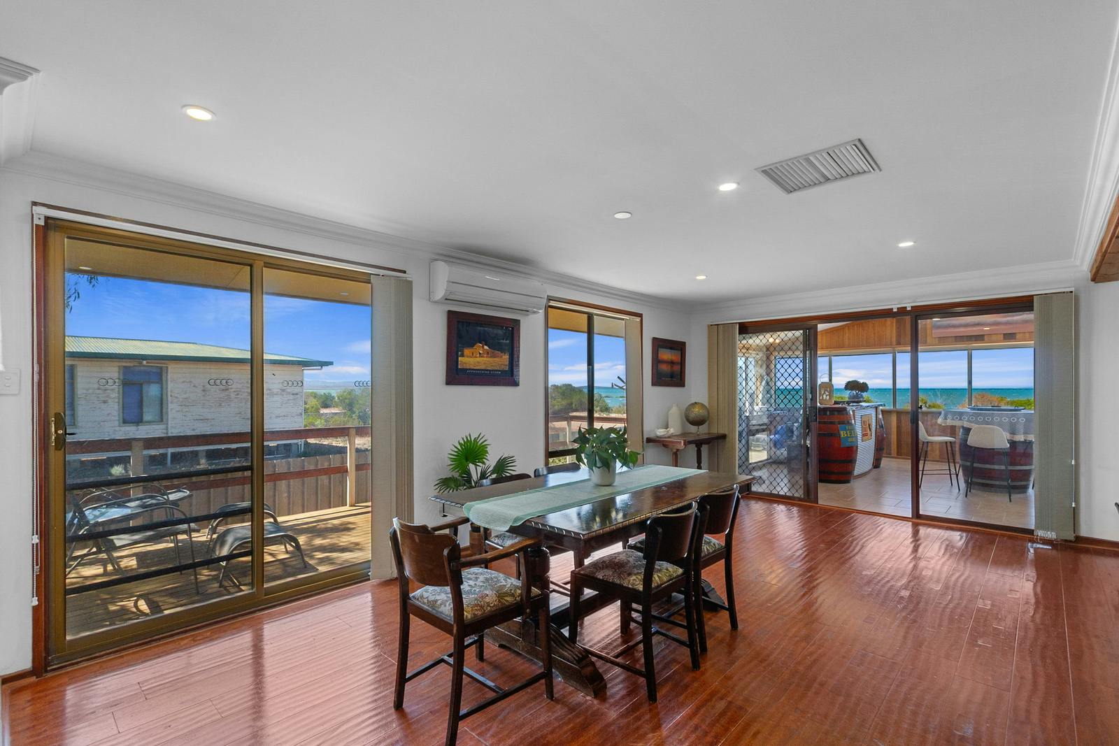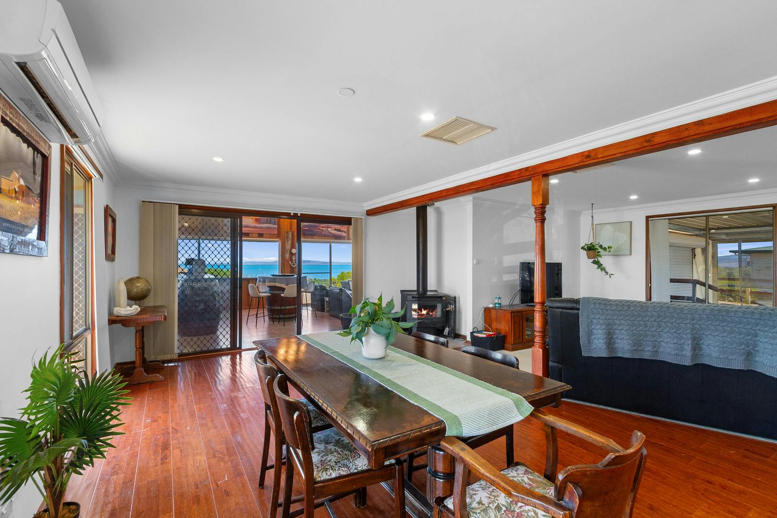 Set on an approximately 1,000m² allotment, the home features an open-plan design, three bedrooms, and all the comforts expected from quality beachside living. Rich timber floors and modern downlighting create a warm, inviting atmosphere throughout the main living spaces. A spacious front family room provides the perfect place to unwind with family and friends while enjoying the stunning water views.