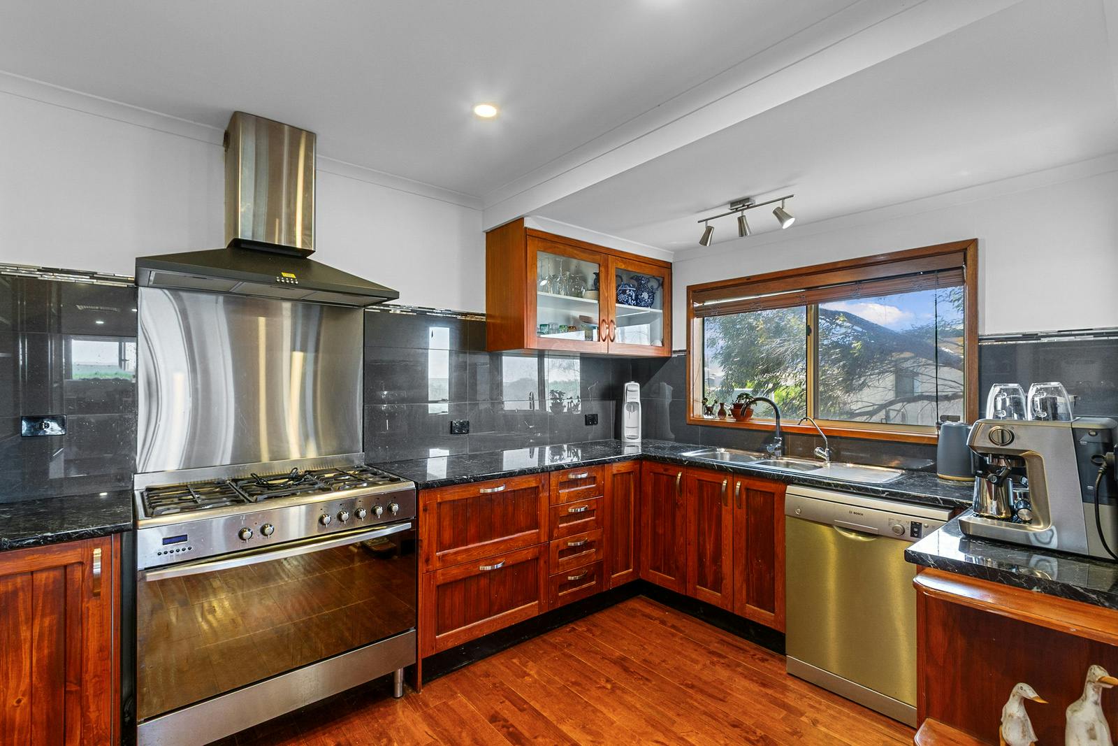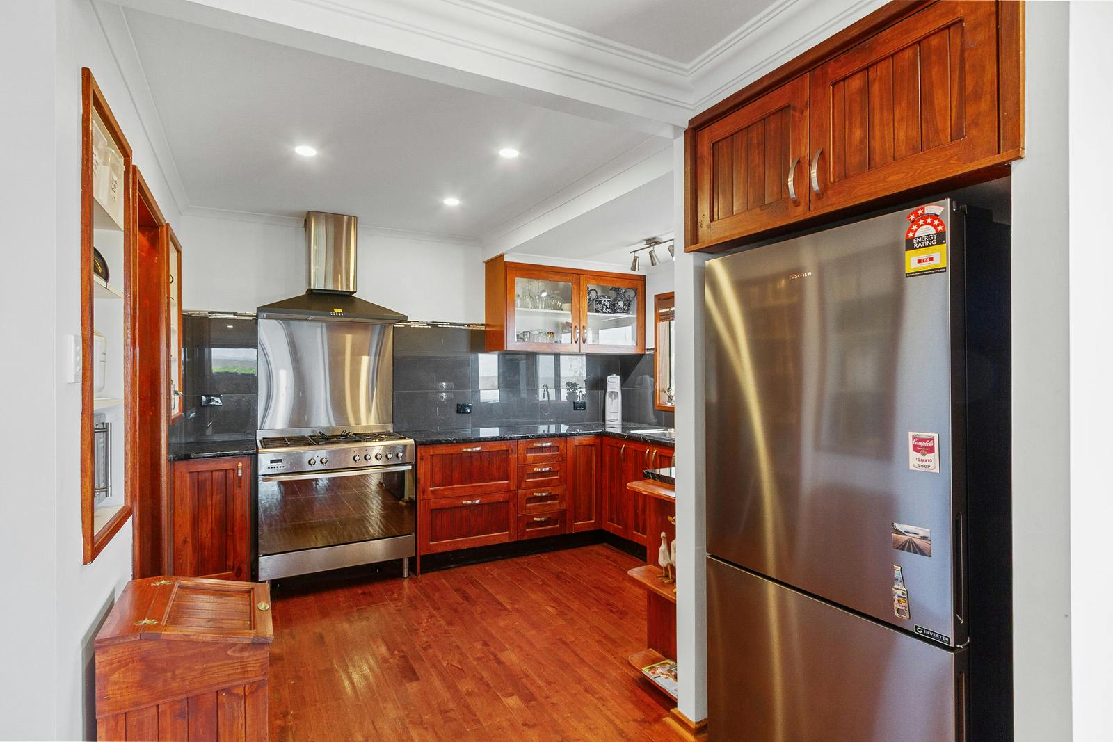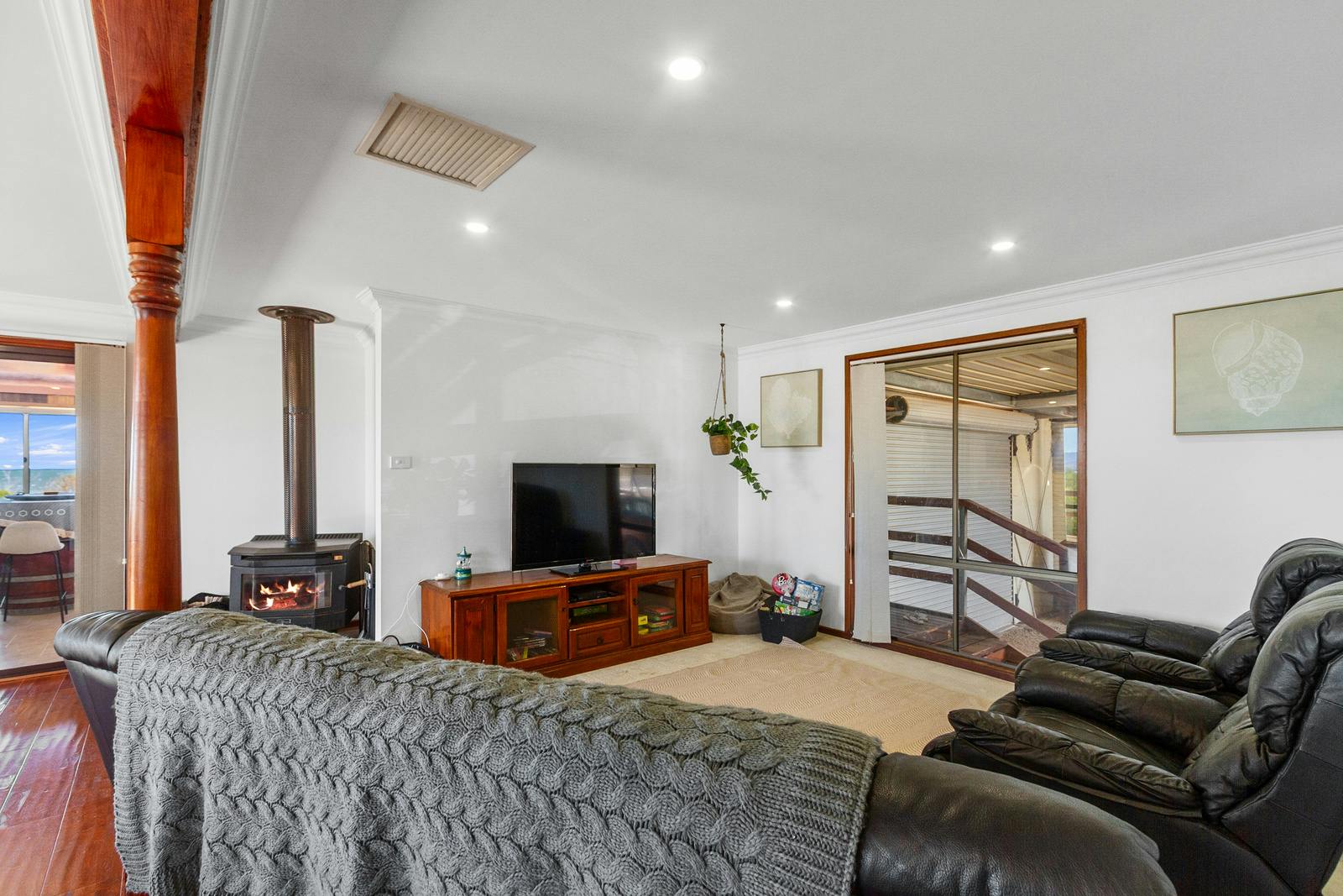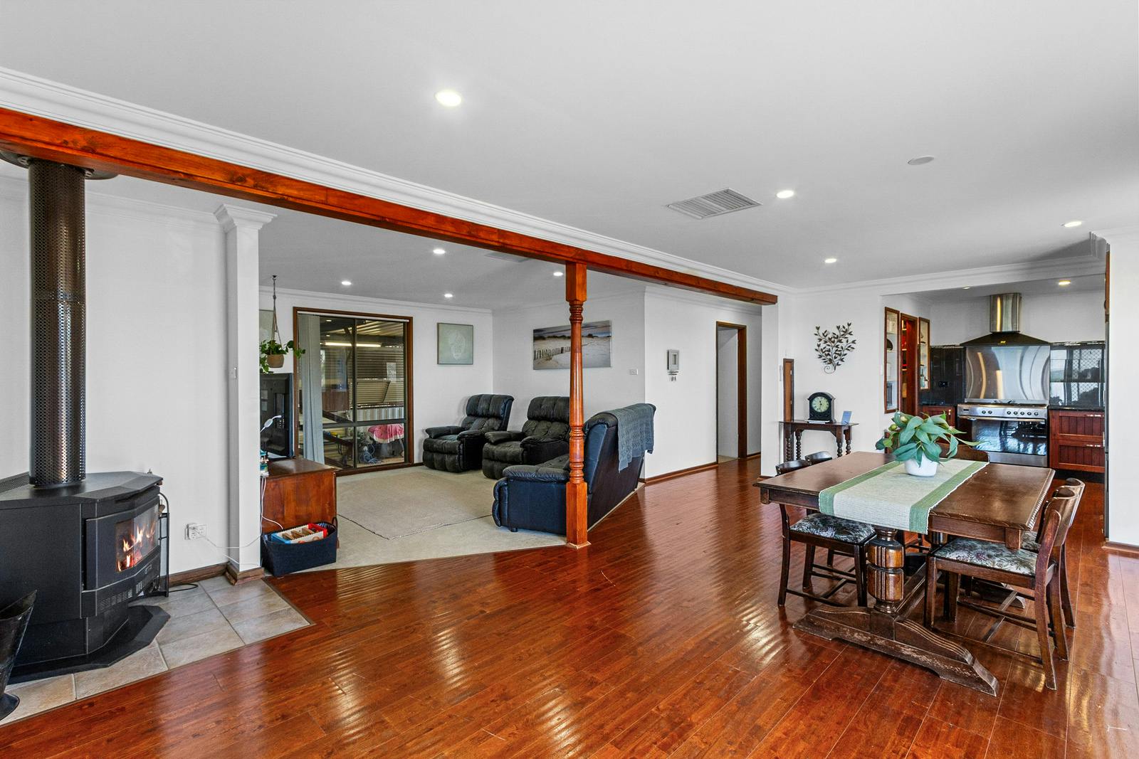 The well-appointed kitchen overlooks the combined dining and family area-an ideal setting for entertaining. This space is enhanced by a slow-combustion heater and split-system air conditioner for year-round comfort. A walk-in pantry offers excellent storage, complemented by a 900mm freestanding oven with gas cooktop and generous bench space.