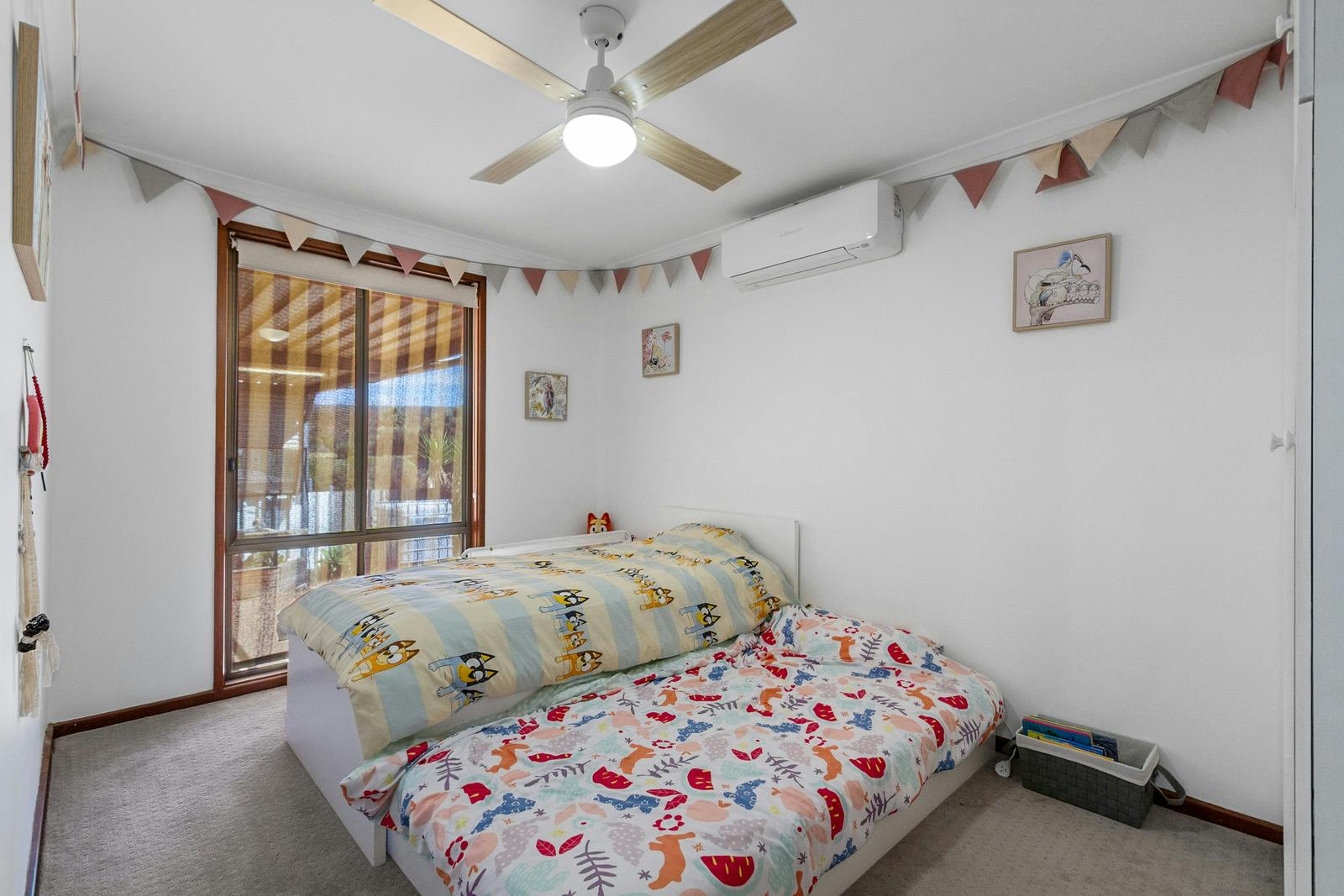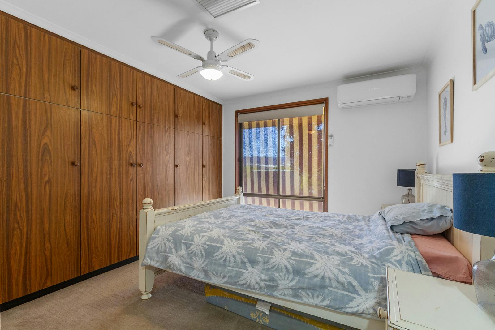 The rear wing of the home includes three bedrooms, all with built-in robes and ceiling fans, with two rooms also featuring individual split-system air conditioners. A well-sized family bathroom and a laundry with a second toilet complete the interior.