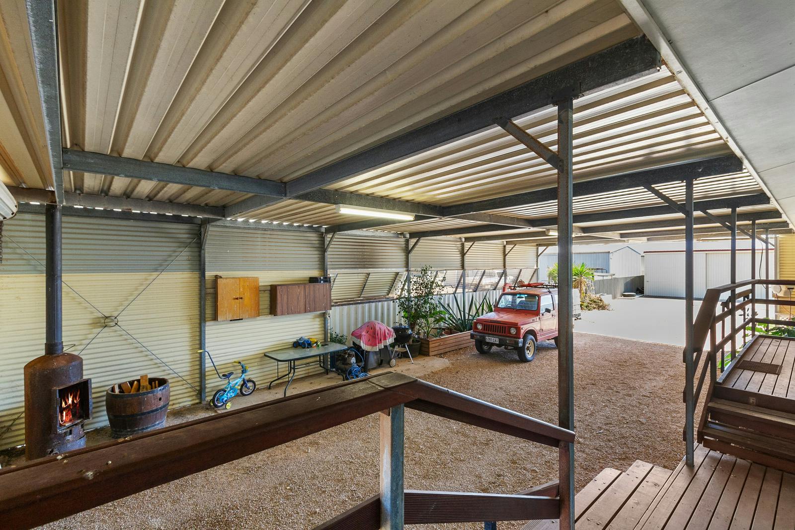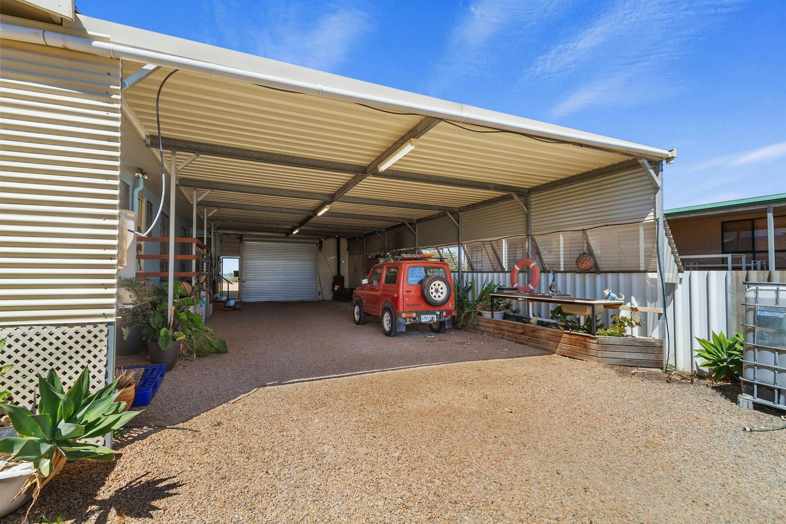 The attached carport flows through to a covered outdoor entertaining area, complete with a fish-cleaning sink, and leads to an impressive 9m x 8m garage with power, concrete flooring, an outdoor wash-down apron, and a mezzanine level for additional storage. Additional smaller shedding is also available for firewood.