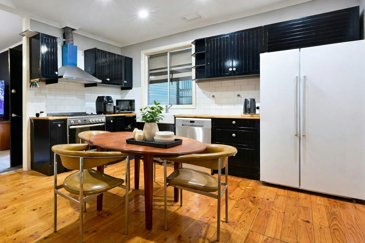Kitchen/meals featuring timber flooring and ceiling fan