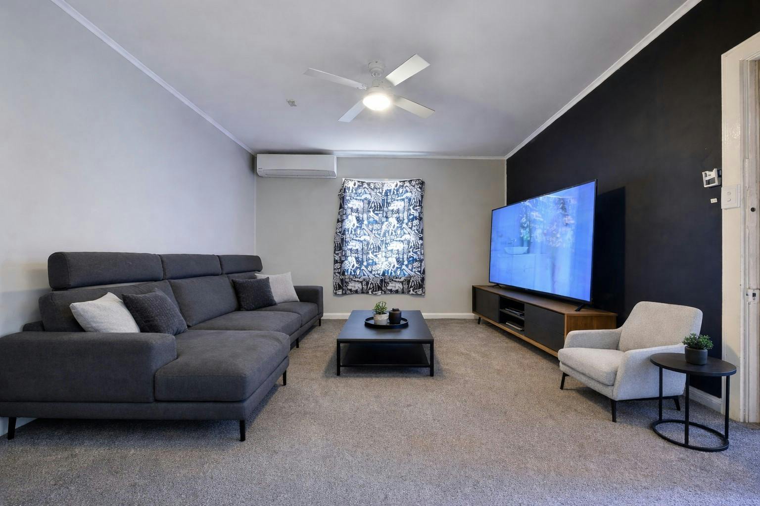 Entry to carpeted lounge with split system air-conditioning and ceiling fan