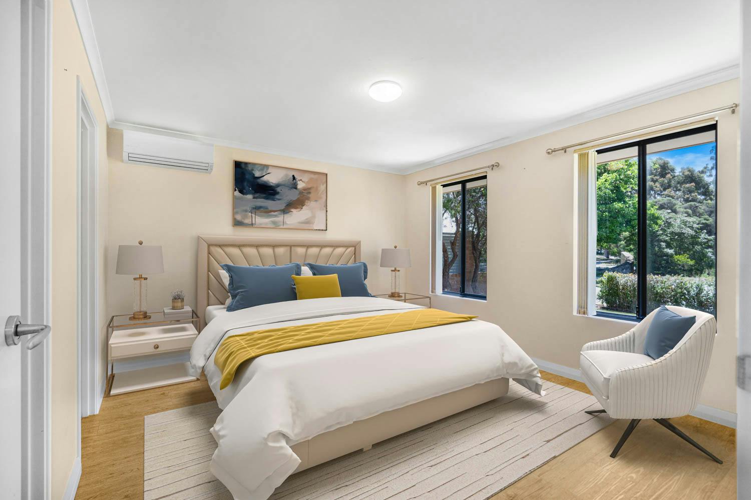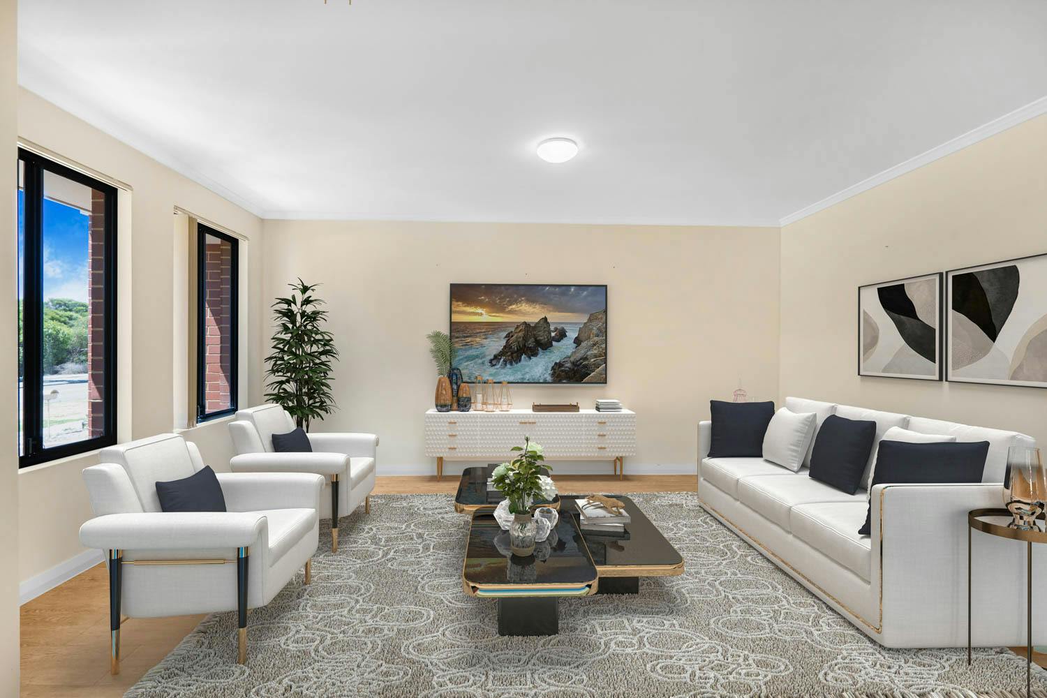 Directly facing the large parkland opposite, your street appeal is immediate, with your front garden tucked beyond a limestone wall and established hedging to enjoy that heightened standing, with easy upkeep synthetic lawn before the home, while your double remote garage sits to the side for secure vehicle parking. Your lounge awaits to the interior, with the timber vinyl flooring that extends throughout and a spacious design for relaxation, with your master suite positioned across the central hallway to enjoy those parkland views. An effective split system air conditioning unit ensures your well-being within, with a walk-in robe and an ensuite with a shower, lengthy vanity and WC.