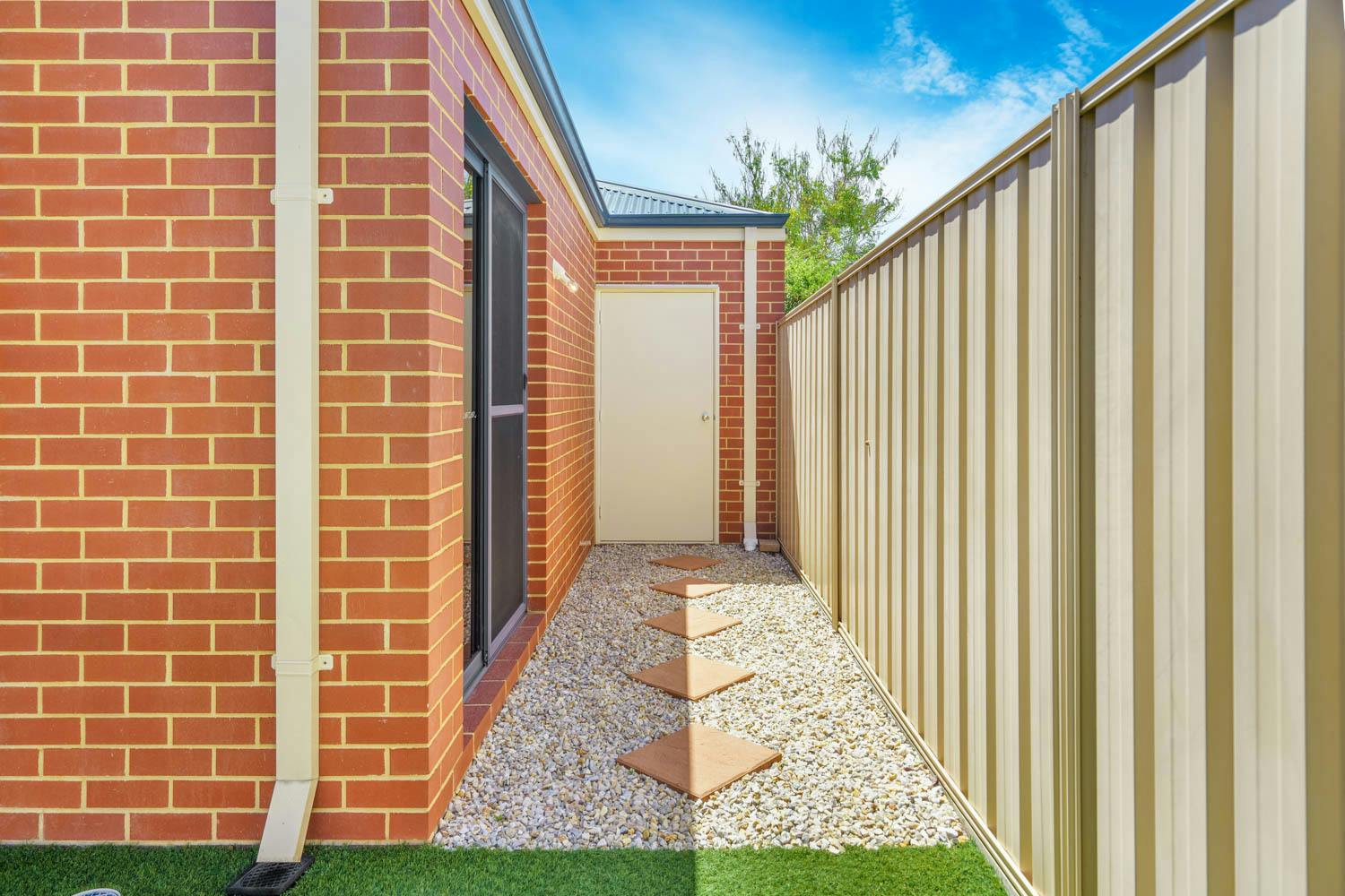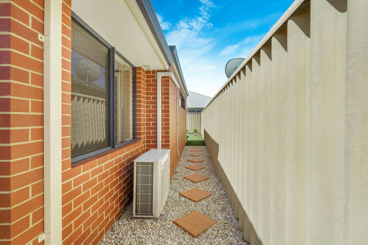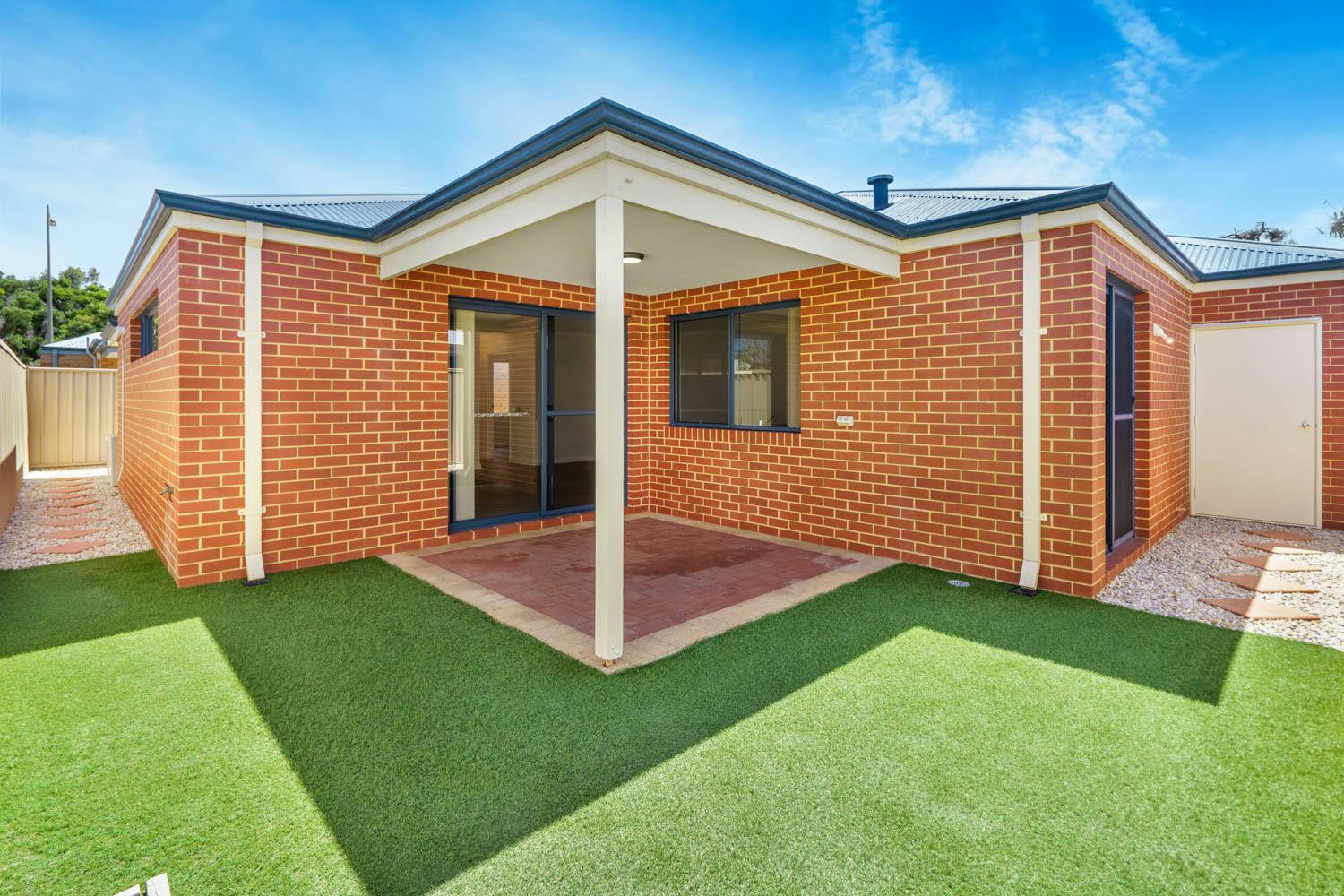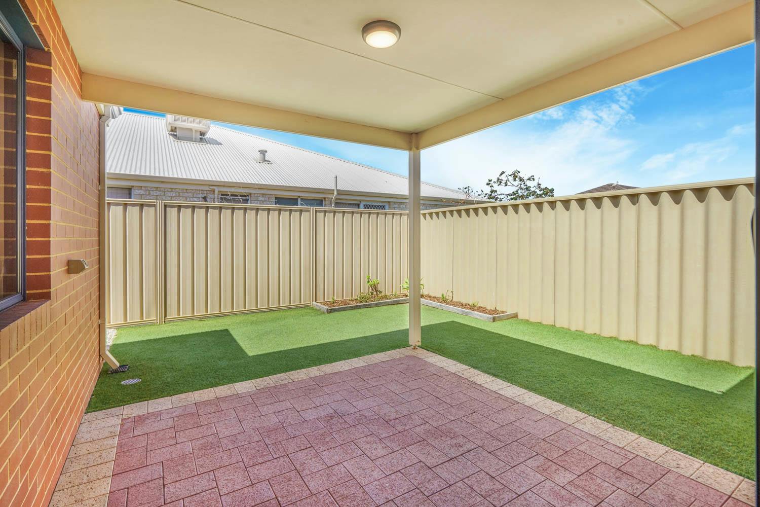 Bedrooms 2 and 3 are placed within their own section, and both benefit from built-in robes, with the main bathroom positioned between and equipped with a shower, bath and vanity, plus a separate WC. Your open plan living and dining space offers a substantial setting for relaxation or entertaining, with direct patio access for an indoor to outdoor flow, along with another spilt system air conditioning unit for comfort. The kitchen overlooks the space and is fully fitted, with a wraparound benchtop for breakfast bar seating, in-built stainless-steel appliances and a double door pantry, with under bench cabinetry and a designated fridge recess included. Furthermore, your sheltered patio is paved underfoot to offer an inviting area to relax, with more of that synthetic lawn across the backyard for minimal maintenance living.