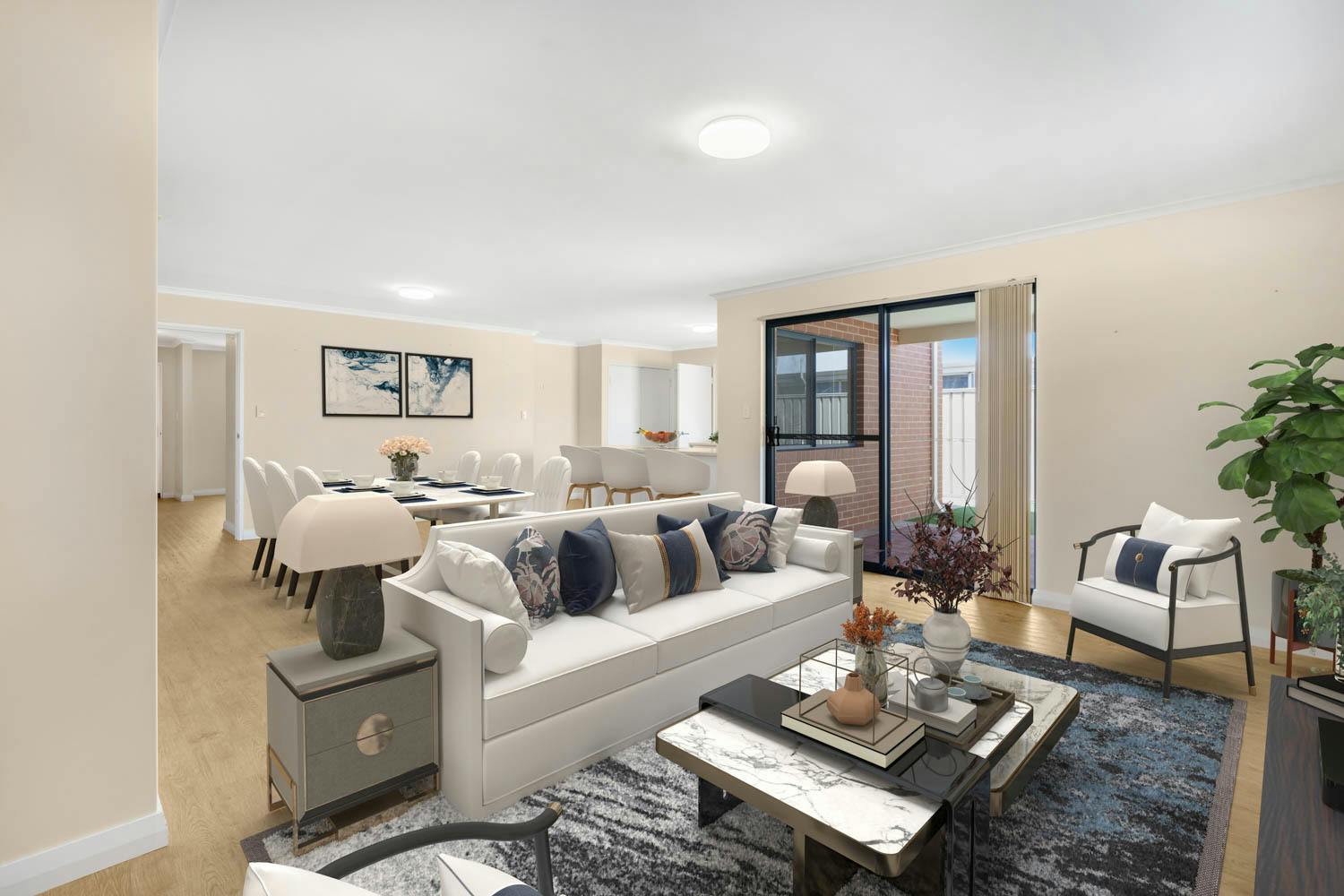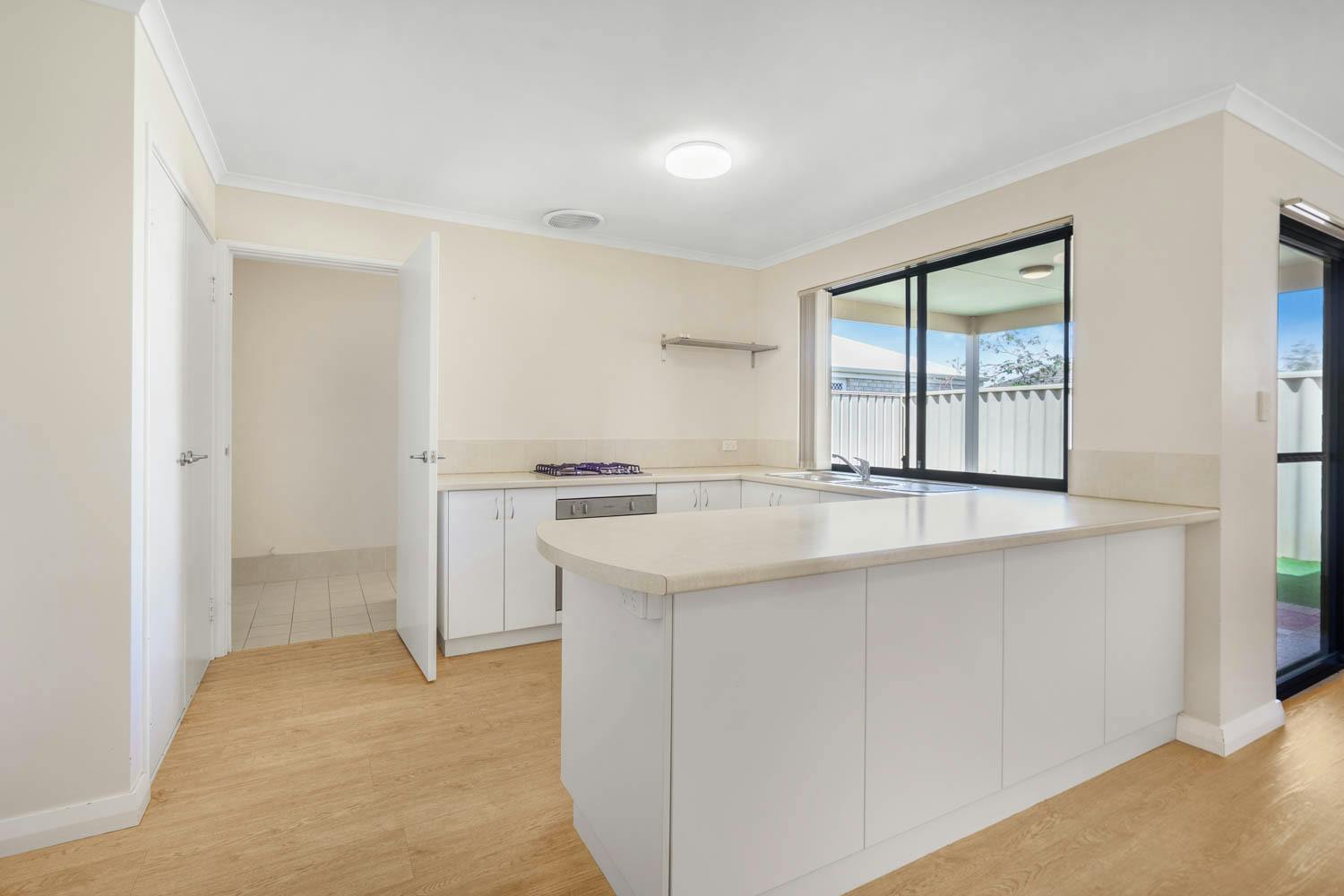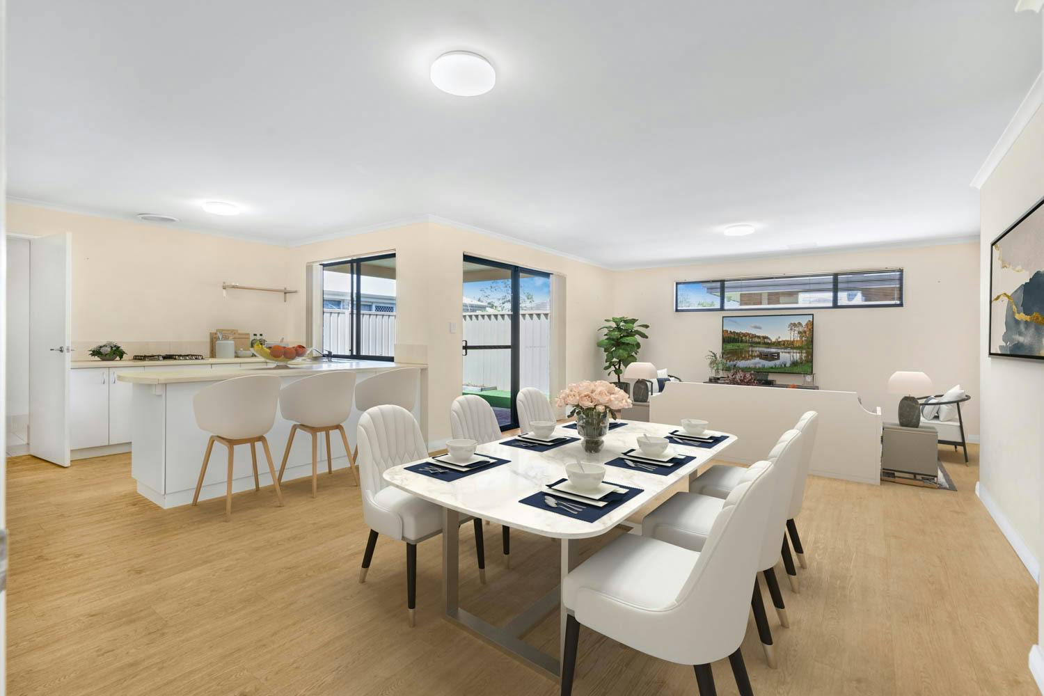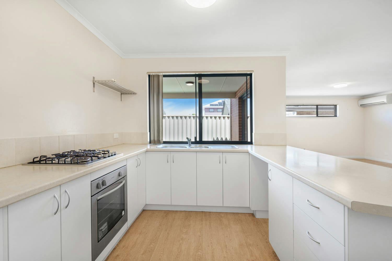 Bedrooms 2 and 3 are placed within their own section, and both benefit from built-in robes, with the main bathroom positioned between and equipped with a shower, bath and vanity, plus a separate WC. Your open plan living and dining space offers a substantial setting for relaxation or entertaining, with direct patio access for an indoor to outdoor flow, along with another spilt system air conditioning unit for comfort. The kitchen overlooks the space and is fully fitted, with a wraparound benchtop for breakfast bar seating, in-built stainless-steel appliances and a double door pantry, with under bench cabinetry and a designated fridge recess included. Furthermore, your sheltered patio is paved underfoot to offer an inviting area to relax, with more of that synthetic lawn across the backyard for minimal maintenance living.