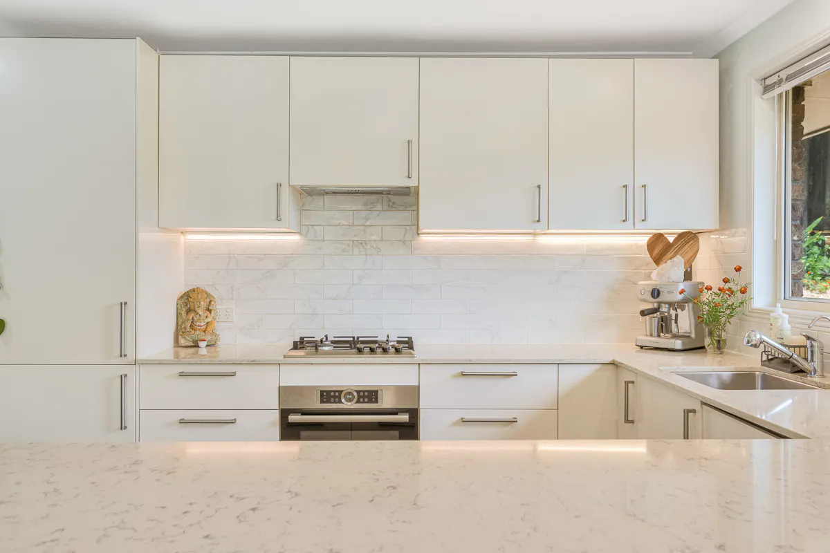 The kitchen is both stylish and practical, featuring waterfall stone benchtops, integrated dishwasher, gas cooktop, electric oven and generous storage, all overlooking the central living and dining zone. The home offers three bedrooms, including master retreat with ensuite, while the spacious main bathroom comfortably services the remainder of the home.