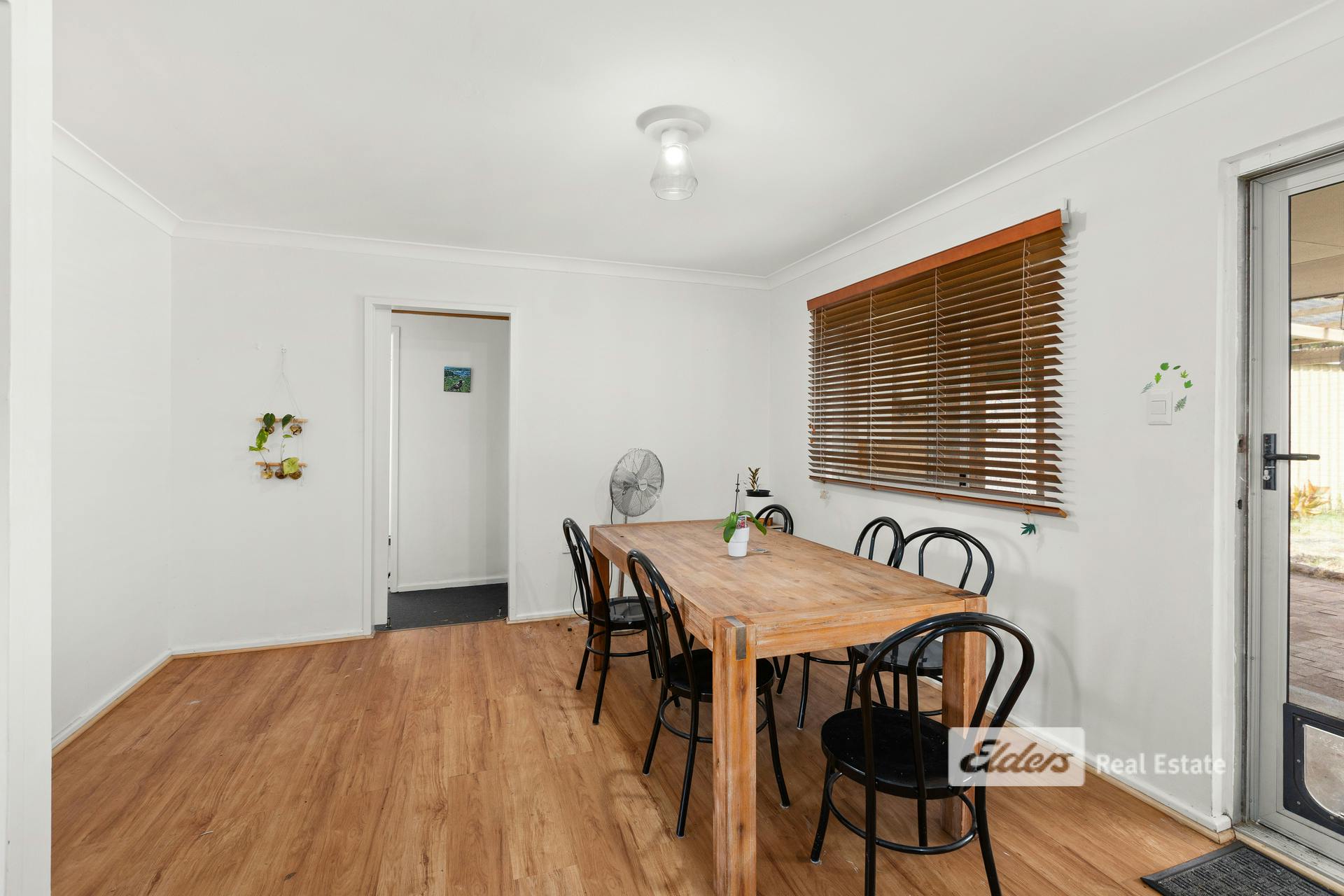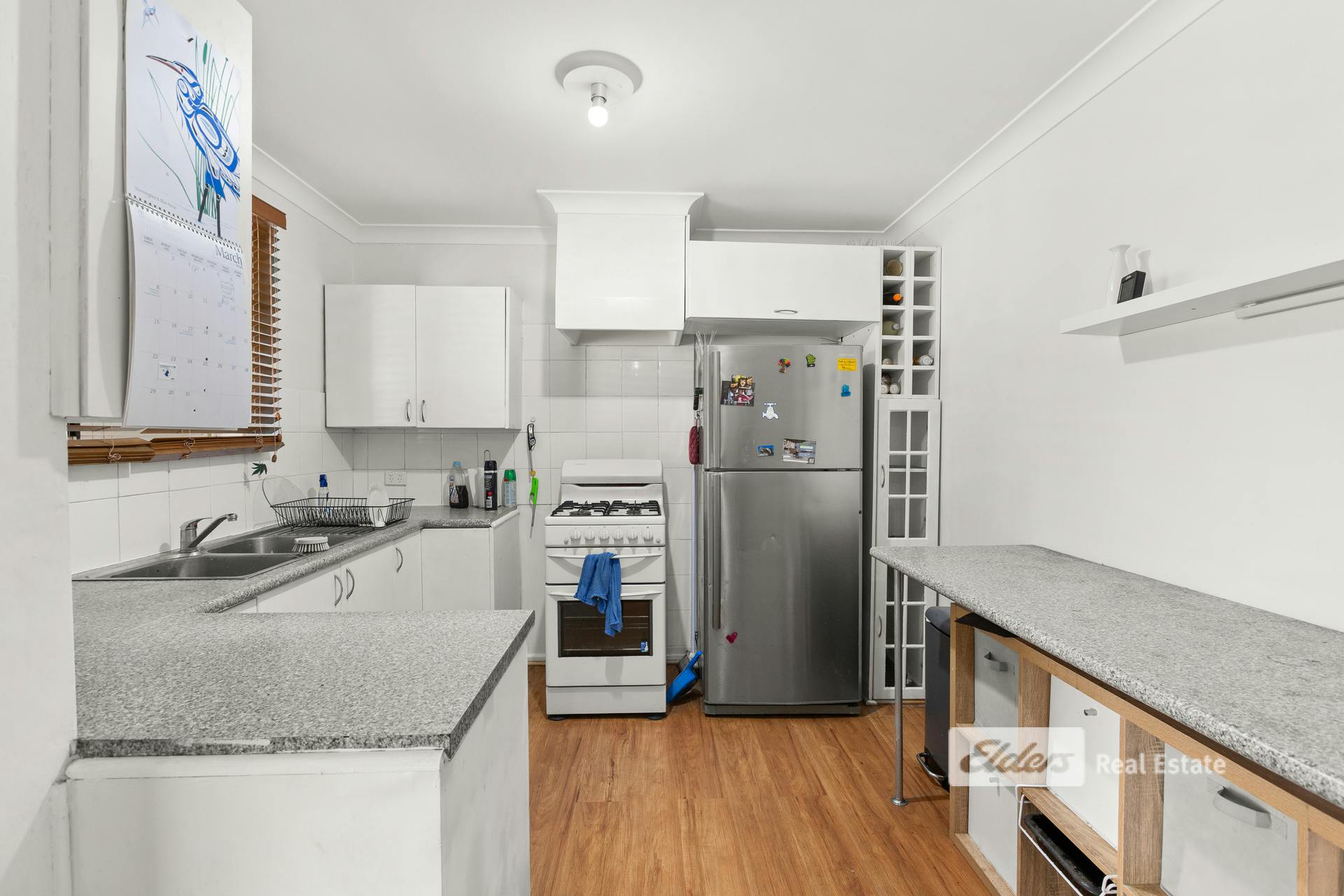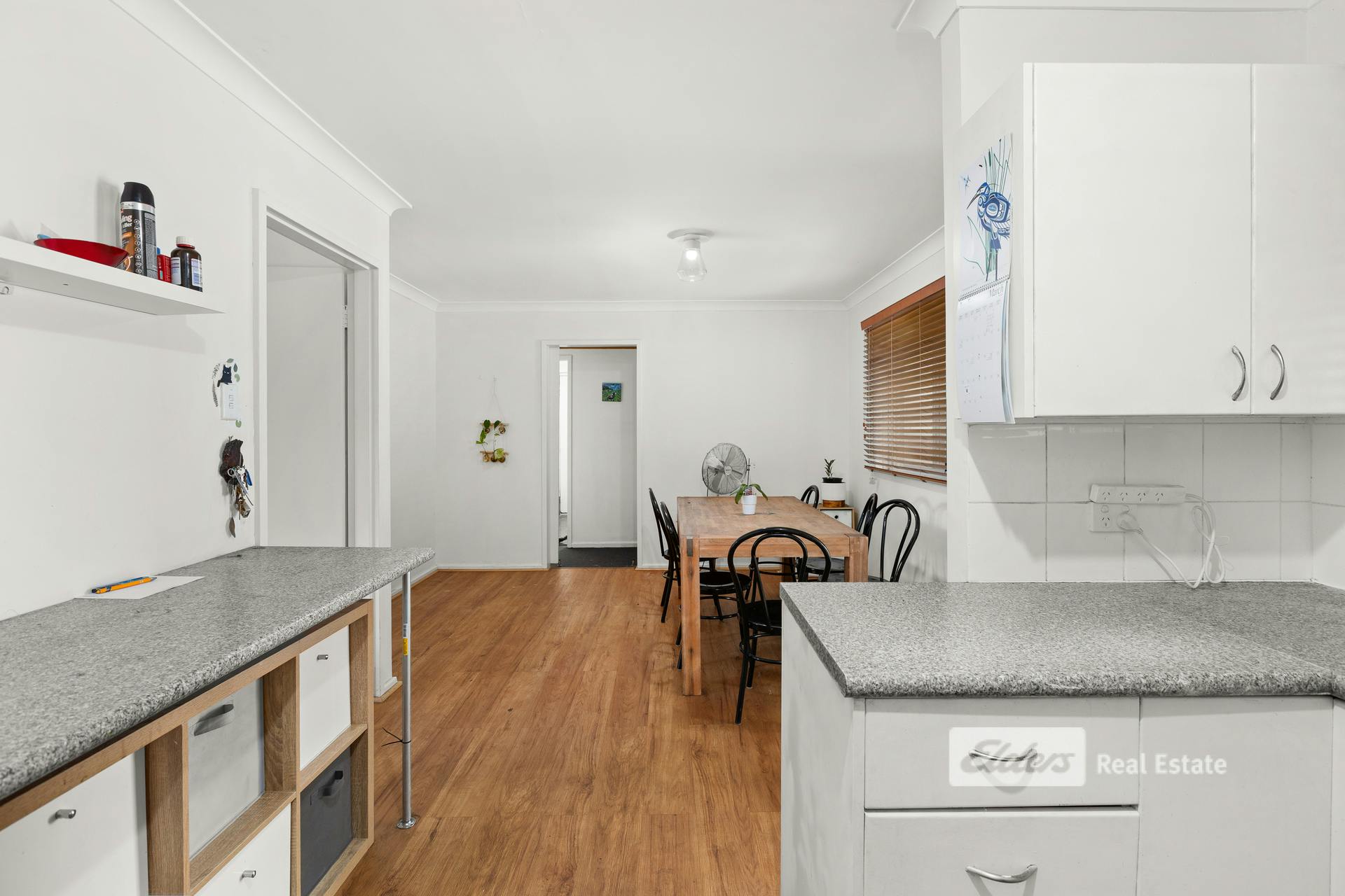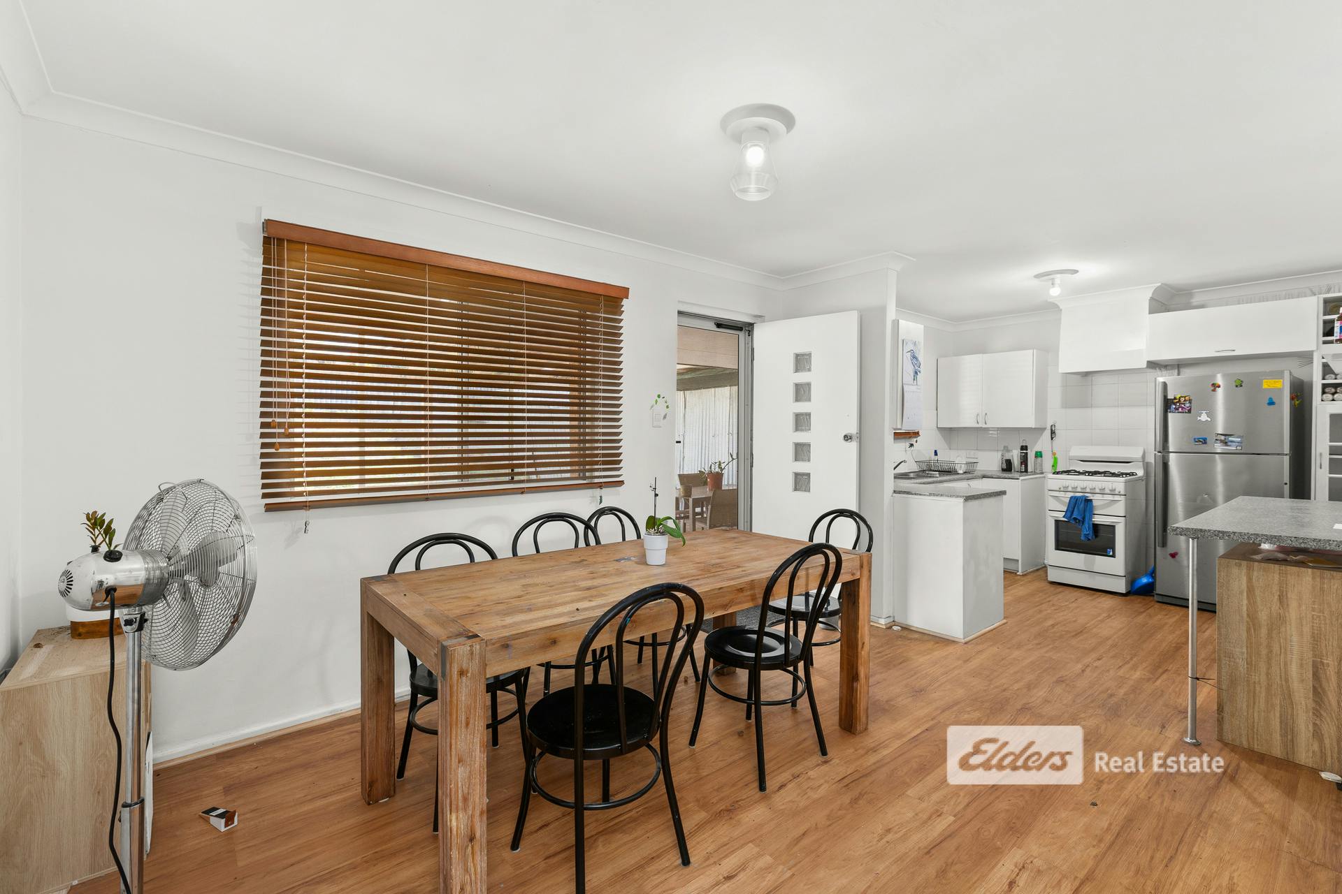 The functional kitchen provides ample storage, a gas cooktop, and a handy mini breakfast bar, flowing through to a generous dining area. Timber blinds and easy-care timber flooring add a warm and practical touch throughout.